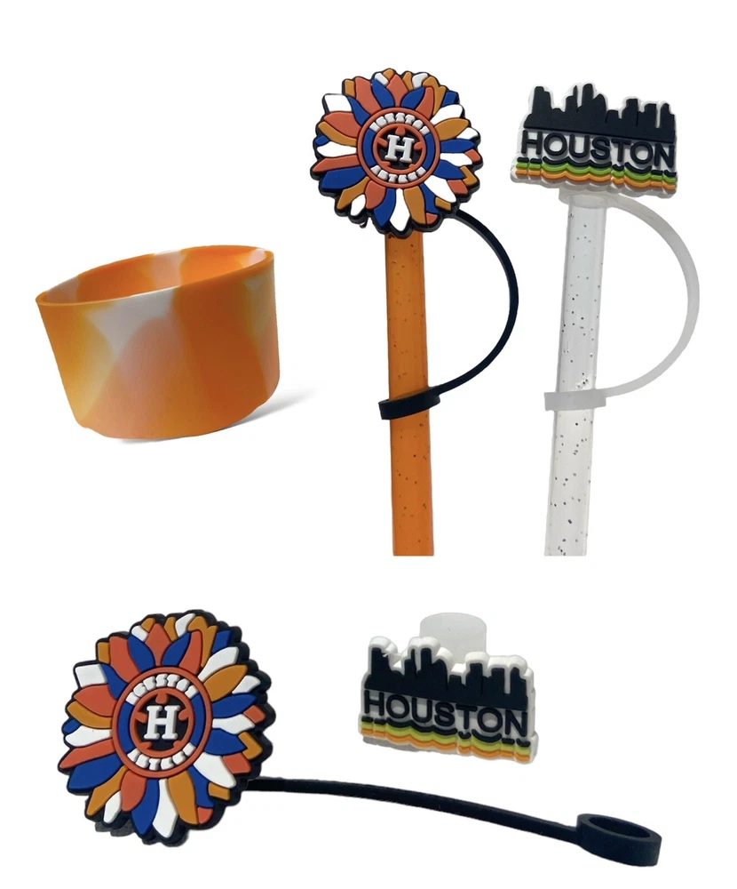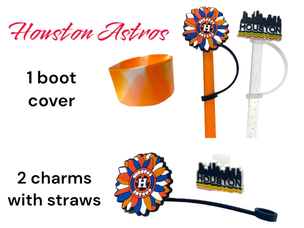 Houston Astros charm accessories set for Stanley tumbler 30 & 40 oz. 5 pieces set (2 charms with 2 FREE glitter translucent straws and 1 silicone boot cover). The dimensions are 0.3in diameter and 0.63in height. Perfect for 6-8 mm straws. * take your favorite tumbler with you and represent your sports team The Houston Astros with matching charm straw covers/boot cover accessories set and get the game going! ~1 flower power charm and 1 city line charm with 1 silicone boot cover. ~Houston Astros colored orange theme boot cover. See photos for guidance. *This item is not a licensed product. We do not claim ownership of any character or image used in our designs. Copyrights and/or trademarks of any character and/or image used belong to their respective owners and are not being sold. No Copyright Infringement Intended. * CHOKING HAZARD -- Small parts. Not for children under 3 yrs.