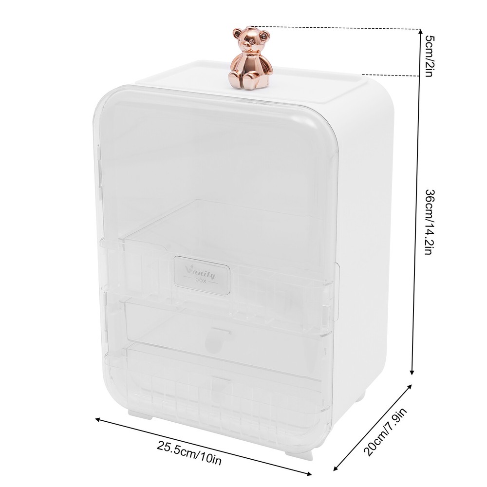 Adorable Makeup Organizer Cosmetic Storage Cabinet With Mirror & Cabinet Light Description In daily life, a clean and orderly space can make us feel relaxed and happy. When there are many disordered items, an organizer is essential. This large-capacity makeup storage box is made of PP and the bear adopts electroplating processes, so the whole item is durable and has a strong bearing capacity of 20lbs. It can help you store in order and bid farewell to the messy desktop. With it, the happiness of life will follow. Key Features Premium Material: High-quality PP makes this product strong and durable, so it can keep beautiful and practical without frequent replacement. Strong Bearing Capacity: The solid material and stable structure make this product bear about 20lbs of weight, so you can use it without worrying about collapse. Wide Space: The large size of 10*7.9*14.2 inch, three-tier design, multiple slots, and a wide and sunken top provide enough space for you to store various objects by category, thus creating a clean and tidy environment for you. Careful Design: The door with a magnet design facilitates the closing of the door and create a high sealing space to protect your items from dust and water. The LED light will not flicker and consume less energy, so it can protect your eyes, save you costs, and provide sufficient lighting in a dark environment. Beautiful Appearance: The timeless white, round lines and golden bear with electroplating technology make the whole product lovely and modern. Wherever it is placed, it will be a beautiful scenery. Enjoy Convenience Instantly: You can use the product directly without installing it, saving you time. The size of 10 * 7.9 * 14.2 inch and the weight of 5.07lbs make it easy to place and move anywhere. Effortless Cleaning: The smooth surface and removable drawers allow you to easily remove dust and residues with a towel and water. Ideal Gift: With good performance, this product can be used as a holiday or housewarming gift for family, friends, and lovers so that they can enjoy a more convenient life. High Performance-price Ratio: The combination of a makeup storage box, mirror, LED light, and USB charging cable can meet your needs at one time, so you don't need to buy them separately. Details Round Corners: Compared with traditional square corners, an arc design can better care for your skin. Anti-slip Legs: Four legs can provide additional support to better maintain the stability of the product, and also raise the bottom to avoid moisture. Elevated Edge: The elevated edges of drawers can effectively prevent items from falling and save your costs. Application This product is suitable for storing skin care products with a height of less than 7.87inch. It can be widely used in living rooms, bedrooms, bathrooms, apartments, and university dormitories to store cosmetics, lotion, skin creams, nail polish, makeup brushes, lipsticks, facial masks, combs, and other items. Specification Material: PP Color: White, Clear Surface Treatment of Bear: Electroplating Style: Modern Shape: Rectangular Number of Items: 1 Number of Tiers: 3 Assembly Required: No Mount Type: Countertop Usage: Cosmetic, Makeup Organizer Bearing Capacity: About 9.07kg/20lbs Light Source: LED Light Color: White Efficiency: E Height of Bear: 5cm/2inch Product Size: 25.5*20*36cm/10*7.9*14.2 inch Suitable Bottle Height: Within 20cm/7.87inch Package Included 1*Makeup Storage Box 1* Mirror 1* USB Charging Cable Other Accessories for Use Notes 1. Please note that our package only includes one storage box, not cosmetics. 2. Please do not put the product near the fire source to avoid damage and danger. 3. Please allow the slight color difference caused by the shooting light and 1-3cm error due to manual measurement, and make sure you do not mind before ordering. Payment Delivery details Terms of sales About us Contact us Payment We accept ebay payment 。 Fees such as import duties, taxes are not included in the item price or shipping costs. These charges are the buyer's responsibility. Delivery details Shipping: 2-9 working days to: USA Terms of sales We maintain high standards of excellence and strive for hundred percent customer satisfaction. Feedback is very important to us. We hope that you contact us immediately before you give neutral or negative feedback, so that we can address your concerns. It is impossible to address issues if we do not know about them! About us Your satis faction is our ultimate goal. We work hard to earn your trust and future business. Our certified technicians have tested each item before shipping. The unit comes with 1 year limited warranty on all manufacturing defects. a) If you receive a defective item, you may return it or ask for a discount. Please contact us within 14 days after you receive the package. b) What you returned must be intact and in its original packaging as re? u. Customer is responsible for shipping costs of the returned item. c) We will cover the cost of shipping back t with the shipping rate indicated in the registration page. We will send you a new unit or refund the full payment you paid. Thank you. Contact us Business Hour Business Hour: Monday To Friday: 8:30 AM to 5:00 PM (Beijing China time) Due to time zones, our reply to your questions may not be immediately. But within above working time, we will reply your email within 24 hours. If it's non-workdays, please kindly be patient and wait till Monday. Please contact us with ebay message. Please feel free to contact us if you have any questions. Monday To Friday: 8:30 AM to 5:00 PM (Beijing China time) Due to time zones, our reply to your questions may not be immediately. But within above working time, we will reply your email within 24 hours. If it's non-workdays, please kindly be patient and wait till Monday. Please contact us with ebay message. Please feel free to contact us if you have any questions. Note Cannot ship to Alaska, Hawaii Brand Unbranded Type Makeup Storage Box Color 