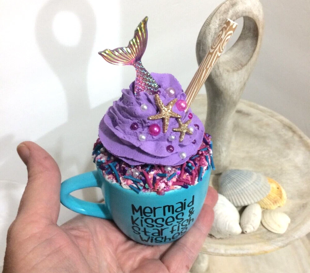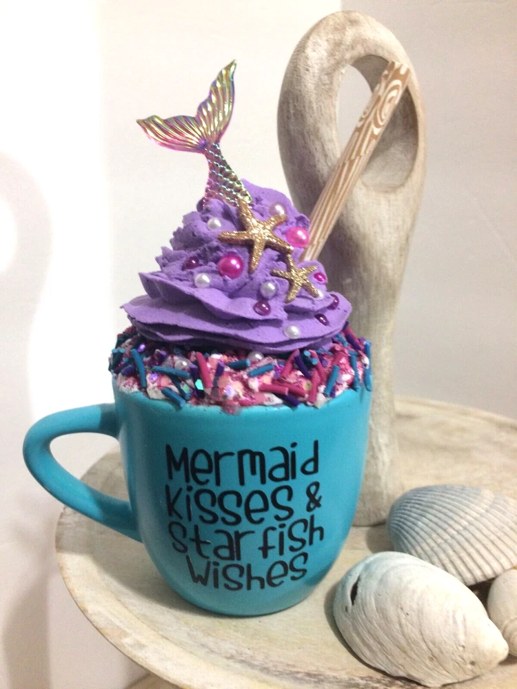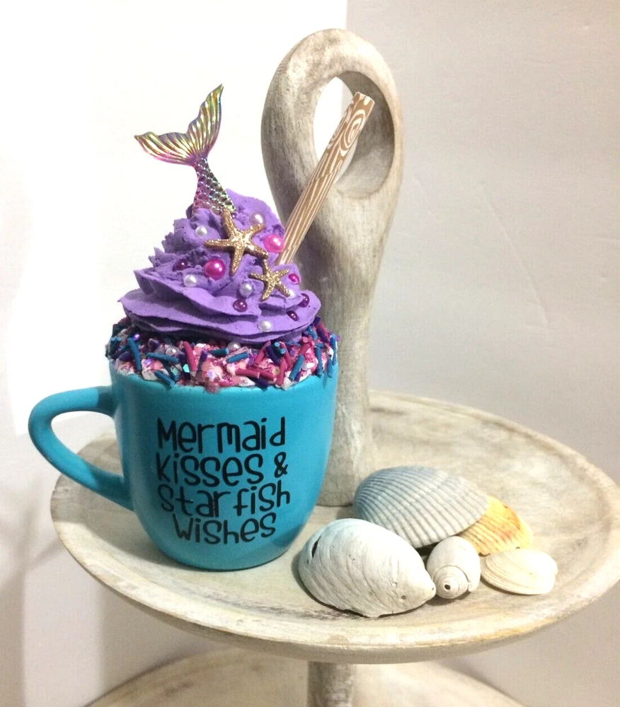 New Handmade Mermaid Kisses & Starfish Wishes Beach Themed Mini Mug with a handmade fake whipped cream . The mug has an embellishment of Glittery Starfish, Sprinkles and Mermaid Tail. Mini Mug is Ceramic and has the words Mermaid Kisses & Starfish Wishes ... Super Cute !!! Perfect of your Coffee Lover Decoration....It can sit on your tiered tray, any shelf, or on your counter by your espresso machine. Do not eat or clean the whipped cream topper; it’s for decoration only. This is not a mug topper - Its a all in one piece. This list is for 1 mug decor