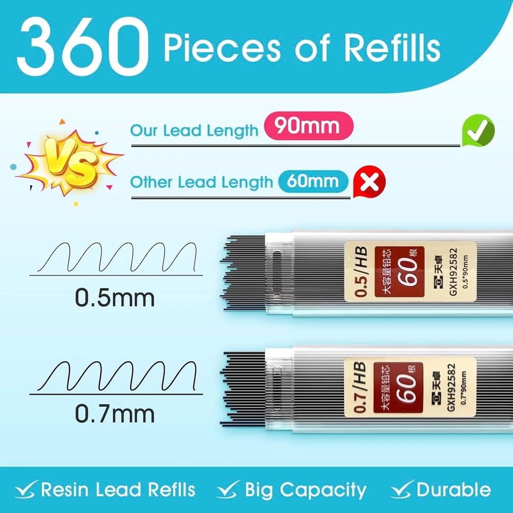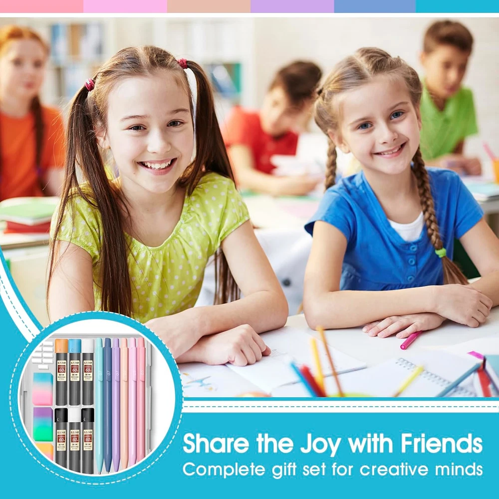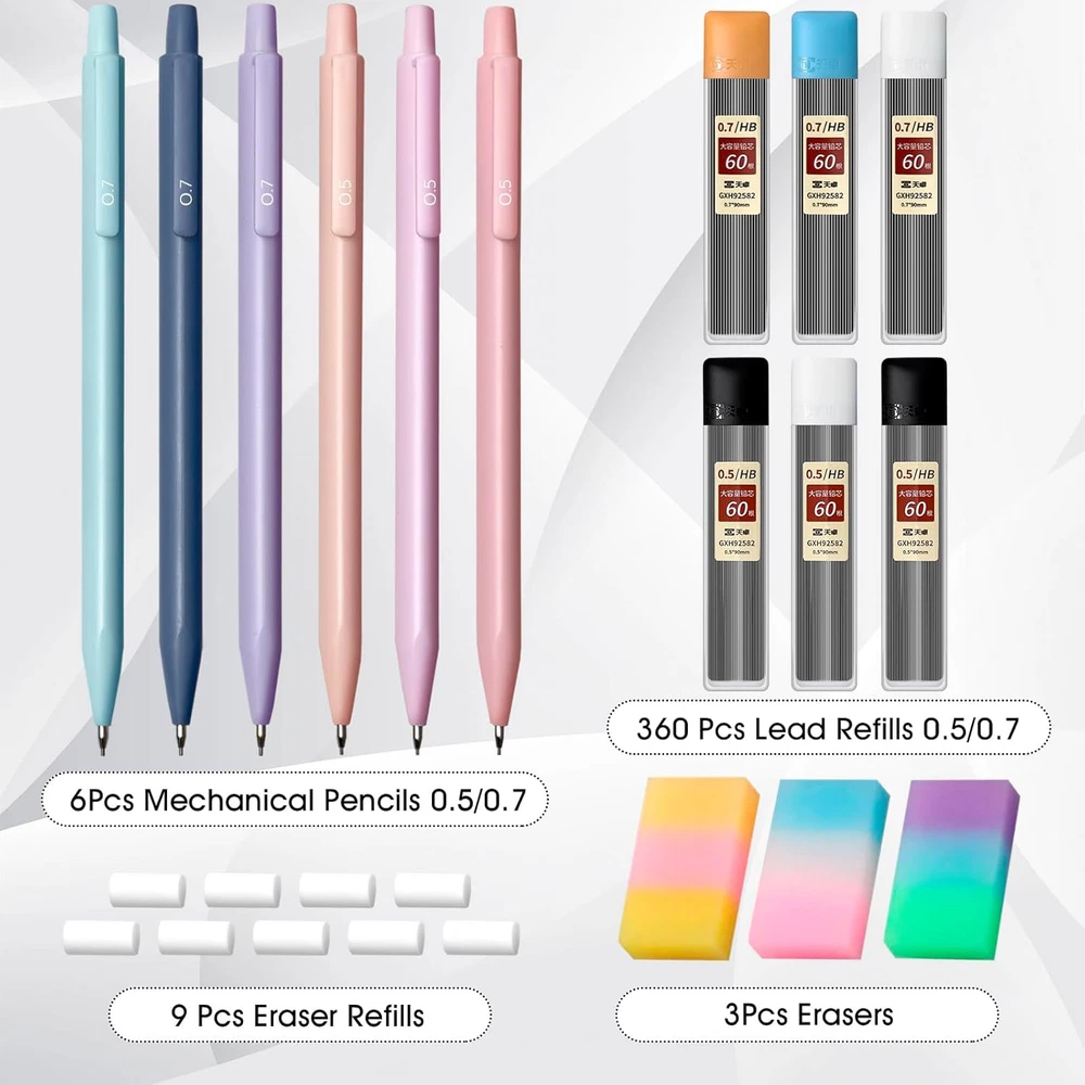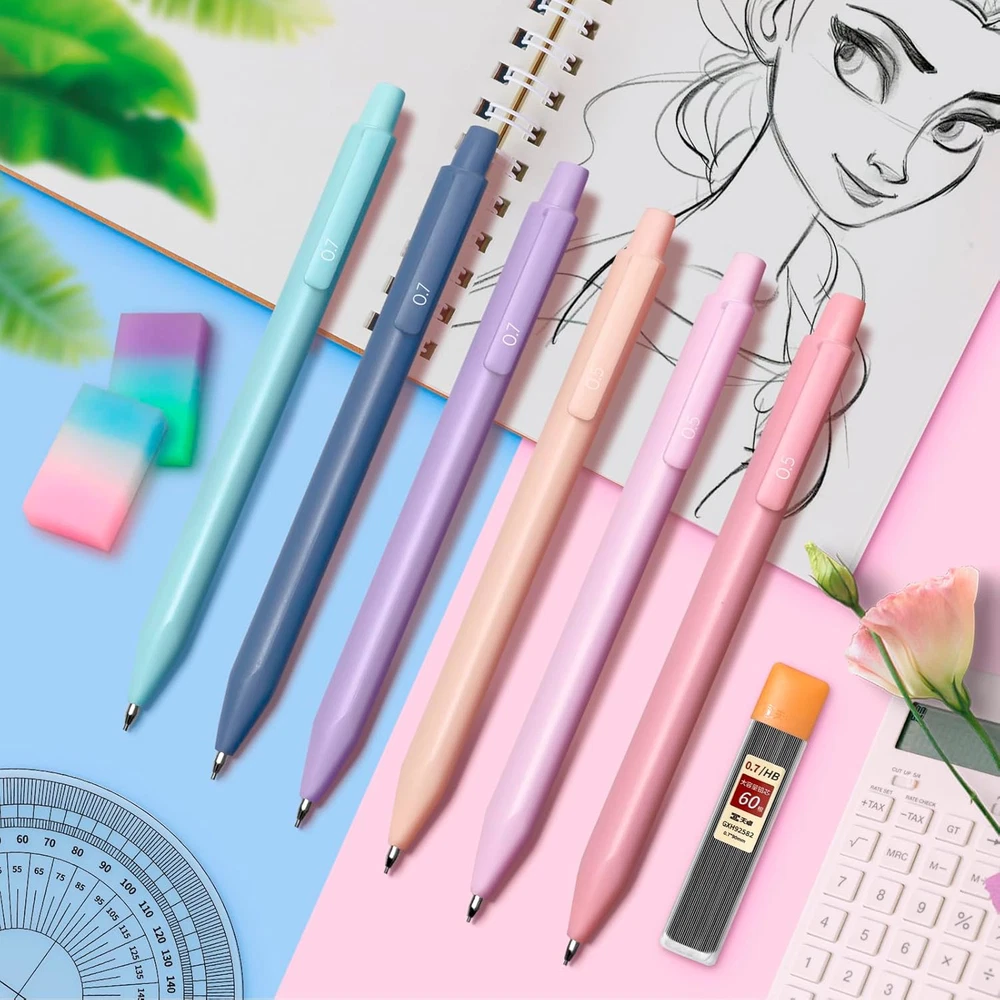 Cute Pastel Mechanical Pencil Set - 6PCS Mechanical Pencils 0.5 & 0.7mm, 6 Tubes Exquisite Set: This perfect mechanical pencil set includes 3 pcs of 0.5mm mechanical pencils, 3 pcs of 0.7mm mechanical pencils, 3 tubes of 0.5mm lead refills, 3 tubes of 0.7mm lead refills, 9pcs cap eraser refills and 3 erasers. Triangular Grip: The ergonomic triangular grip design ensures a comfortable hold and prevents slipping. Combined with a smooth barrel and lightweight construction, it provides a relaxing and efficient writing experience. Dark & Smooth Writing: Pre-loaded with strong, smooth lead that never needs sharpening. Produces clear, dark lines and includes erasers that erase cleanly without leaving traces. Two Nib Sizes: Includes 0.5mm and 0.7mm nibs, allowing for versatile use. These cute mechanical pencils are ideal for writing, painting, drafting, drawing, sketching, and more. Lovely Candy Colors: This pink mechanical pencil set is specially designed for girls and makes an ideal gift for friends, classmates, and family. For any concerns, please contact us for a prompt response within 24 hours.