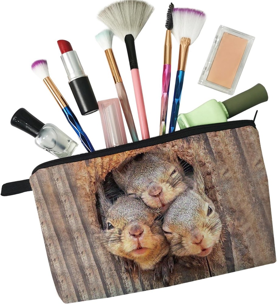 Squirrel Cosmetic Bag for Women Cute Small Makeup Bag for Purse Travel Toiletry Zipper Pouch for Girls Gift for Sisters Squirrel Makeup Bag for Her Product Details Product Dimensions: 8.65 x 2 x 5.35 inches Item Weight: 0.634 ounces Department: Unisex Manufacturer: Livel lhood Country of Origin: China Item model number: 275-3 1.Durable Material: The Squirrel cosmetic bag is made from soft Polyester with a metal zipper. It's soft, smooth, hardy and durable, and has a high quality. It's easy to clean with a lightweight which means easy to carry. 2.Fashion Design: The Squirrel cosmetic bag has a clear and vibrant design, double-sided printing. There are different kinds of cute, lovely, funny and beautiful patterns to choose. The makeup bag fits both the popular aesthetic and unique personalities. 3.Good Size:8.65 in* 2 in* 5.35 in. 25 grams weight. The cosmetic bag is easy to carry make-up tools like lipsticks, eye shadows, brushes, sunscreens, etc. The makeup bag is also able to carry stationery, medicines, coins, cards and other personal effects. 4.Fits: Makeup bags and gifts for women, girls, animal lovers, friends, teenagers, family members on Christmas, New Year, Mother's Day, Thanksgiving, Valentine's Day and other holidays as well as birthdays and memorial days. Receiving a gift like this bag will make her happy. This is also a good way to express love and show her or their personalities. 5.Applicable Occasion: Ideal for travel, vacations, business trips, gyms, camping and other outdoor activities. These cosmetic bags can be used as makeup bags, coin purses, cellphone pouches, medicine storage bags and so on.