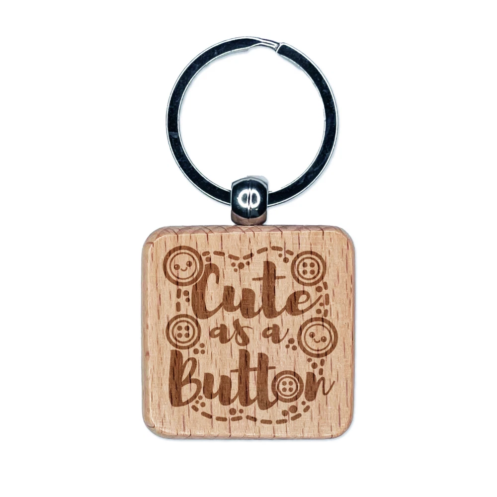 Cute as a Button Engraved Wood Square Keychain Tag Charm