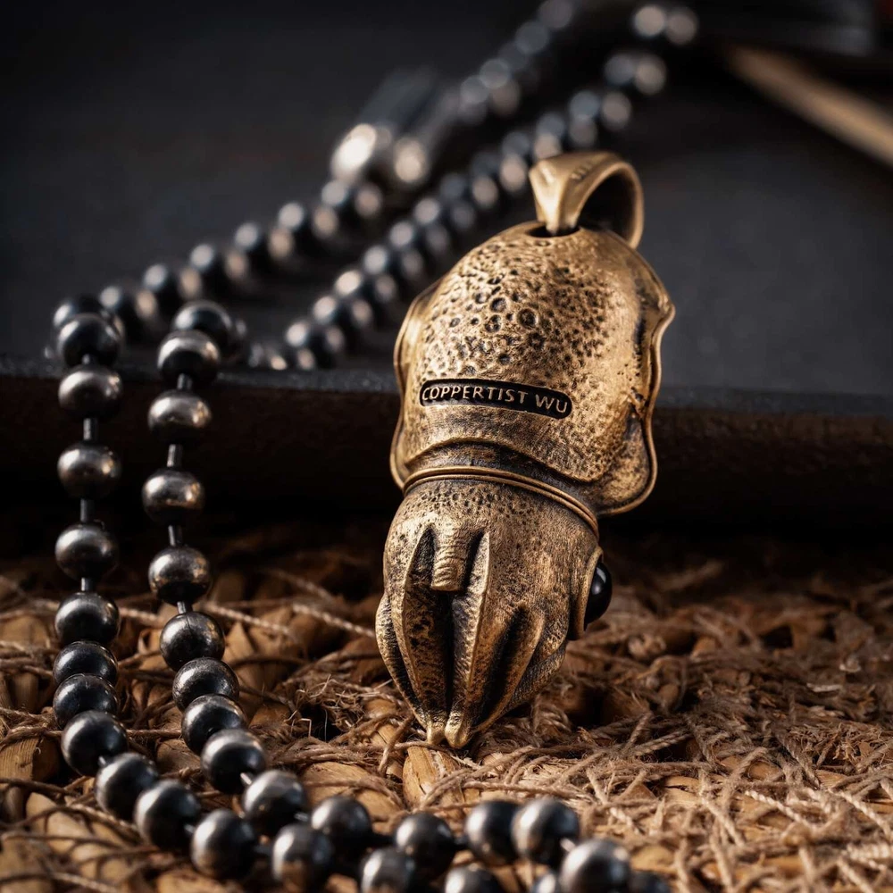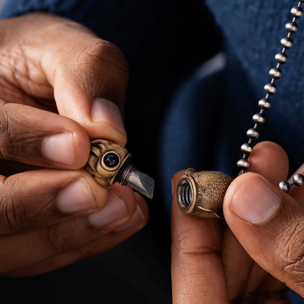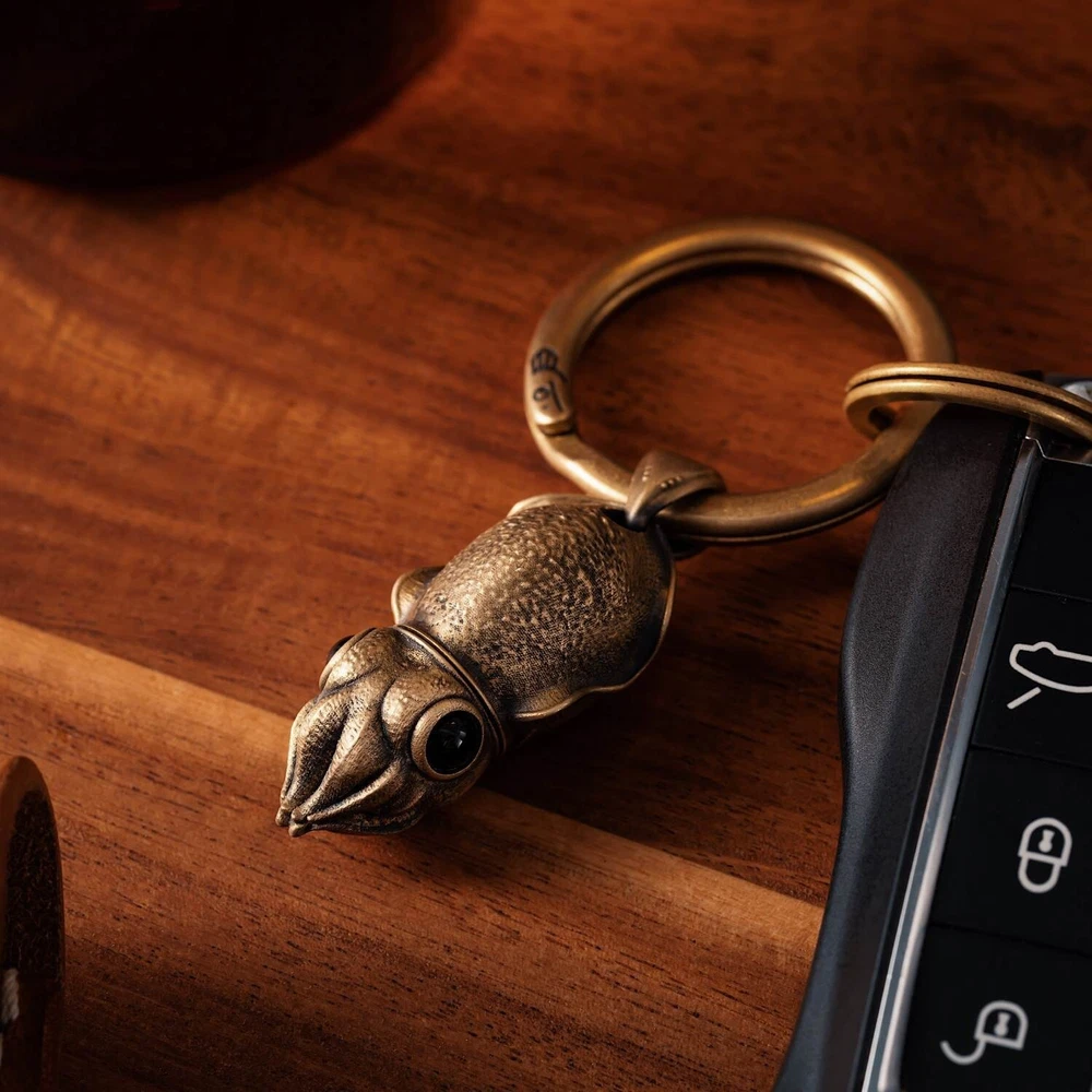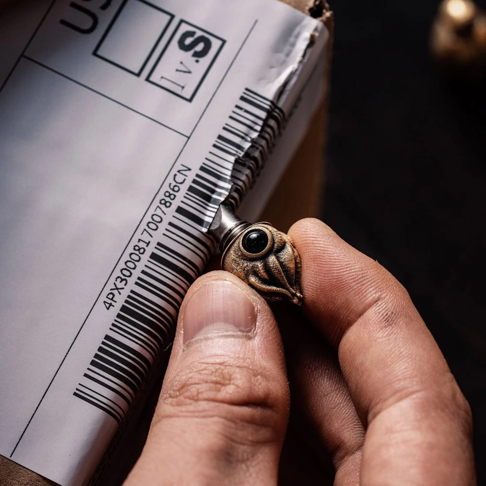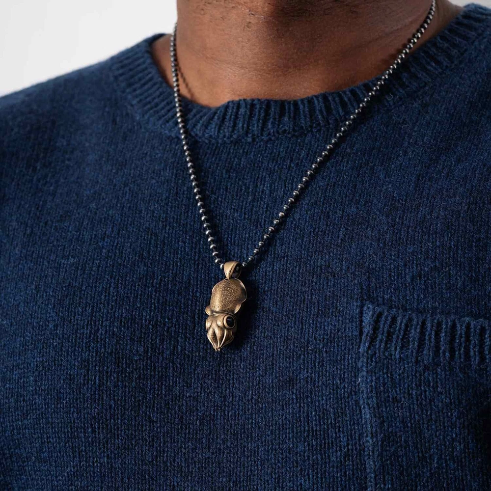 Parameter Style: Pendant Function: Box Opener Material Body: Brass Eyes: Black Agate Box Opener: TC4 Titanium Alloy Size Height: 1.41"/ 35.95mm Width: 0.67" / 17.14mm Thin: 0.57" / 14.7mm Weight: 0.53oz / 15.3g About The Cuttlefish Box Opener Pendant is not just a charming accessory inspired by the adorable ocean cuttlefish; it's a multifunctional piece with a surprising twist. Concealed within the cuttlefish's head is a discreet titanium alloy box opener, making this pendant more than meets the eye. It seamlessly combines aesthetic appeal with practical functionality, allowing you to carry a portable knife wherever you go. The pendant's box opener is precision-cut from titanium alloy using CNC technology, ensuring a lightweight, durable, and premium tool for everyday tasks. The compact size and ease of carrying make it versatile—wear it as a necklace, attach it to a keychain, or hang it on a backpack. The design choice of placing the knife in the cuttlefish's head allows for easy detachment when needed, ensuring convenience in daily use. Crafting this pendant involves intricate details, especially in inlaying CNC-cut titanium alloy into cast products—a process demanding high precision. The pendant is 3D wax sprayed directly for casting, ensuring a perfect fit between the box opener and the cuttlefish body. The absence of molds in casting enhances precision, with clearly visible textures on the back of the cuttlefish. To add a lifelike touch, the cuttlefish's eyes are meticulously crafted from black agate. Whether you're opening packages, cutting paper, or simply flaunting an exquisite piece of jewelry, our Cuttlefish Box Opener Pendant exemplifies craftsmanship at its finest, marrying style with practicality in a uniquely charming way.
