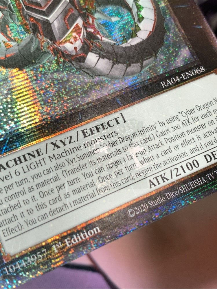 Defense/Toughness:1600Creature/Monster Type:MachineManufacturer:KonamiGame:Yu-Gi-Oh! TCGCard Size:JapaneseCard Type:XyzMaterial:Card StockVintage:NoCard Number:RA04-EN068Features:1st Edition, Alternative ArtSet:Quarter Century StampedeYear Manufactured:2025Rarity:Secret RareCard Name:Cyber Dragon InfinityAttack/Power:2100Autographed:NoLanguage:EnglishCountry/Region of Manufacture:United States