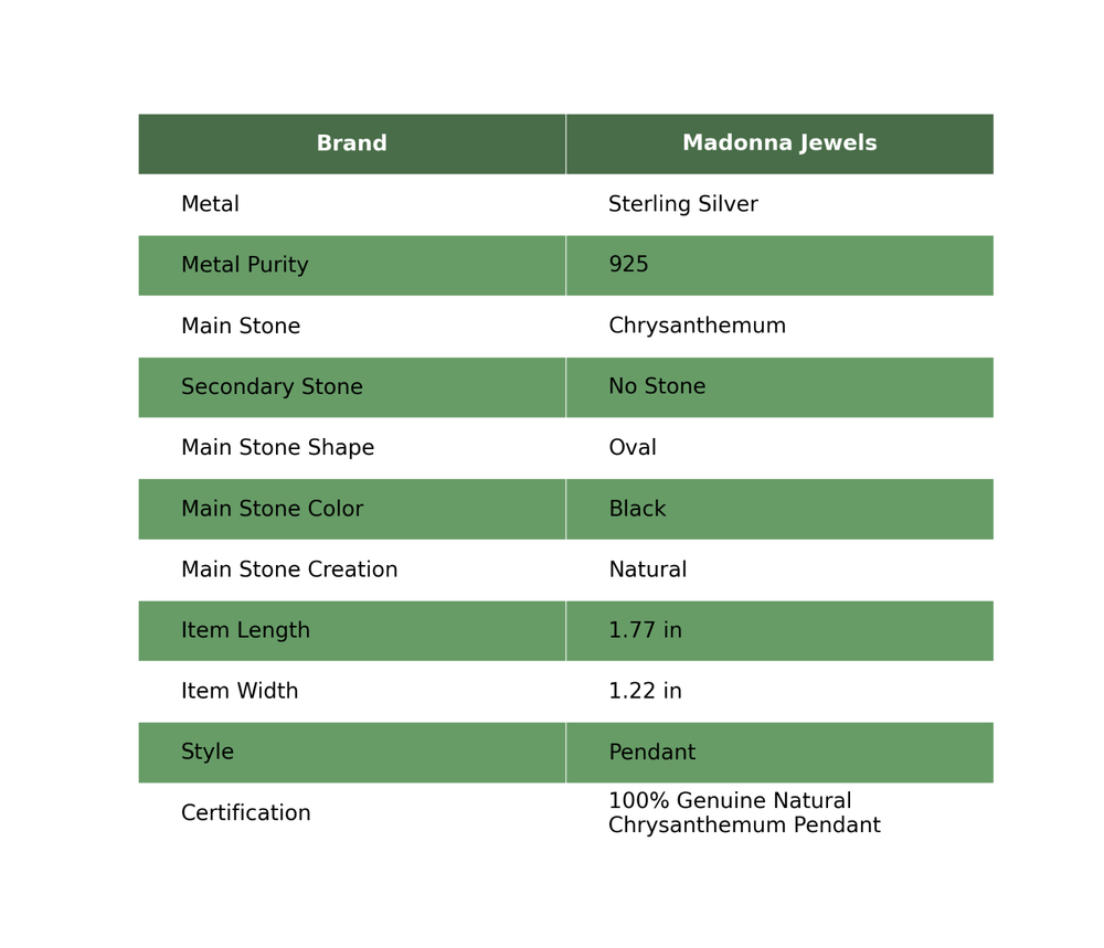 Welcome to Madonna Jewels Cyber Monday Deal 925 Sterling Silver Chrysanthemum Stone Trendy Pendant Jewelry Handmade Pendant, Sterling Silver Pendant, Chrysanthemum Pendant, Handcrafted Pendant SKU : BP-7361 Gemstone : Chrysanthemum Stone Shape : Oval Metal Purity : 925 Sterling Silver Length : 45 Millimeters Width : 31 Millimeters Silver Jewelry is a popular choice for many people due to its unique properties and numerous benefits. Here are some of the key properties and benefits of wearing silver jewelry: Properties: Durability: Silver is a durable metal that can withstand regular wear and tear. Malleability: Silver is highly malleable, which means it can be easily shaped and molded into various designs. Conductivity: Silver is an excellent conductor of heat and electricity. Anti-bacterial: Silver has natural anti-bacterial properties, which can help prevent the growth of harmful bacteria. Benefits: Aesthetic appeal: Silver jewelry is known for its beauty and versatility, and can be worn with a variety of outfits and styles. Hypoallergenic: Silver is generally hypoallergenic, which means it is unlikely to cause an allergic reaction in most people. Healing properties: Some people believe that wearing silver jewelry can help with various physical and emotional conditions, such as arthritis, anxiety, and depression. Spiritual significance: Silver has been used in various cultures for its spiritual and symbolic significance, and wearing silver jewelry can help to connect with these traditions. Investment value: Silver is a precious metal that retains its value over time, and investing in silver jewelry can be a smart financial decision. Overall, silver jewelry offers a unique combination of beauty, durability, and benefits, making it a popular choice for people around the world. For Mother's Day Gift For Father's Day Gift For Promise For Valentine' Day For Halloween Party For Christmas Day Gift For New Year Party For Mom For Her If you can't find the information you need or need some advice for your design? Feel free to contact us. We are fast to reply :) All our work is made by hand with Love and Care in our workshop Thank you so much for visiting and hope you enjoy shopping with us Madonna Jewels is dedicated to providing customers with high-quality sterling silver jewelry. As a manufacturer of handmade jewelry, we offer an extensive range of silver gemstone jewelry that demonstrates our exceptional craftsmanship. We are skilled in adorning gemstones to complement any style, and we give you the freedom to design your own jewelry collection with dazzling, natural, and genuine gemstones. Our talented craftsmen carefully handcraft each jewelry piece, ensuring that it is unique and made with authentic gemstones. The jewelry item you see on our website is precisely the same one you will receive.