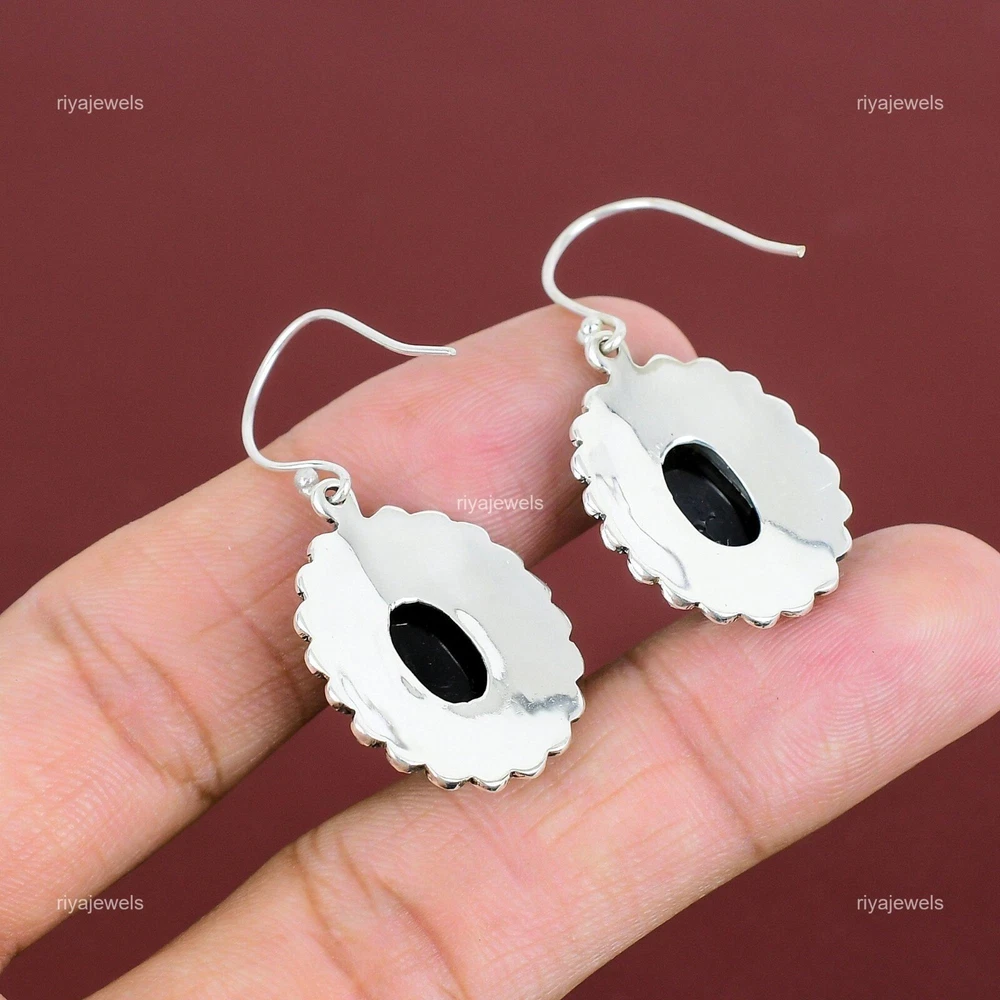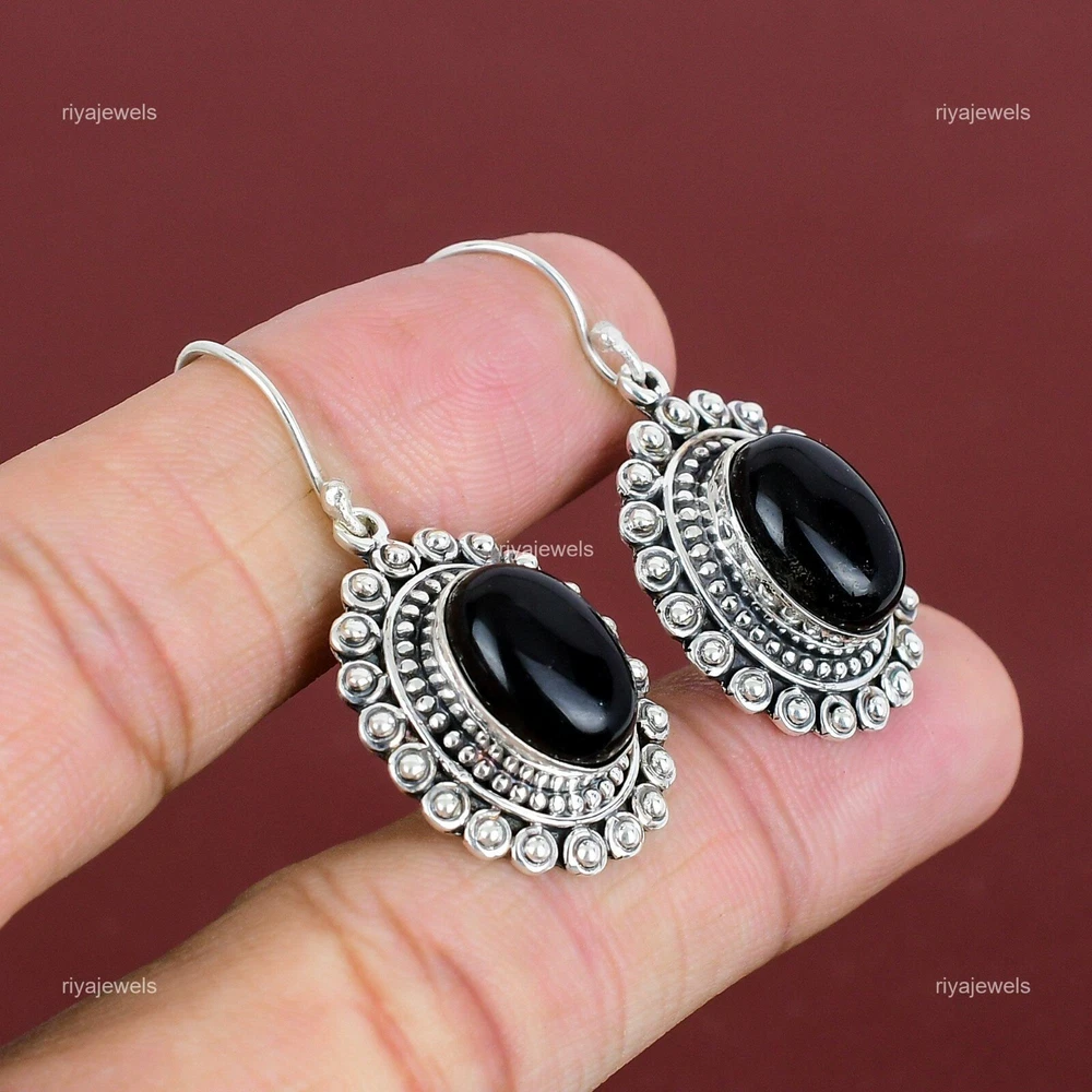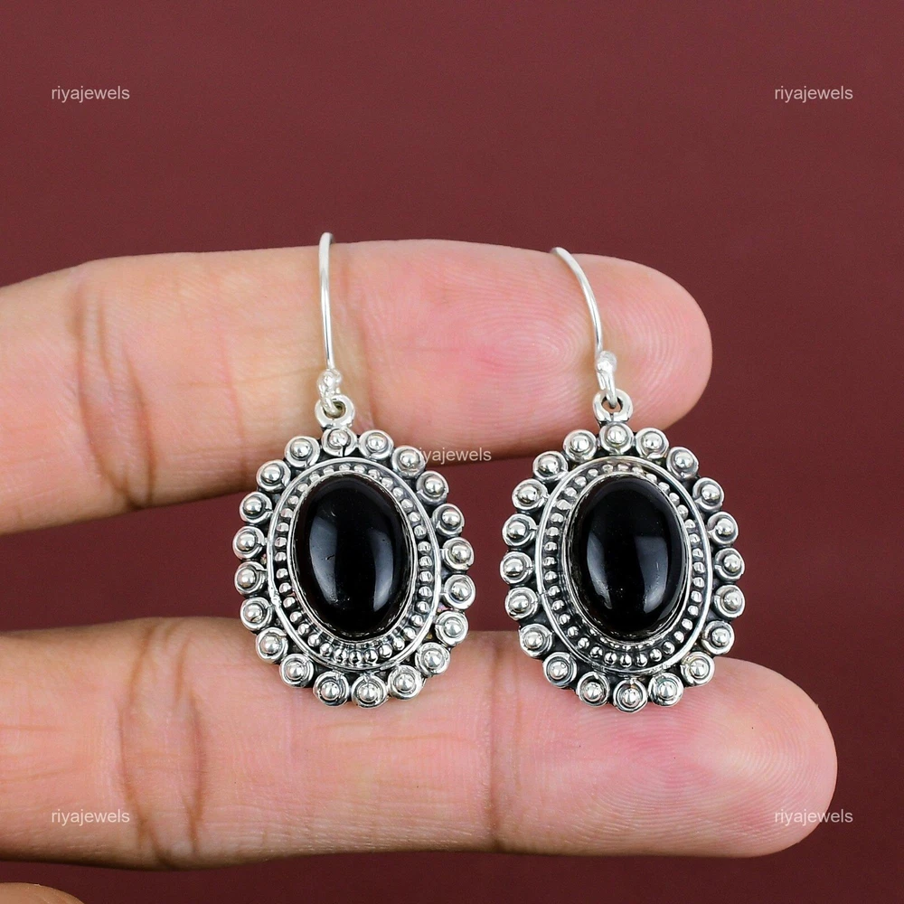 Note : Due to the natural formation of this gemstone. Slight variation in design and color are to be expected. Welcome to Riyajewels Natural Black Onyx Gemstone Drop/Dangle Earrings 925 Sterling Silver For Girls Handmade Earrings, Sterling Silver Earrings, Black Onyx Earrings, Handcrafted Earrings SKU : PE-1669 Gemstone : Black Onyx Stone Shape : Oval Metal Purity : 925 Sterling Silver Length : 43 Millimetres Width : 20 Millimetres Silver Jewelry is a popular choice for many people due to its unique properties and numerous benefits. Here are some of the key properties and benefits of wearing silver jewelry: Properties: Durability: Silver is a durable metal that can withstand regular wear and tear. Malleability: Silver is highly malleable, which means it can be easily shaped and molded into various designs. Conductivity: Silver is an excellent conductor of heat and electricity. Anti-bacterial: Silver has natural anti-bacterial properties, which can help prevent the growth of harmful bacteria. Benefits: Aesthetic appeal: Silver jewelry is known for its beauty and versatility, and can be worn with a variety of outfits and styles. Hypoallergenic: Silver is generally hypoallergenic, which means it is unlikely to cause an allergic reaction in most people. Healing properties: Some people believe that wearing silver jewelry can help with various physical and emotional conditions, such as arthritis, anxiety, and depression. Spiritual significance: Silver has been used in various cultures for its spiritual and symbolic significance, and wearing silver jewelry can help to connect with these traditions. Investment value: Silver is a precious metal that retains its value over time, and investing in silver jewelry can be a smart financial decision. Overall, silver jewelry offers a unique combination of beauty, durability, and benefits, making it a popular choice for people around the world. For Mother's Day Gift For Father's Day Gift For Promise For Valentine' Day For Halloween Party For Christmas Day Gift For New Year Party For Mom For Her If you can't find the information you need or need some advice for your design? Feel free to contact us. We are fast to reply :) All our work is made by hand with Love and Care in our workshop Thank you so much for visiting and hope you enjoy shopping with us Riyajewels is dedicated to providing customers with high-quality sterling silver jewelry. As a manufacturer of handmade jewelry, we offer an extensive range of silver gemstone jewelry that demonstrates our exceptional craftsmanship. We are skilled in adorning gemstones to complement any style, and we give you the freedom to design your own jewelry collection with dazzling, natural, and genuine gemstones. Our talented craftsmen carefully handcraft each jewelry piece, ensuring that it is unique and made with authentic gemstones.