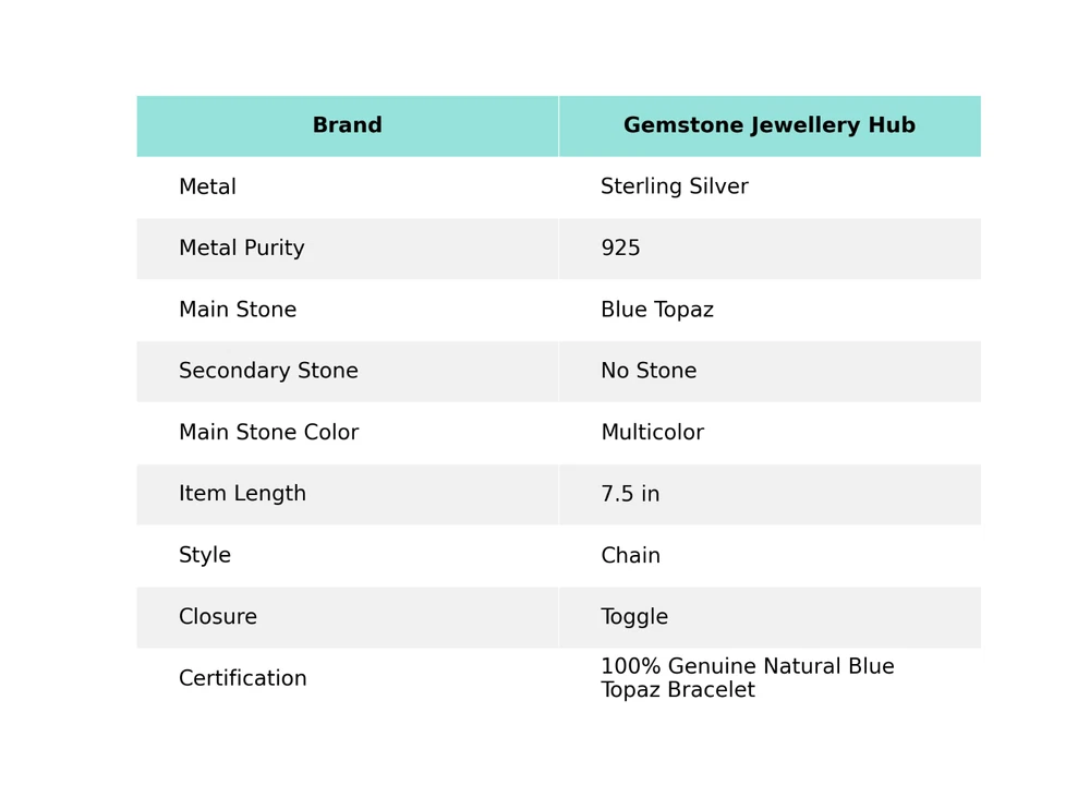 Welcome to Gemstone Treasure Hub Blue Topaz Gemstone Chain Bracelet 925 Sterling Silver Indian Jewelry For Women Handmade Bracelet, Sterling Silver Bracelet, Blue Topaz Bracelet, Handcrafted Bracelet SKU : MB-2673 Gemstone : Blue Topaz Stone Shape : As Seen In Picture Metal Purity : 925 Sterling Silver Bracelet Length : 7.5 Inches Adjustable : ___________________________________________________________________ Shipping Handling - Charge - Free ( Condition apply ) Handling Time - One business day . Delivery Time - 3 to 23 Days ( Various on destination ) Postage service - (A.) India Post - Below $100 order which takes 11 to 23 days . (B.) USPS, Fedex, DHL , Aramax- Order above $100 which takes 3 to 7 days . _________________________________________________________________ Returns - 1. We provide a 100% Money Back Guarantee, excluding shipping costs, within 30 days from the date of item receipt. 2. The item must not be altered or damaged in any way shape or form. 3. Upon receiving these items your payment will be refunded. 4. Kindly reach out to us via email to obtain return instructions prior to initiating the return of merchandise. 5. Please allow up to 1 business day for all returns to receivecredit. 6. Sizing does not affect the return policy. _________________________________________________________________ Payment - We accept PayPal for Payment , should made within three days once buying or winning done , in case of late information expected . _________________________________________________________________ FAQ's - Q.(A) ARE THE ITEMS YOU ARE SELLING BRAND NEW? We exclusively offer brand-new products, refraining from the sale of pre-owned jewelry. Our entire jewelry collection is composed of 100% natural, conflict-free pieces. We do not engage in the trade of imitation or lab-grown gemstones and diamonds. Q.(B) WHAT ARE YOUR BUSINESS HOURS? Our business hours are Monday to Friday, 10:00AM to 6:00PM, excluding holidays. ________________________________________________________________ Gemstone Treasure Hub is dedicated to providing customers with exceptional handmade jewelry crafted to the highest standards of quality. We operate as both connoisseurs and manufacturers of artisanal jewelry, possessing a profound expertise in the art of elevating gemstones to perfectly align with any aesthetic preference. We are pleased to offer you the opportunity to create your own jewelry collection, adorned with authentic and exquisite natural gemstones. Our team of highly skilled artisans painstakingly crafts each individual jewelry piece, ensuring the creation of products with a unique identity that feature genuine gemstones. The jewelry articles presented on our website accurately depict the precise pieces that you will receive.