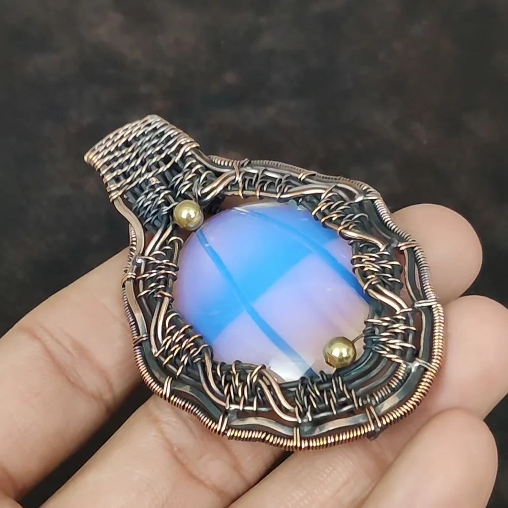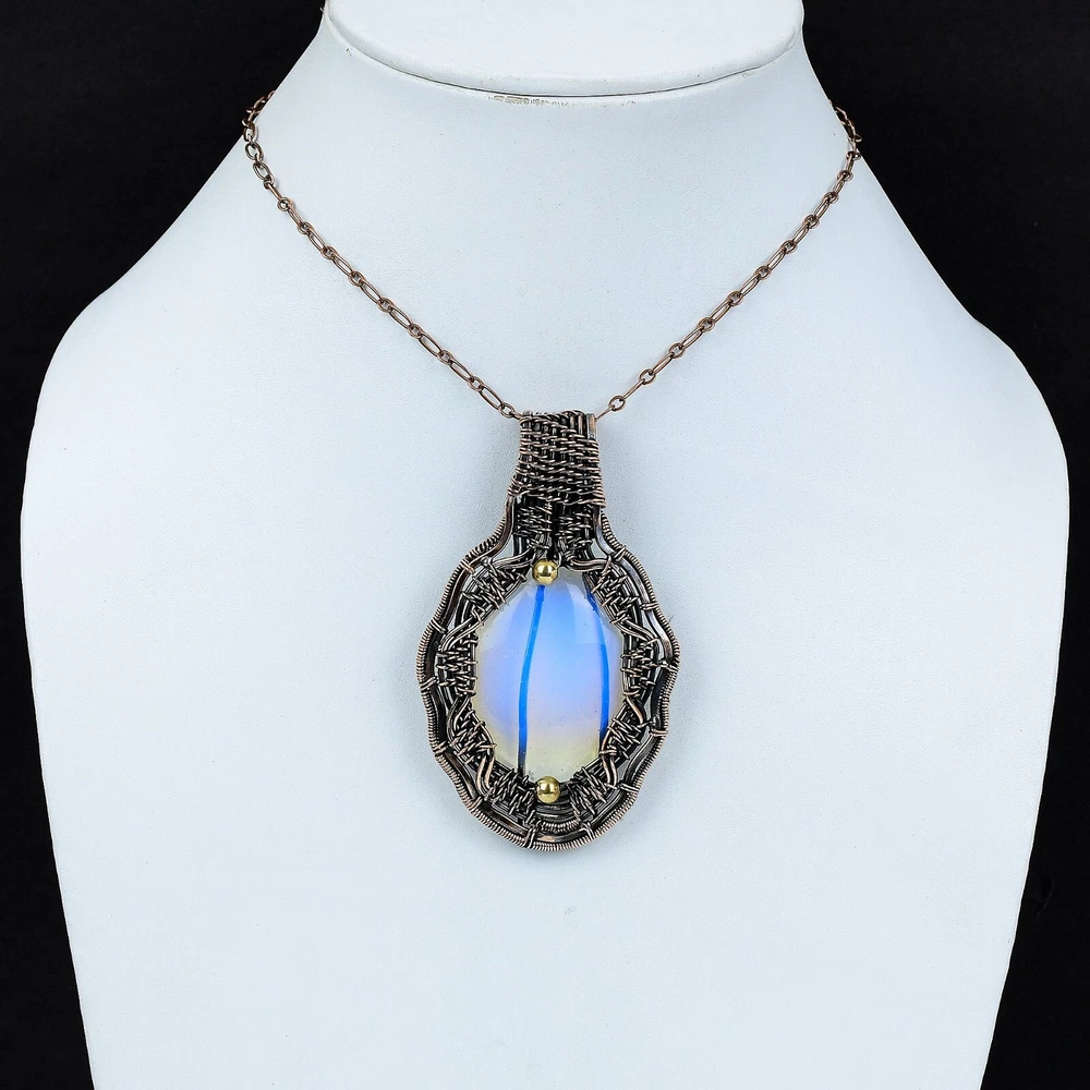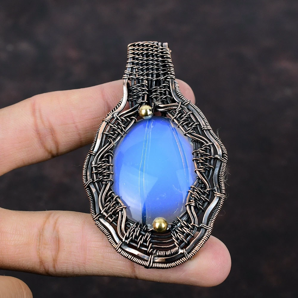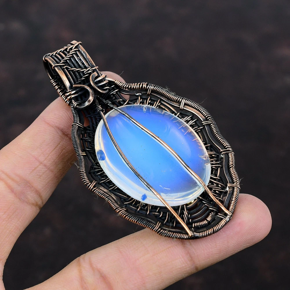 Note : Due to the natural formation of this gemstone. Slight variation in design and color are to be expected. Welcome to Silver Creation Handmade Pendant, Wire Wrapped Pendant, Wire Wrapped Jewelry, Copper Pendant, Copper Wire Pendant, Wrapped Jewelry, Wire Wrap Pendant, Wire Wrap Jewelry SKU : VFWP-2274 Gemstone : Milky Opal Stone Shape : Oval Metal Purity : Unknown Copper Length : 82 Millimetres Width : 49 Millimetres Copper has been used for jewelry making for thousands of years, dating back to ancient civilizations such as the Egyptians, Romans, and Aztecs. Copper was valued for its beauty, versatility, and durability, and was often used to make everything from jewelry and coins to cookware and tools. In addition to its historical significance, copper jewelry also offers several benefits. Copper is a natural conductor of heat and electricity, which makes it ideal for energy healing and therapeutic purposes. Wearing copper jewelry is believed to have various health benefits, such as improving circulation, reducing inflammation, and boosting the immune system. Some people also believe that copper jewelry has the ability to balance energy and improve mood. For Mother's Day Gift For Father's Day Gift For Promise For Valentine' Day For Halloween Party For Christmas Day Gift For New Year Party For Mom For Her If you can't find the information you need or need some advice for your design? Feel free to contact us. We are fast to reply :) All our work is made by hand with Love and Care in our workshop Thank you so much for visiting and hope you enjoy shopping with us Silvercreations is committed to delivering the best quality sterling silver jewelry to customers. As a handmade jewelry manufacturer, we offer an extensive selection of copper gemstone jewelry that showcases the brilliance of our craftsmanship. We are an experienced handmade jewelry supplier with expertise in embellishing gemstones to suit every style. We offer you the liberty to create your jewelry ensemble with sparkling, earthy, and pure gemstones. Our Talented artisans masterfully handcraft each piece of jewelry you see here. Our pieces are made with genuine gemstones.