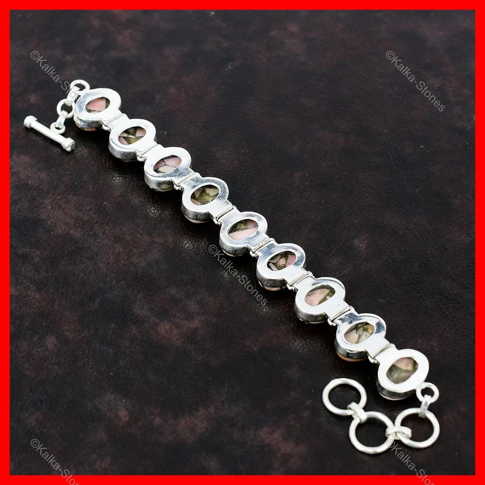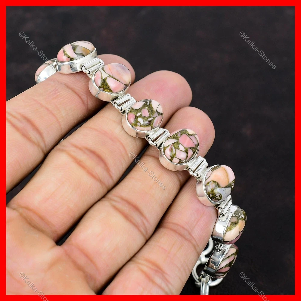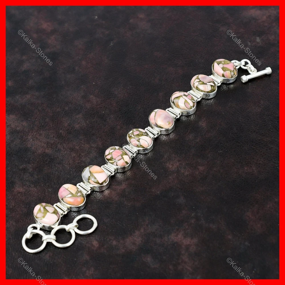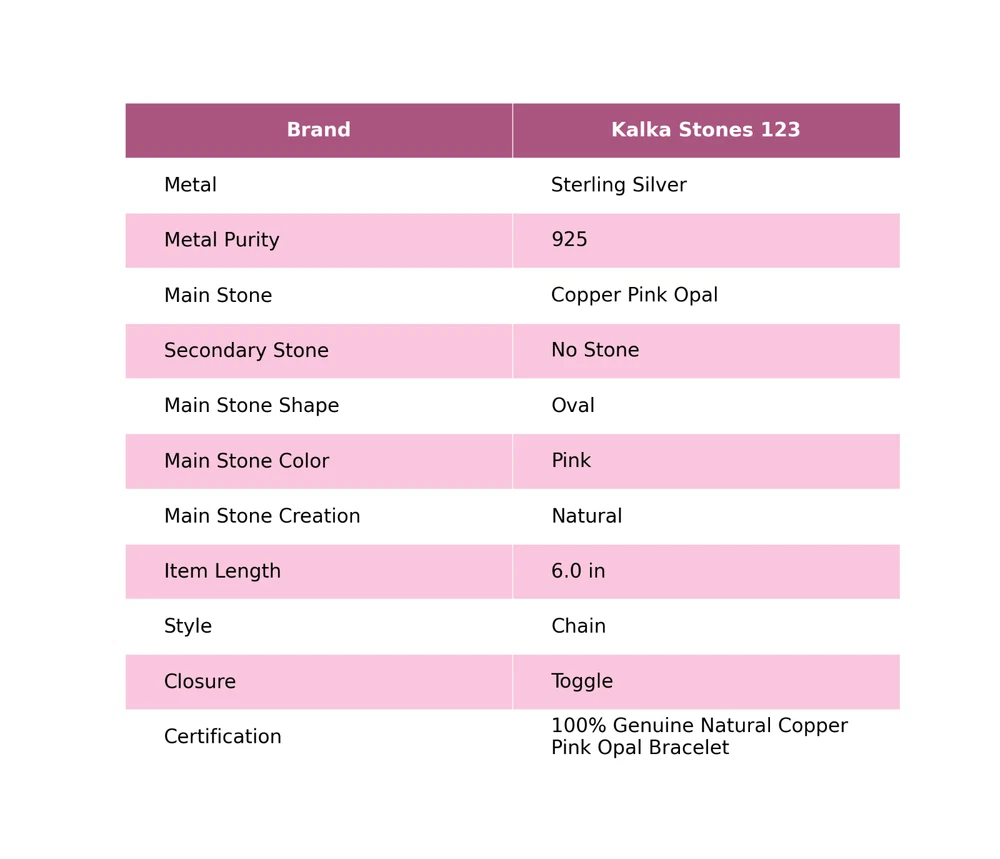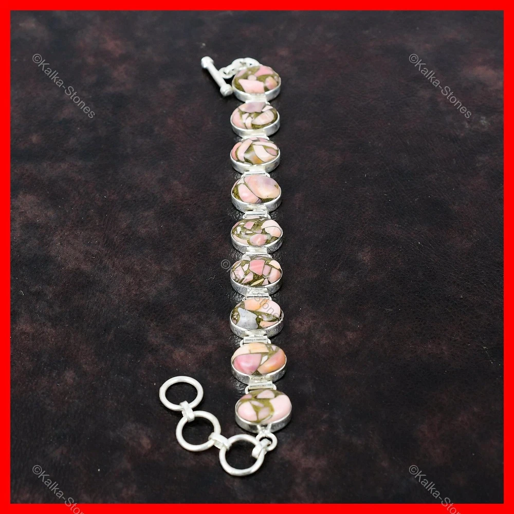 Note : Due to the natural formation of this gemstone. Slight variation in design and color are to be expected. Welcome to Kalka Stones Gift For Women Chain Adjustable Bracelet 925 Silver Natural Copper Pink Opal Handmade Bracelet, Sterling Silver Bracelet, Copper Pink Opal Bracelet, Handcrafted Bracelet SKU : KB-2 Gemstone : Copper Pink Opal Stone Shape : Oval Metal Purity : 925 Sterling Silver Bracelet Length : 6 Inches Adjustable : Yes Silver Jewelry is a popular choice for many people due to its unique properties and numerous benefits. Here are some of the key properties and benefits of wearing silver jewelry: Properties: Durability: Silver is a durable metal that can withstand regular wear and tear. Malleability: Silver is highly malleable, which means it can be easily shaped and molded into various designs. Conductivity: Silver is an excellent conductor of heat and electricity. Anti-bacterial: Silver has natural anti-bacterial properties, which can help prevent the growth of harmful bacteria. Benefits: Aesthetic appeal: Silver jewelry is known for its beauty and versatility, and can be worn with a variety of outfits and styles. Hypoallergenic: Silver is generally hypoallergenic, which means it is unlikely to cause an allergic reaction in most people. Healing properties: Some people believe that wearing silver jewelry can help with various physical and emotional conditions, such as arthritis, anxiety, and depression. Spiritual significance: Silver has been used in various cultures for its spiritual and symbolic significance, and wearing silver jewelry can help to connect with these traditions. Investment value: Silver is a precious metal that retains its value over time, and investing in silver jewelry can be a smart financial decision. Overall, silver jewelry offers a unique combination of beauty, durability, and benefits, making it a popular choice for people around the world. For Mother's Day Gift For Father's Day Gift For Promise For Valentine' Day For Halloween Party For Christmas Day Gift For New Year Party For Mom For Her If you can't find the information you need or need some advice for your design? Feel free to contact us. We are fast to reply :) All our work is made by hand with Love and Care in our workshop Thank you so much for visiting and hope you enjoy shopping with us Kalka Stones is dedicated to providing customers with high-quality sterling silver jewelry. As a manufacturer of handmade jewelry, we offer an extensive range of silver gemstone jewelry that demonstrates our exceptional craftsmanship. We are skilled in adorning gemstones to complement any style, and we give you the freedom to design your own jewelry collection with dazzling, natural, and genuine gemstones. Our talented craftsmen carefully handcraft each jewelry piece, ensuring that it is unique and made with authentic gemstones.