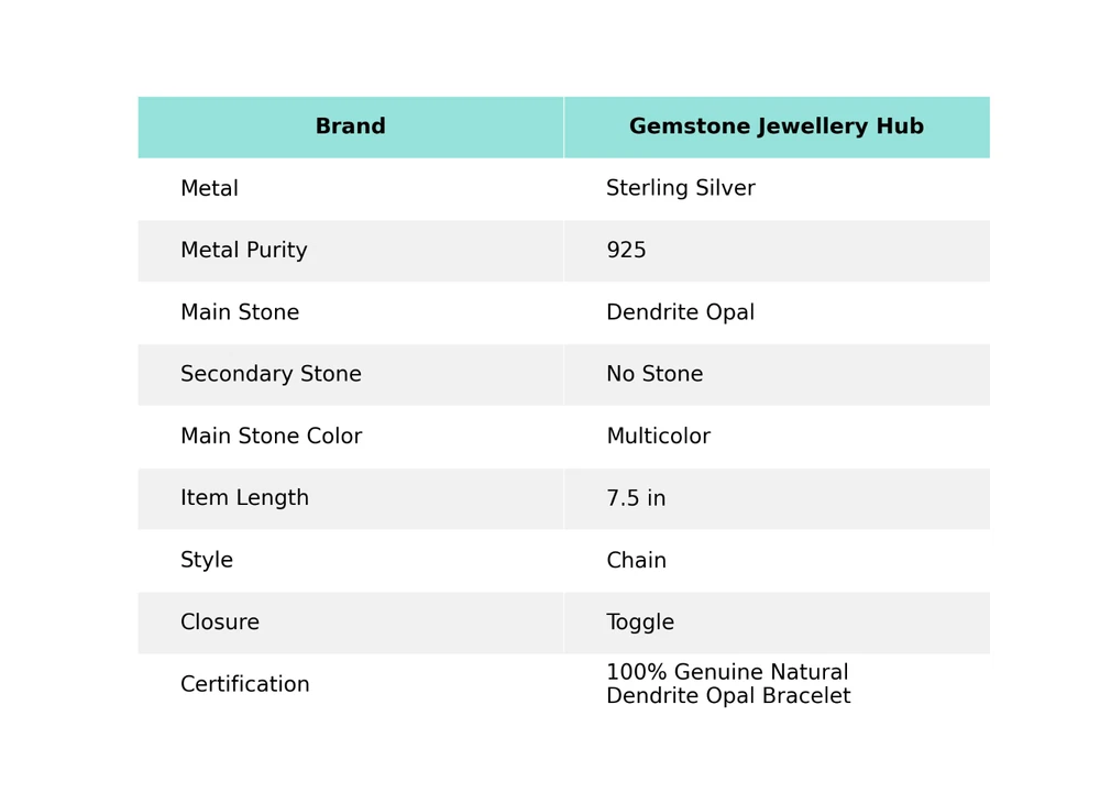 Welcome to Gemstone Treasure Hub Birthday Gift For Her Dendrite Opal Gemstone Chain Bracelet 925 Sterling Silver Handmade Bracelet, Sterling Silver Bracelet, Dendrite Opal Bracelet, Handcrafted Bracelet SKU : MB-2994 Gemstone : Dendrite Opal Stone Shape : As Seen In Picture Metal Purity : 925 Sterling Silver Bracelet Length : 7.5 Inches Adjustable : ___________________________________________________________________ Shipping Handling - Charge - Free ( Condition apply ) Handling Time - One business day . Delivery Time - 3 to 23 Days ( Various on destination ) Postage service - (A.) India Post - Below $100 order which takes 11 to 23 days . (B.) USPS, Fedex, DHL , Aramax- Order above $100 which takes 3 to 7 days . _________________________________________________________________ Returns - 1. We provide a 100% Money Back Guarantee, excluding shipping costs, within 30 days from the date of item receipt. 2. The item must not be altered or damaged in any way shape or form. 3. Upon receiving these items your payment will be refunded. 4. Kindly reach out to us via email to obtain return instructions prior to initiating the return of merchandise. 5. Please allow up to 1 business day for all returns to receivecredit. 6. Sizing does not affect the return policy. _________________________________________________________________ Payment - We accept PayPal for Payment , should made within three days once buying or winning done , in case of late information expected . _________________________________________________________________ FAQ's - Q.(A) ARE THE ITEMS YOU ARE SELLING BRAND NEW? We exclusively offer brand-new products, refraining from the sale of pre-owned jewelry. Our entire jewelry collection is composed of 100% natural, conflict-free pieces. We do not engage in the trade of imitation or lab-grown gemstones and diamonds. Q.(B) WHAT ARE YOUR BUSINESS HOURS? Our business hours are Monday to Friday, 10:00AM to 6:00PM, excluding holidays. ________________________________________________________________ Gemstone Treasure Hub is dedicated to providing customers with exceptional handmade jewelry crafted to the highest standards of quality. We operate as both connoisseurs and manufacturers of artisanal jewelry, possessing a profound expertise in the art of elevating gemstones to perfectly align with any aesthetic preference. We are pleased to offer you the opportunity to create your own jewelry collection, adorned with authentic and exquisite natural gemstones. Our team of highly skilled artisans painstakingly crafts each individual jewelry piece, ensuring the creation of products with a unique identity that feature genuine gemstones. The jewelry articles presented on our website accurately depict the precise pieces that you will receive.