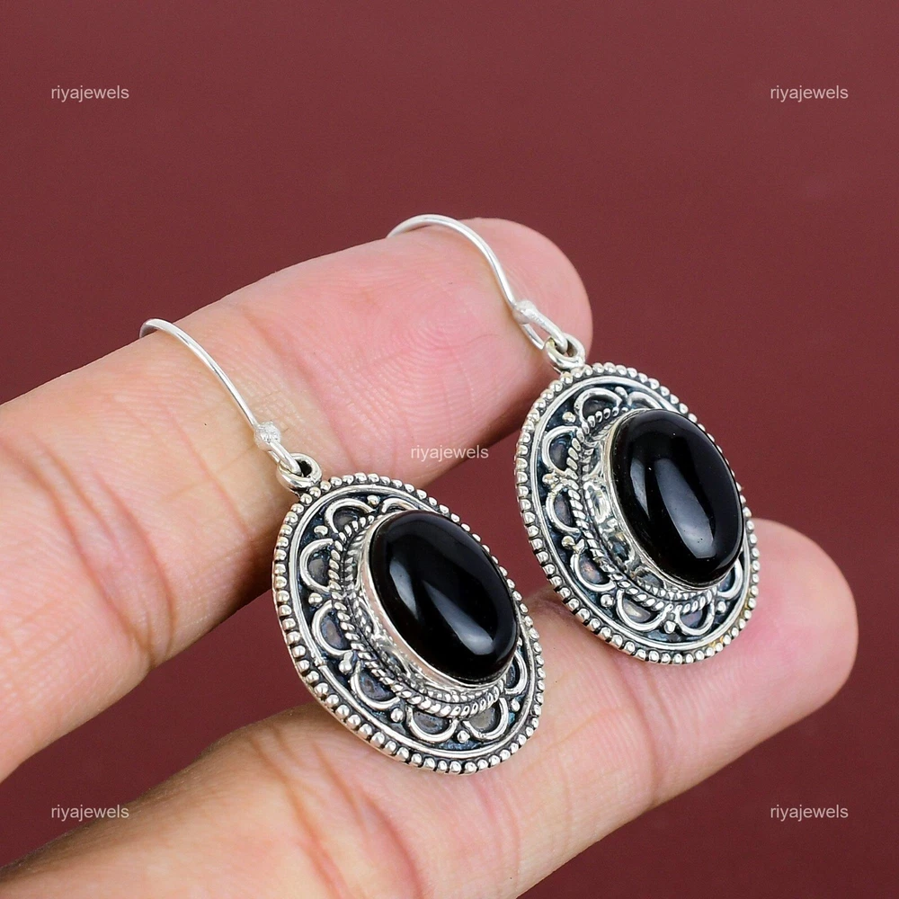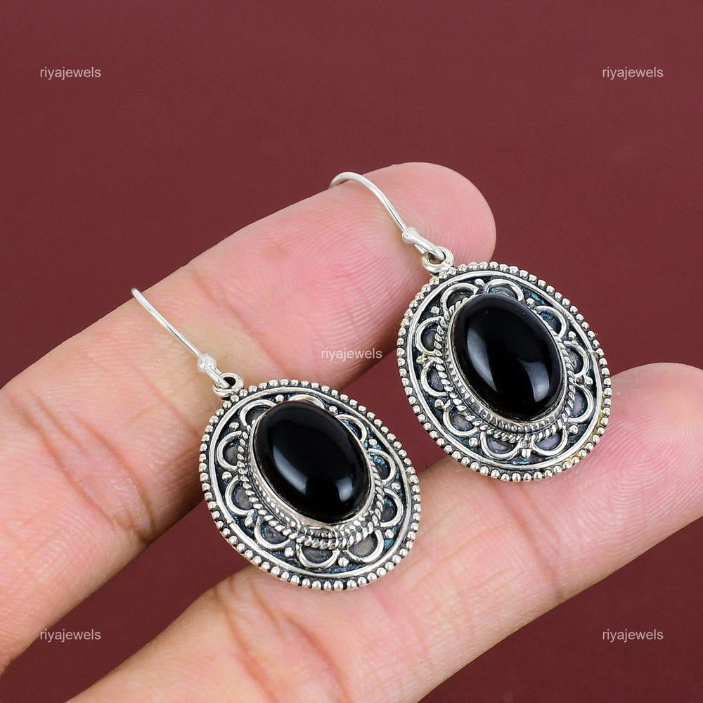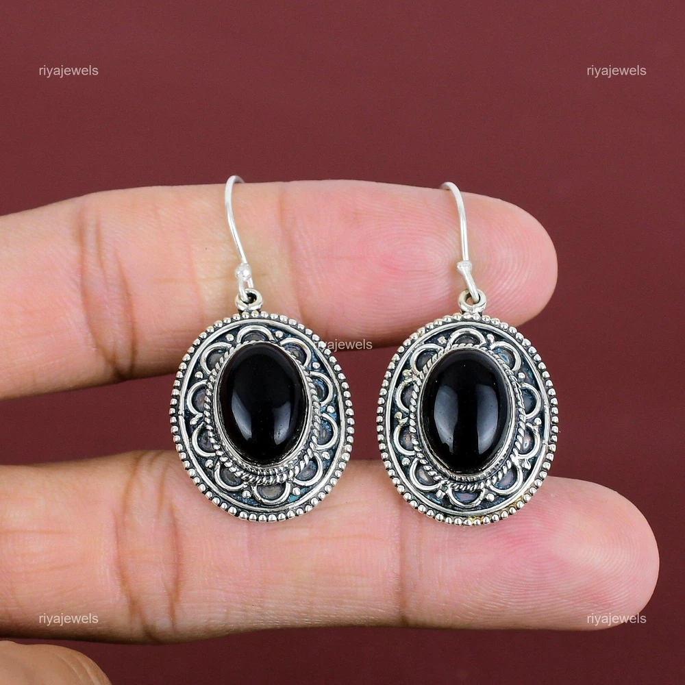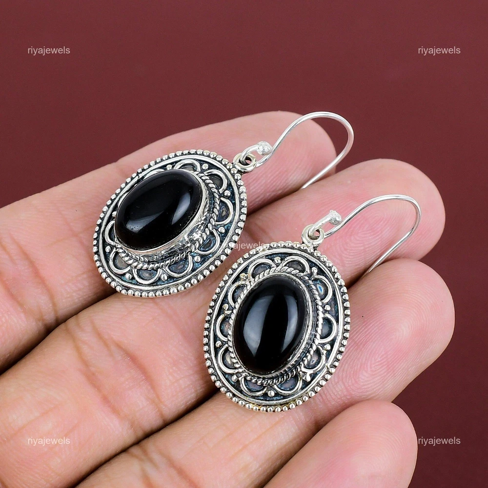 Note : Due to the natural formation of this gemstone. Slight variation in design and color are to be expected. Welcome to Riyajewels Natural Black Onyx Gemstone 925 Sterling Silver Drop/Dangle Earrings For Girls Handmade Earrings, Sterling Silver Earrings, Black Onyx Earrings, Handcrafted Earrings SKU : PE-1689 Gemstone : Black Onyx Stone Shape : Oval Metal Purity : 925 Sterling Silver Length : 43 Millimetres Width : 20 Millimetres Silver Jewelry is a popular choice for many people due to its unique properties and numerous benefits. Here are some of the key properties and benefits of wearing silver jewelry: Properties: Durability: Silver is a durable metal that can withstand regular wear and tear. Malleability: Silver is highly malleable, which means it can be easily shaped and molded into various designs. Conductivity: Silver is an excellent conductor of heat and electricity. Anti-bacterial: Silver has natural anti-bacterial properties, which can help prevent the growth of harmful bacteria. Benefits: Aesthetic appeal: Silver jewelry is known for its beauty and versatility, and can be worn with a variety of outfits and styles. Hypoallergenic: Silver is generally hypoallergenic, which means it is unlikely to cause an allergic reaction in most people. Healing properties: Some people believe that wearing silver jewelry can help with various physical and emotional conditions, such as arthritis, anxiety, and depression. Spiritual significance: Silver has been used in various cultures for its spiritual and symbolic significance, and wearing silver jewelry can help to connect with these traditions. Investment value: Silver is a precious metal that retains its value over time, and investing in silver jewelry can be a smart financial decision. Overall, silver jewelry offers a unique combination of beauty, durability, and benefits, making it a popular choice for people around the world. For Mother's Day Gift For Father's Day Gift For Promise For Valentine' Day For Halloween Party For Christmas Day Gift For New Year Party For Mom For Her If you can't find the information you need or need some advice for your design? Feel free to contact us. We are fast to reply :) All our work is made by hand with Love and Care in our workshop Thank you so much for visiting and hope you enjoy shopping with us Riyajewels is dedicated to providing customers with high-quality sterling silver jewelry. As a manufacturer of handmade jewelry, we offer an extensive range of silver gemstone jewelry that demonstrates our exceptional craftsmanship. We are skilled in adorning gemstones to complement any style, and we give you the freedom to design your own jewelry collection with dazzling, natural, and genuine gemstones. Our talented craftsmen carefully handcraft each jewelry piece, ensuring that it is unique and made with authentic gemstones.