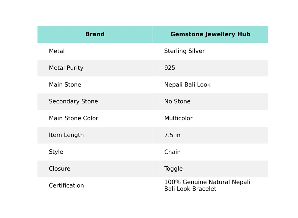 Welcome to Gemstone Treasure Hub Wedding Gift For Her 925 Silver Nepali Bali Look Gemstone Chain Bracelet Handmade Bracelet, Sterling Silver Bracelet, Nepali Bali Look Bracelet, Handcrafted Bracelet SKU : MB-3341 Gemstone : Nepali Bali Look Stone Shape : As Seen In Picture Metal Purity : 925 Sterling Silver Bracelet Length : 7.5 Inches Adjustable : ___________________________________________________________________ Shipping Handling - Charge - Free ( Condition apply ) Handling Time - One business day . Delivery Time - 3 to 23 Days ( Various on destination ) Postage service - (A.) India Post - Below $100 order which takes 11 to 23 days . (B.) USPS, Fedex, DHL , Aramax- Order above $100 which takes 3 to 7 days . _________________________________________________________________ Returns - 1. We provide a 100% Money Back Guarantee, excluding shipping costs, within 30 days from the date of item receipt. 2. The item must not be altered or damaged in any way shape or form. 3. Upon receiving these items your payment will be refunded. 4. Kindly reach out to us via email to obtain return instructions prior to initiating the return of merchandise. 5. Please allow up to 1 business day for all returns to receivecredit. 6. Sizing does not affect the return policy. _________________________________________________________________ Payment - We accept PayPal for Payment , should made within three days once buying or winning done , in case of late information expected . _________________________________________________________________ FAQ's - Q.(A) ARE THE ITEMS YOU ARE SELLING BRAND NEW? We exclusively offer brand-new products, refraining from the sale of pre-owned jewelry. Our entire jewelry collection is composed of 100% natural, conflict-free pieces. We do not engage in the trade of imitation or lab-grown gemstones and diamonds. Q.(B) WHAT ARE YOUR BUSINESS HOURS? Our business hours are Monday to Friday, 10:00AM to 6:00PM, excluding holidays. ________________________________________________________________ Gemstone Treasure Hub is dedicated to providing customers with exceptional handmade jewelry crafted to the highest standards of quality. We operate as both connoisseurs and manufacturers of artisanal jewelry, possessing a profound expertise in the art of elevating gemstones to perfectly align with any aesthetic preference. We are pleased to offer you the opportunity to create your own jewelry collection, adorned with authentic and exquisite natural gemstones. Our team of highly skilled artisans painstakingly crafts each individual jewelry piece, ensuring the creation of products with a unique identity that feature genuine gemstones. The jewelry articles presented on our website accurately depict the precise pieces that you will receive.