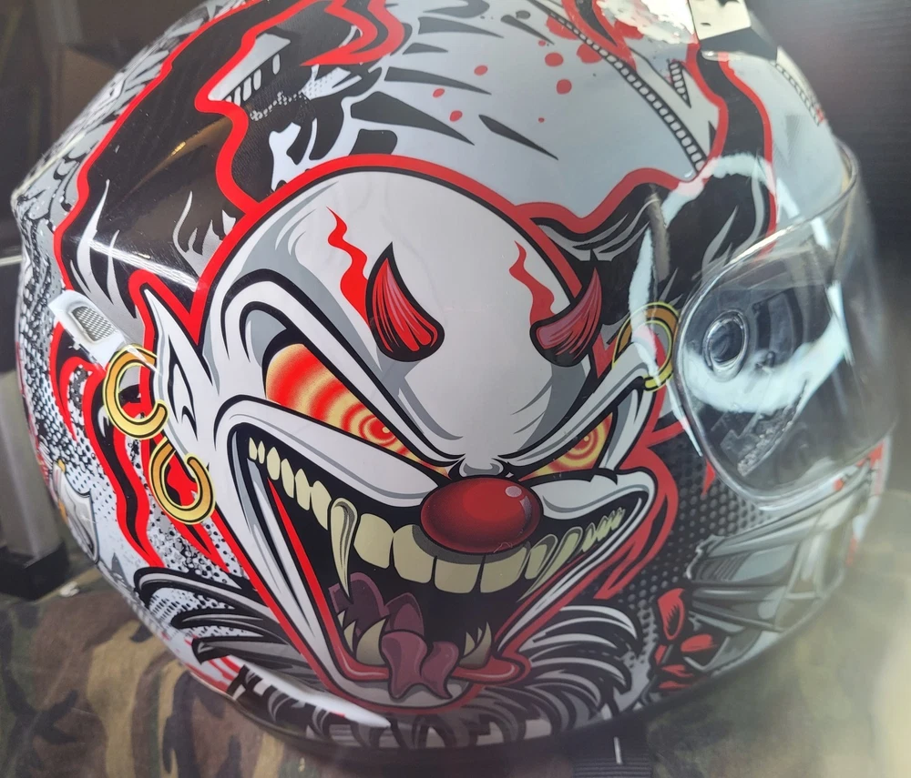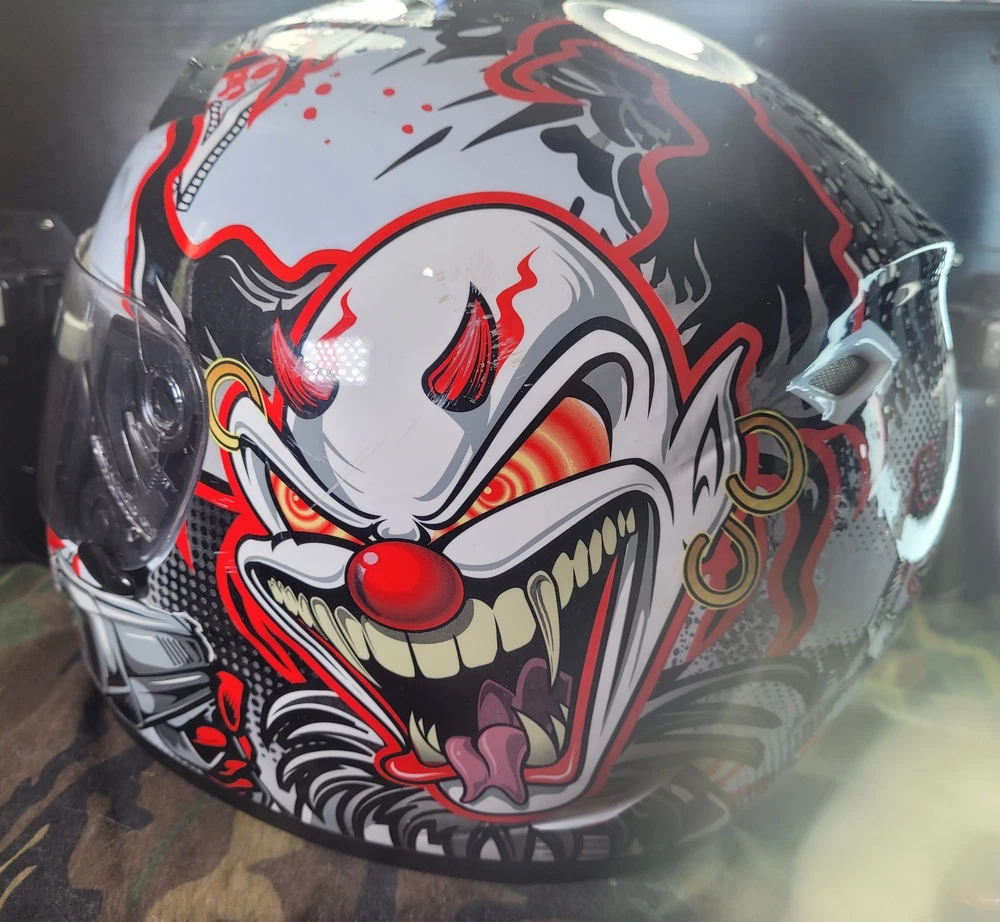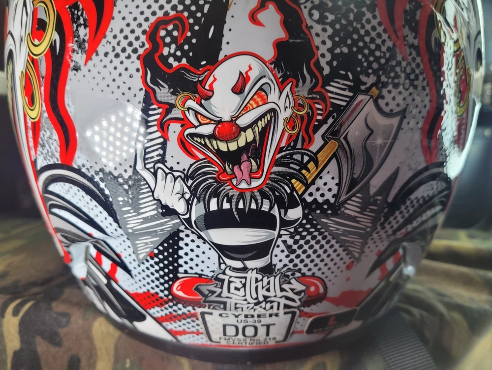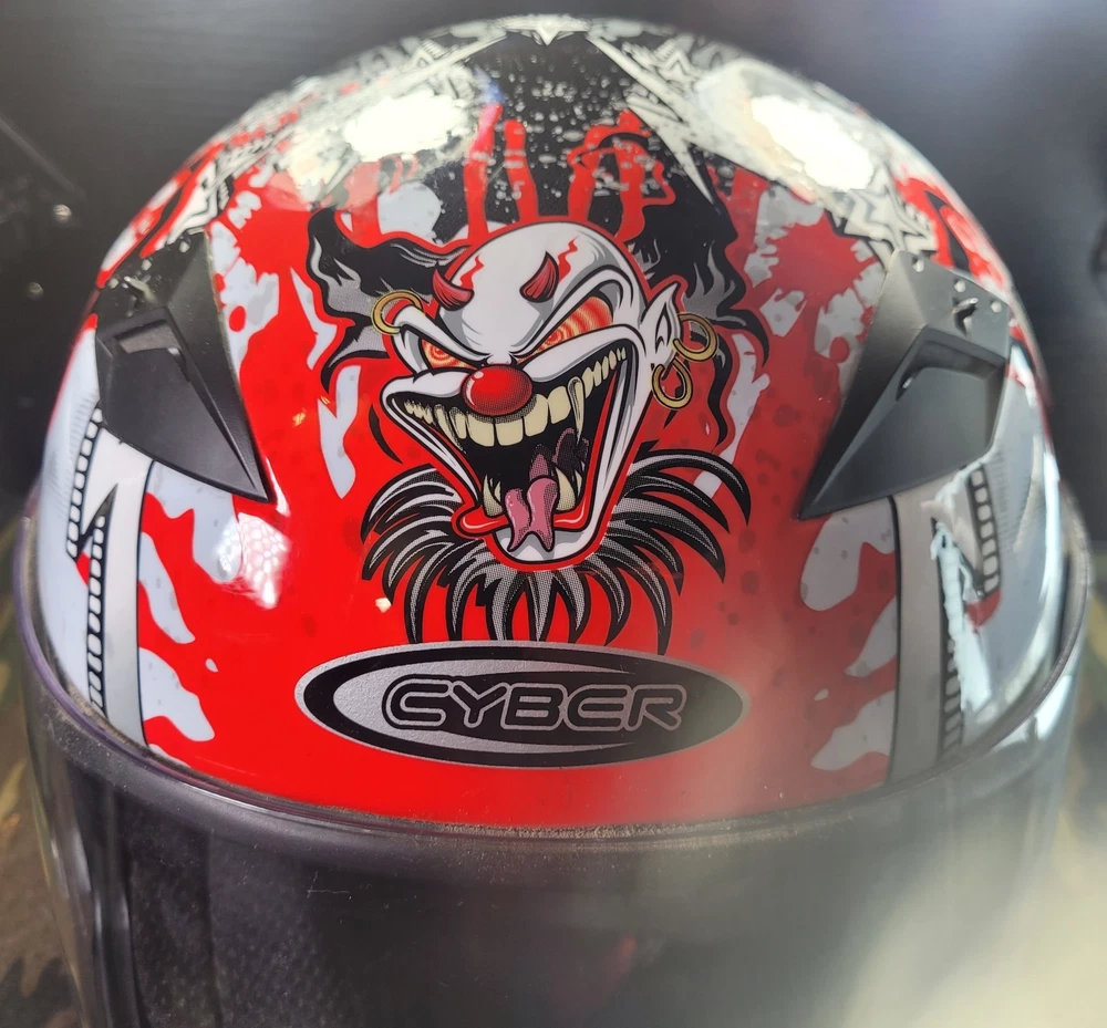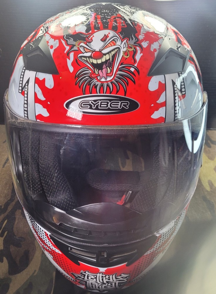 Cyber! Out of Production! US-39! Lethal Threat! Killer Clown Graphic!!! Full Face Motorcycle Helmet!!! Size Large 59-60 cm. This is a very lightly used helmet with mild scuff from storage shown in pictures. In Great Condition! Please study pictures because they are the examples that you will be receiving. Thanks for looking!!!🫡🫡🫡 (Please mention if you need more gear. I'm LOADED!)