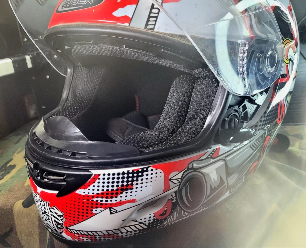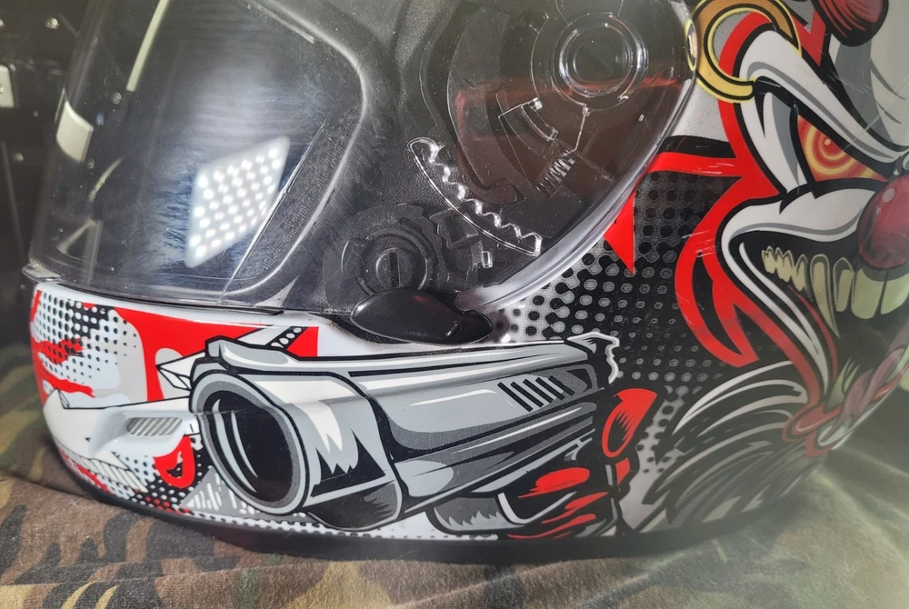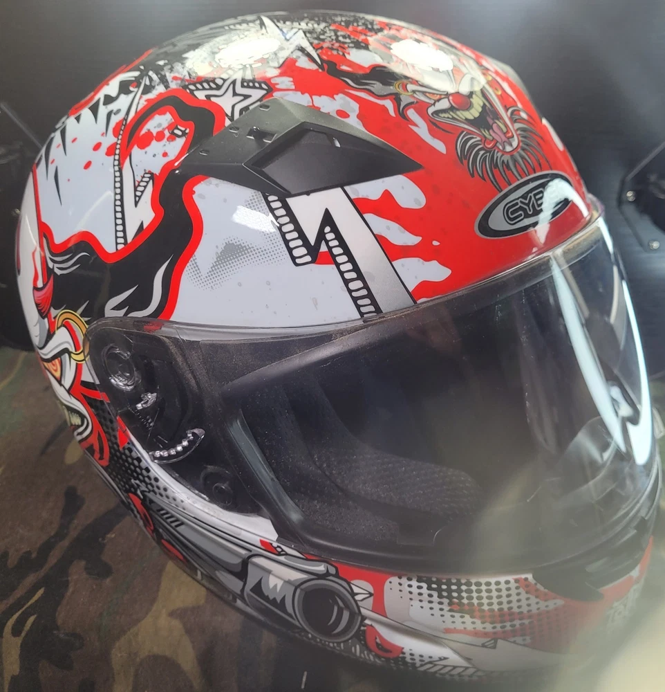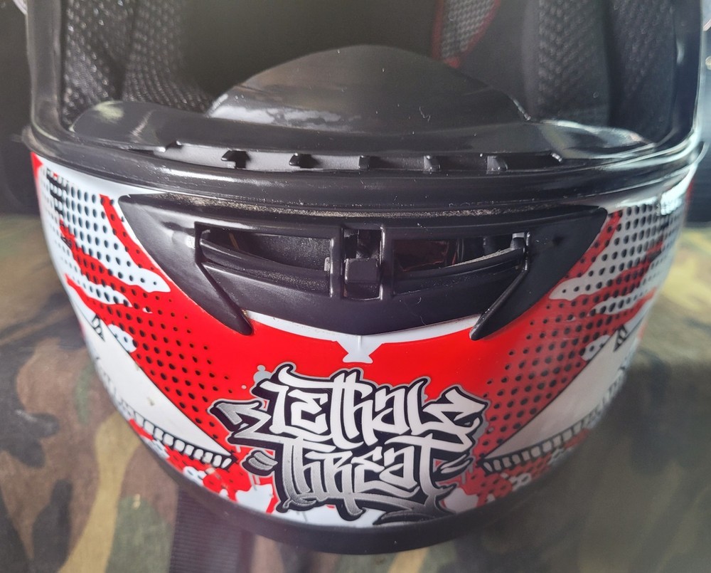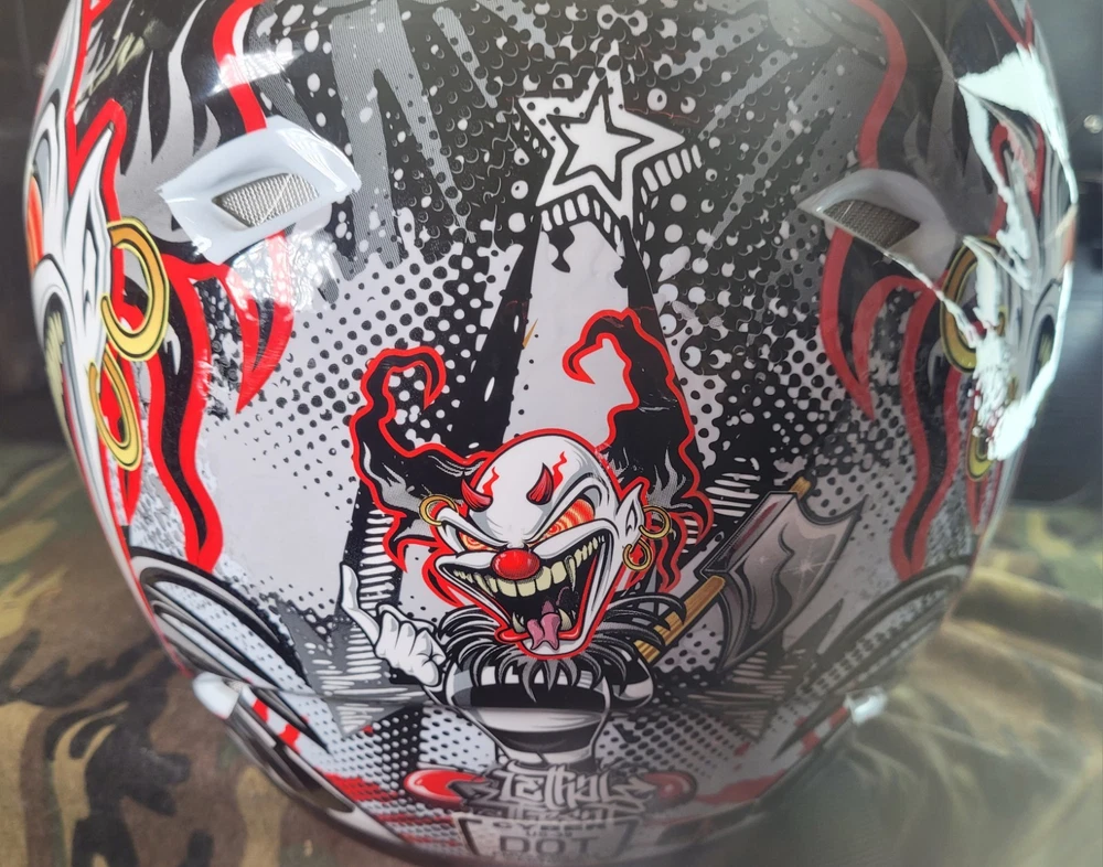 Cyber! Out of Production! US-39! Lethal Threat! Killer Clown Graphic!!! Full Face Motorcycle Helmet!!! Size Large 59-60 cm. This is a very lightly used helmet with mild scuff from storage shown in pictures. In Great Condition! Please study pictures because they are the examples that you will be receiving. Thanks for looking!!!🫡🫡🫡 (Please mention if you need more gear. I'm LOADED!)