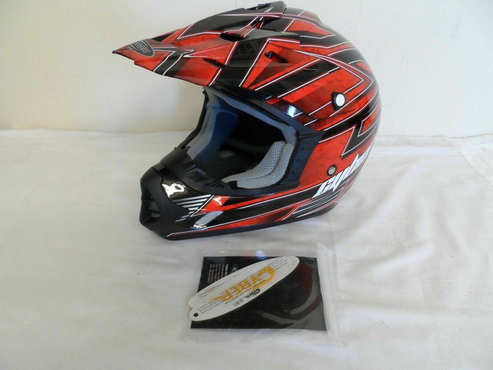 Thanks for Checking out our Store! Up for sale is a Brand New custom return Cyber UX-24 Bandit Helmet. See condition report below. Impact resistant adjustable visor. Removable and washable interior. Double D-ring retention system. Meets or exceeds D.O.T. and ECE standards. Sold individually. SIZE : MEDIUM COLOR : RED / BLACK Manufacturer Part # Condition: Brand New..never used. Returned because there is a small paint nick near the mouth area on the front of the helmet. The adjustment nut for the visor also has some scuffs under it. Helmet has a few light hairline scratches around on it but they are too light to pick up on camera. Will be difficult to notice unless you are up close. See photos. Thanks for Looking and Good Luck! Don't forget to check out our other Auctions Along with Our Ebay Store for More Great Deals! CY0422 Flat rate shipping applies only to lower 48 states.