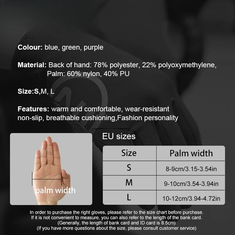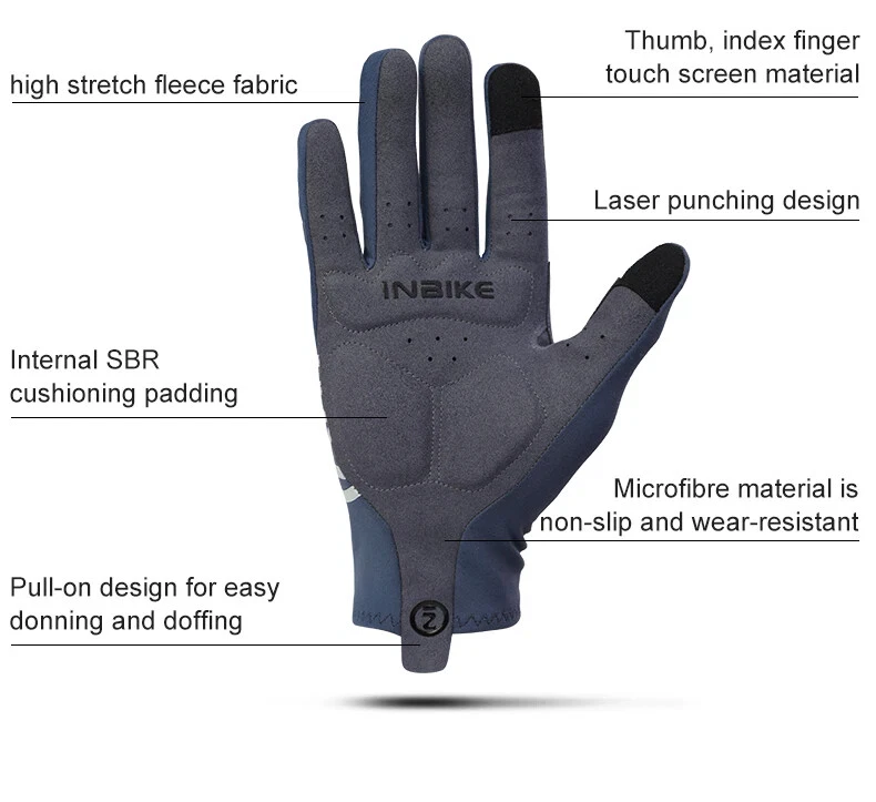 Product Infomation Name: INBIKE Cycling Gloves Model 1: IH23C701 Material: back fleece + palm microfiber material Size: S,M,L Season: Winter/Autumn Color: Purple, Blue, Green,Black Suitable for Temperature:5-15 Model 2:IH23F411 Name: Full Finger Cycling Gloves Fabrics: cool lycra fabric Suitable Season: Spring and Autumn Size: S/M/L/XL/2XL Main process: skin-friendly cold lycra fabric on the back of the hand Color: Black, Blue Suitable for Temperature:10-20 ℃ Model 3:IH23203 Name: Half Finger Cycling Gloves Fabrics: cool lycra fabric Suitable Season: Summer Size: S/M/L/XL/2XL Main process: skin-friendly cold lycra fabric on the back of the hand Color: Black, Pink,White Suitable for Temperature: 20 degrees or more Feature Brand LOG0 logo High-stretch fleece fabric on the back of the hand The mouth of the tiger is thickened and wear-resistant Thumb index finger touchscreen Anti-slip silicone logo Palm breathable holes The palm is filled with SBR cushioning material Extended pull tabs make it easy to put on and take off High Elastic Fleece Fabric on the Back of the Hand Fleece fabric has good warmth, high elasticity and abrasion resistance. 1)Silicone LOGO Palm Pad+SBR Cushioning Material The palm of the hand is anti-slip to increase friction and improve safety. 2)Palm and Finger Vents The palm and finger vents are designed to accelerate air flow and breathe without stuffiness. Reflective LOGO Design Fashionable big logo + index finger INBIKE three-dimensional LOGO design on the back of the hand to improve the safety of night riding. High elastic fleece fabric on the back of the hand. Fingertip Sensitive Touch Screen The touchscreen material of the thumb and index finger allows for flexible use of electronic products. Silicone logo palm pad ,the palm of the hand is anti-slip to increase friction and improve safety. The palm and finger vents are designed to accelerate air flow and breathe without stuffiness. Extended pull tabs on the wrist cuff for easy on and off. Wear-resistant tiger's mouth ,anti-slip design at the tiger's mouth.