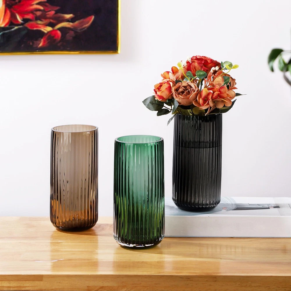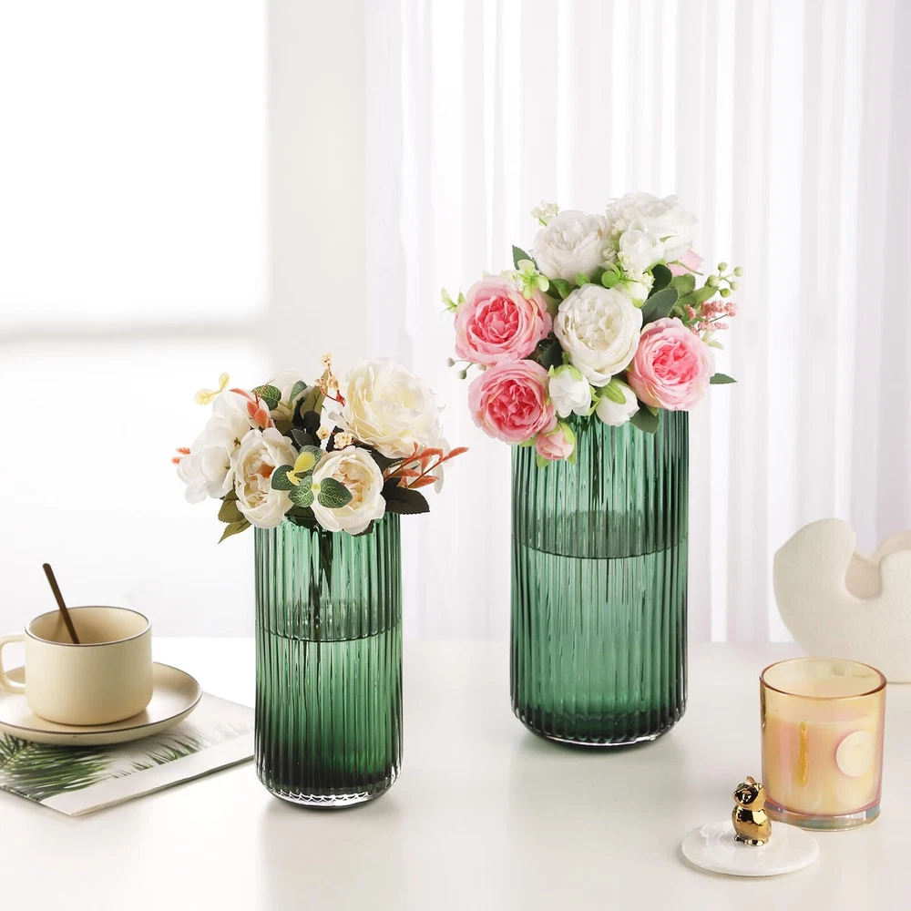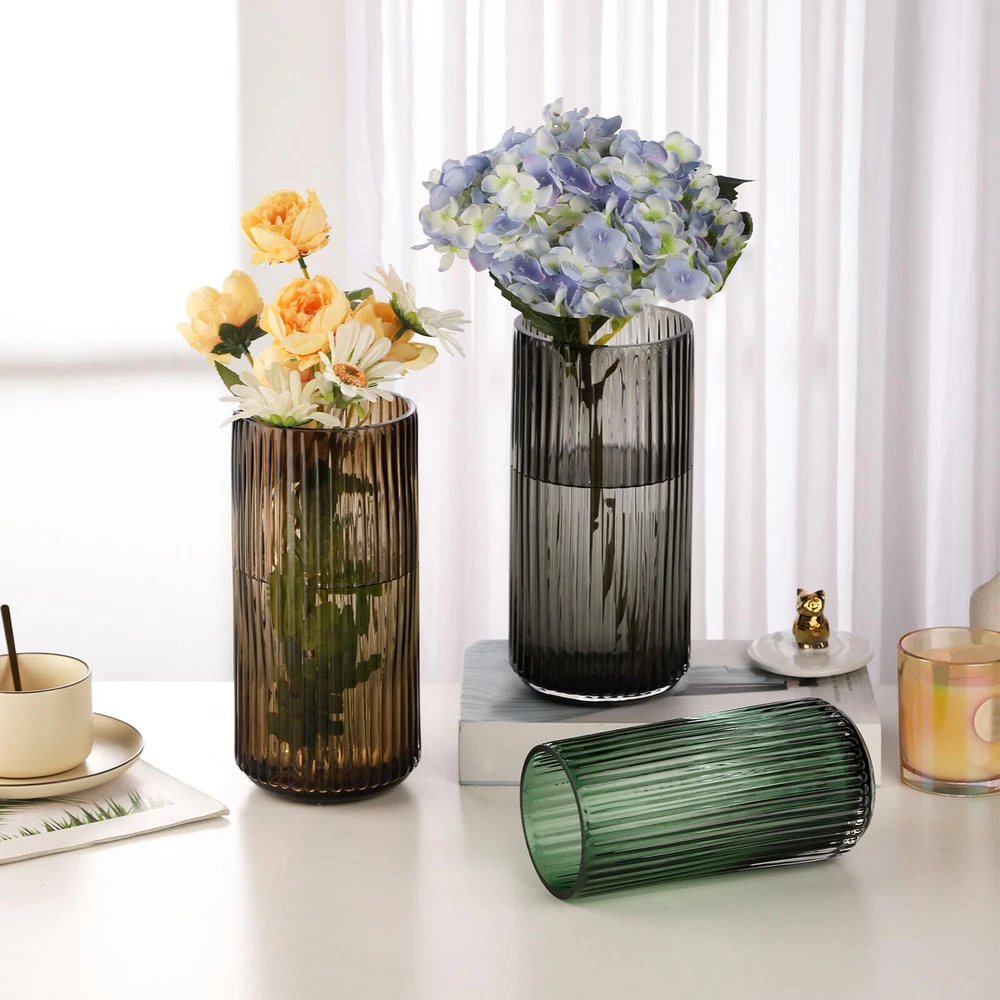 Cool blown glass vase – this unique flower vase is a great smokey vase. The unique ribbed glass design with the beautiful color makes it a great dining table centerpiece décor when holding a bouquet of flowers. The light plays beautifully on the decorative glass vase, given the illusion of curves and indents that aren't physically there. Match perfectly with vintage décor- This aesthetic designed dark green, straight lines, fluted glass vase perfect with vintage décor and most traditional home décor. Wide mouth vases for flowers – this smoked glass vase features beautiful color and size for a large floral bouquet. The dark green hides the stems under a bouquet. The wide mouth looks great with larger bouquets or even a dozen tulips - just keeps everything straighter rather than pinch together and flare. Solidly built coffee table vase – The dining table vase is sturdy and wide enough to fit a nice size bouquet of flowers. It measures about 3.74*7.5 inches (Diameter*H). Exact size detail can be read from the pic. Versatile glass for flower vase – This aesthetic flower vase is suitable for various occasions. With straight lines look, this unique purse vase makes the flowers look even better. The smoky colored glass will hide stems whether you’re using fresh flowers or dried. Perfect for wedding, party and dining table.