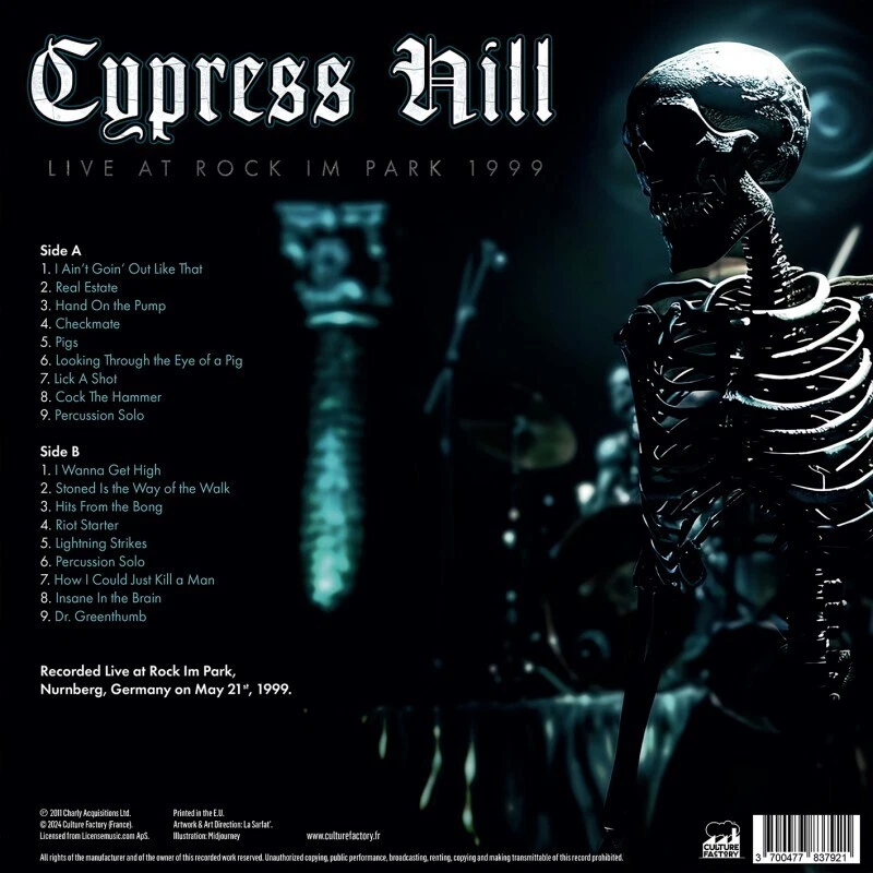 Further Details Title: Live at Rock Im Park 1999 (RSD Black Friday 2024) Condition: New Format: Vinyl EAN: 3700477837921 Edition: Collector's 12" Album Coloured Vinyl (Limited Edition) Genre: Rap & Hip-Hop Style: Rap & Hip-Hop Release Date: 11/29/2024 Description: The concert of Cypress Hill at the Rock Im Park festival in 1999, released for the first time, captures the raw energy and intensity of their live performance. It includes classics like 'Insane in the Brain' and 'Hits from the Bong', showcasing their unique fusion of rap and rock. The exceptional sound quality allows listeners to relive the explosive atmosphere of the festival. This vinyl is a must-have for fans, offering complete immersion into an iconic moment in Cypress Hill's history. No Of Discs: 1 Artist: Cypress Hill Record Label: Culture Factory Color: Blue smoke coloured vinyl MPN: 700477837921 Release Year: 2024 Tracks: 1: I Ain't Goin' Out Like That 2: Real Estate 3: Hand On the Pump 4: Checkmate 5: Pigs 6: Looking Through the Eye of a Pig 7: Lick a Shot 8: Cock the Hammer 9: Percussion Solo 10: I Wanna Get High 11: Stoned Is the Way of the Walk 12: Hits from the Bong 13: Riot Starter 14: Lightning Strikes 15: Percussion Solo 16: How I Could Just Kill a Man 17: Insane in the Brain 18: Dr. Greenthumb Missing Information? Please contact us if any details are missing and where possible we will add the information to our listing.