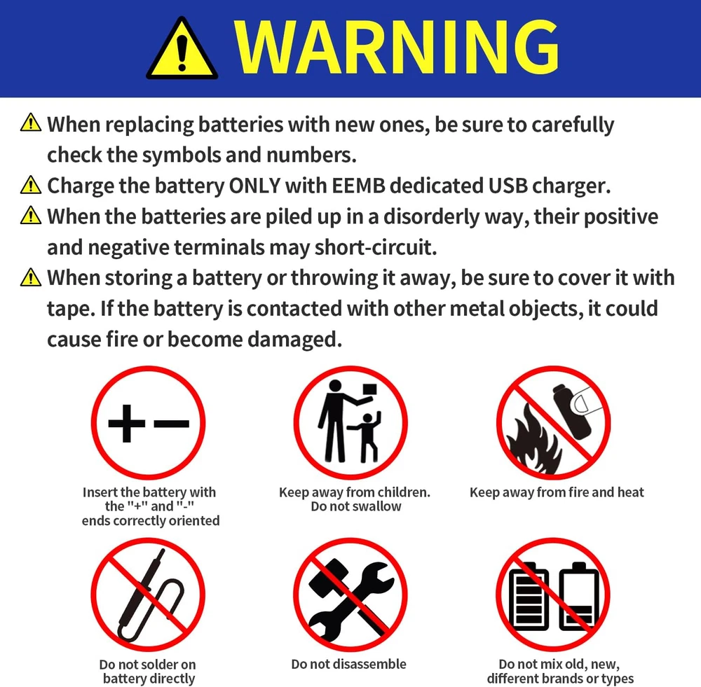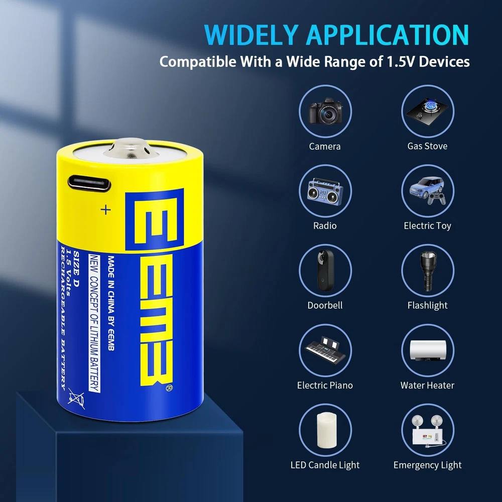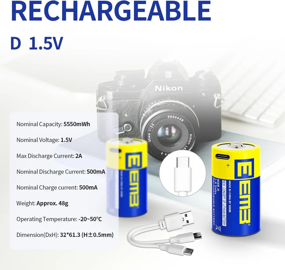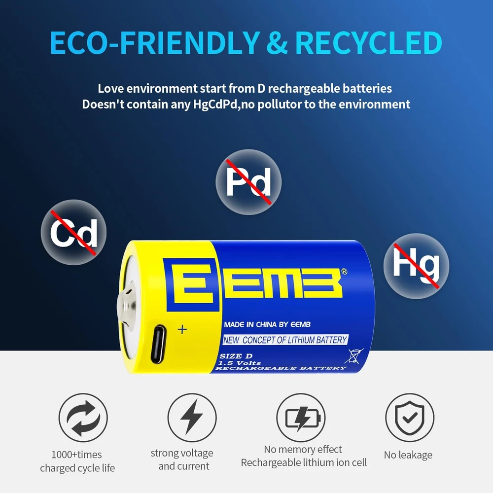✅D RECHARGEABLE BATTERIES: 1.5V USB li-ion D battery with high capacity, provide almost the same and steady voltage until the whole cell is depleted, long lasting in the devices. ✅MULTIPLE SAFE PROTECTION: Built-in integrated safety circuit protection intelligently controls the entire charging process to prevent overcharging, over-voltage, over-current, over-discharge, reverse charging protection. No memory effect. When the battery is fully charged, it will automatically stop charging. ✅CHARGER CABLE INCLUDED: EEMB Rechargeable lithium ion d cell batteries with 2-in-1 USB charging cable for fully charge in around 1.5 hours. You can charge 2 packs lithium ion D batteries at the same time. LED indicator shows charging status. ✅SAVING & ECO FRIENDLY: Mercury, Cadmium and lead are not used in these batteries; The D batteries can be recharged 1000+ times, saving thousands of alkaline batteries and reducing a significant about of landfill waste.Whether in home or outdoor, you can simply charge it with single USB port. ✅USB BATTERY WIDELY APPLICATION: Same as regular d cell 1.5V batteries. Ideal for most of device. Recommend use to large flashlight,radio receivers and transmitters etc. Product Description APPLICATION EEMB batteries are widely used in household devices like digital cameras, toys, remote controls, hand held games, 2-way radios, PDAs, flashlights, alarm-clock, LCD-TVs, Toothbrushes, Shavers, battery lights and other devices that need AA battery. 1.5V D Batteries Rechargeable Nominal Capacity: 5550 mWh Nominal Voltage: 1.5 V Maximum Discharge Current: 2 A Nominal Discharge Current: 500 mA Nominal Charge Current: 500 mA Weight: Approx. 48 g Working Temperature: -20-50℃ Dimension(DXH): 32x61.3 mm(H±0.5mm)