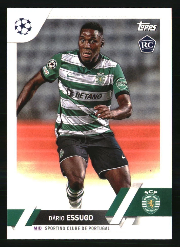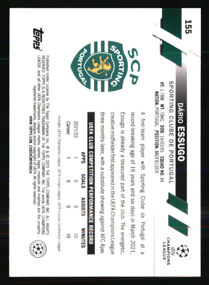Season: 2022 Manufacturer: Topps Card Number: 155 Player|Athlete: Dário Essugo Autographed: No Team: Sporting Clube de Portugal Year Manufactured: 2022 Set: 2022-23 Topps UEFA Club Competitions Graded: No Features: RC Type: Sports Trading Card Sport: SOCCER