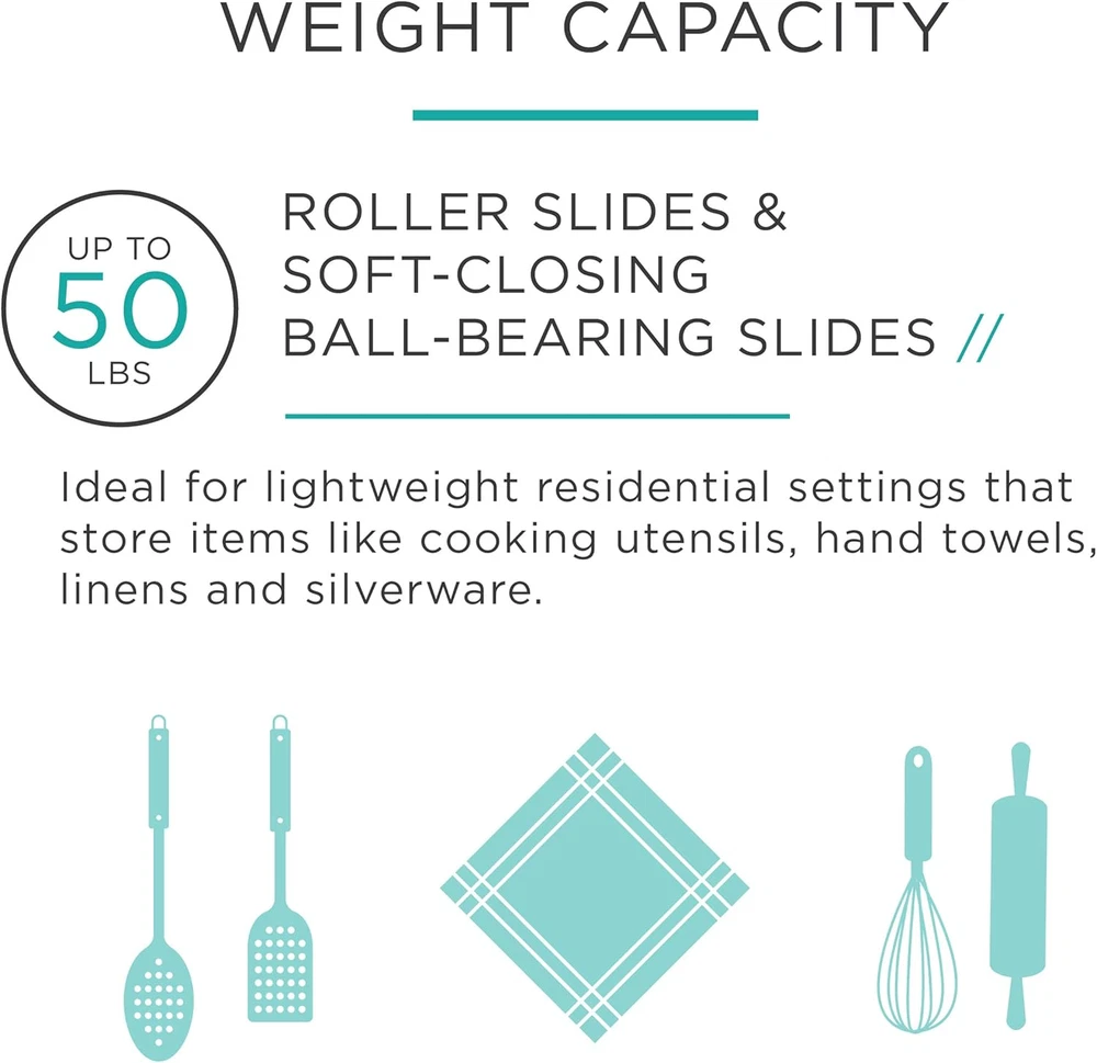 Made from stamped steel with a white epoxy finish Self-closing functionality ensures that drawers stay firmly closed Rated for normal-duty use (loads up to 50 lbs) 3/4 extension opening allows for the majority of the drawer to be accessed Detailed instructions and mounting hardware are included. Maximum Expandable Length (in.) 12.5 Product Description 16-Inch Bottom Mount Drawer Slide. From the Manufacturer 16-Inch Bottom Mount Drawer Slide.