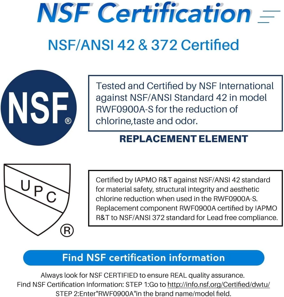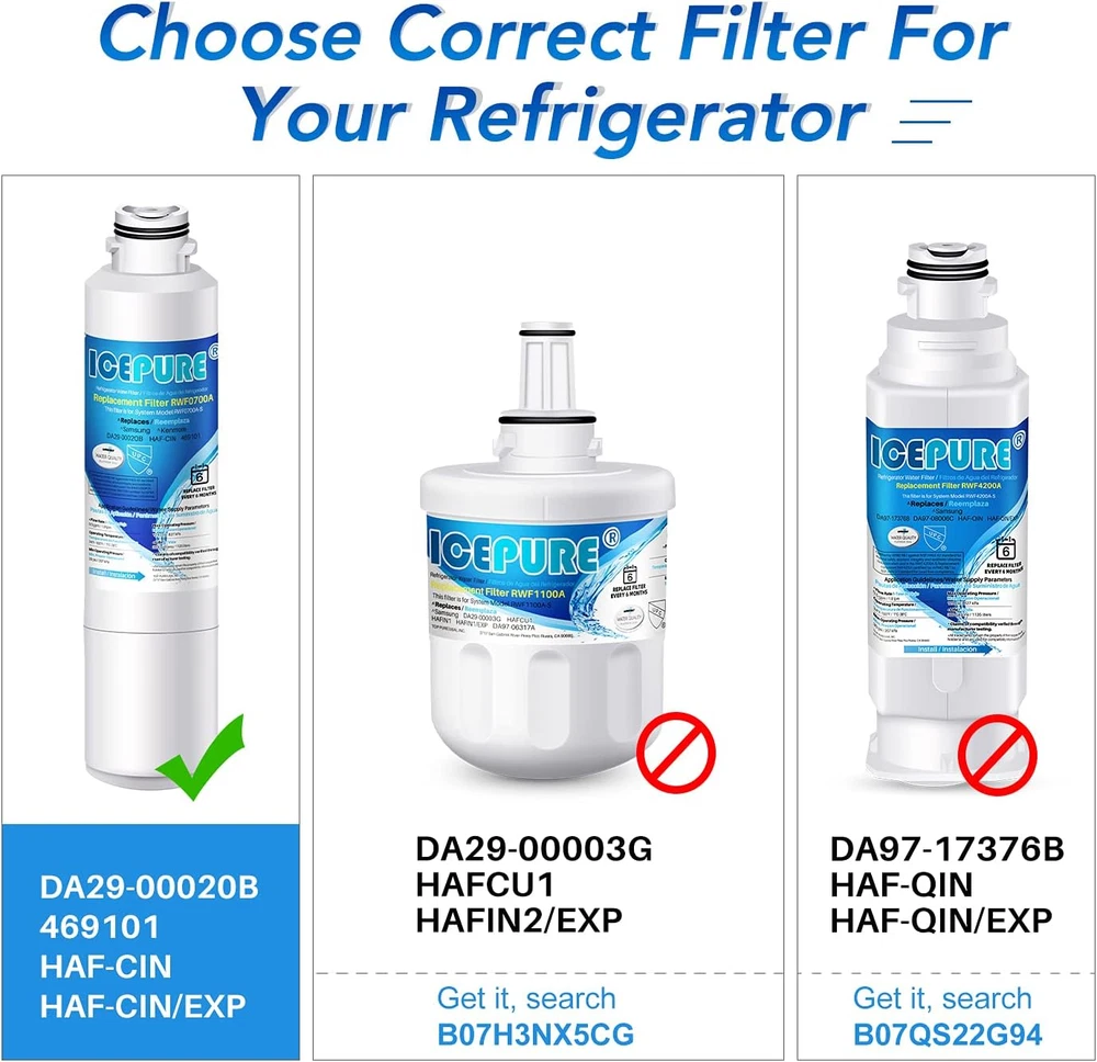 Authoritative Certifications- ICEPURE RWF0700A replacement for Samsung DA29-00020B refrigerator water filter bears major Authoritative Certifications on markets, such as NSF/ANSI 42 and NSF/ANSI/CAN 372, European Food Grade Regulations EC-1935/2016, ROHS, REACH, BPA-Free, TUV and Australian Water Mark. Efficient Filtration Capacity - ICEPURE RWF0700A refrigerator water filter replacement for HAF-CIN reduces substances from your water including 99% of Chlorine, taste, THM, VOCs, Particles, and all other major impurities, significantly improving the taste of drinking water to provide pure-tasting water, while retaining minerals beneficial to the human body. Premium Materials - BPA-free and food-grade materials. This filter is made from advanced coconut shell carbon and is Certified by Authoritative Organizations for Materials. The Outer layer is 0.5 Micron, ensuring better filtration. The carbon blocks have been independently tested by a third-party laboratory for heavy metals, large sediments, and other impurities. Compatible Models-Samsung DA29-00020B, DA29-00020A, HAF-CIN, HAF-CIN-EXP, HAF-CINEXP, HAFCIN, 04609101000, 09101, 46-9101, DA-97-08006A, DA97-08006A/B, DA29-00019A, DA2900020A, RF28HMEDBSR, RFG298HDRS, RS25J50, RF263TEAES, RF4287HARS. RWF1011,ClearWater Filters CWMF021, PF7,RFC0700A,WF294,LP-300P,DWF-7,R-9101,EBL7800,AQF-DA29-00020B, BCF94, WFC1401,PL-200,WFC1401,KJ20BMP,FL-RF27,Waterspecialist WS627B, MB-00020B.WD-DA29-00020B,CF7 da29-00020b, PP-RWF0700A, GOLDEN ICEPURE RWF0700A, EFF-6003A. Fit Models-RF28HDEDBSR, RF28JBEDBSG, RF28HFEDBSR, RF261BEAESR, RF263BEAESR, RF263BEAESG, RF263TEAESG, RF25HMEDBSR, RF4287HARS, RH22H9010SR, RF23J9011SR, RS25J500DSG, RS25H5111SR, RF23HCEDBWW, RF25HMEDBSG, RF25HMEDBSR, RF28JBEDBSG, RF4267HARS, RF263TEAESG, RH22H9010SR, RF28HDEDBSR, RS25H5111SR, RF4289HARS, RF4287HARS/XAA, RF4287HABP, RF4287HAWP, RF4267HABP, RF4267HAWP, RFG298HDRS, RFG298HDWP, RFG298HDRS, RFG298HDPN, RFG298HDBP, RFG297HDPN, RFG297HDBP, RFG297HDWP, RFG297HDRS. ICEPURE is an independent brand. High standards- ICEPURE water filters use US technology and teams. The ICEPURE brand has high requirements for products, and every product that is manufactured must go through 5 inspection and testing stages, ensuring that every product meets our high expectations. Leak-free Design- ICEPURE filters use advanced and precise measurement technology, combined with 3D multi-dimensional design technology to ensure that our products fully match and do not leak water. Experienced and professional - ICEPURE is a professional brand that is committed to the water treatment industry. For the past 20 years, Our products have been sold all over the world, and countless families have used our products as their solution. Easy to Replace- This filter can easily be installed without tools. For optimum performance we recommend that you change your filter every 6 months or 300 gallons, whichever comes first, this will vary based on your water quality. Product Description The video showcases the product in use. The video guides you through product setup. The video compares multiple products. The video shows the product being unpacked. 1 Authorized Certification 2 Premium Filtration 3 High Quality Materials 4 Good Taste 1 Long Service Life 2 Perfect Fit ICEPURE Refrigerator Water Filter Replacement for Following Models Samsung DA29-00020A, DA29-00020B, DA2900020A, DA2900019A, DA29-00019A, DA-97-08006A, DA-97-08006A-B, DA-97-08006B, DA97-08006A-B, HAF-CIN, HAF-CIN-EXP, HAF-CINEXP, HAFCIN Kenmore 46-9101, 469101, 9101, 04609101000, 09101 RF263BEAESR/AA, RF28HMEDBSR/AA, RF263BEAESG, RF28JBEDBSG, RF28HFEDTSR, RF28K9380SR, RF4287HARS Other MODELS: WD-DA29-00020B, PL-200, CF7, RWF0700A, EFF-6027A, CWMF021, PF7, R-9101, RWF1011, WLF-20BN, WFC1401, AB-5698, WF294, EBL7800, EP-2900020B, RFC-P07 RFC0700A, AQF-DA29-00020B, FL-RF27, WS627B, MB-00020B-P. Compatible Refrigerator Models: RF4287HARS/XAA, RF263TEAESR, RF23J9011SR, RF323TEDBBC, RF323TEDBSR, RFG298HDRS, RS261, RS265, RF4267HABP, RFG297HDPN, RFG29PHDRS, RFG29PHDWP, RS267TDPN, RF22K9381SG, RF22K9381SR, RF22K9581SG, RF22KREDBSG, RF22KREDBSR, RF22M9581SG, RF23HCEDBBC, RF23HCEDBSR, RF23HCEDBWW, RF23HCEDTSR, RF23HSESBSR, RF23HTEDBSR, RF23J9011SG, RF24FSEDBSR, RF25HMEDBBC, RF25HMEDBSG, RF25HMEDBSR, RF25HMEDBWW, RF260BEAEBC, RF260BEAESG, RF260BEAESP, RF260BEAESR, RF260BEAEWW, RF261BEAEBC, RF261BEAESG, RF261BEAESP, RF261BEAESR, RF261BEAEWW, RF263BEAEBC, RF263BEAESG, RF263BEAESP, RF263BEAESR, RF263BEAEWW, RF263TEAEBC, RF263TEAESG, RF263TEAESP, RF263TEAEWW, RF265BEAESG, RF265BEAESR, RF26HFENDSR, RF26J7500BC, RF26J7500SR, RF26J7500WW, RF28HDEDBSR, RF28HDEDPWW, RF28HDEDTSR, RF28HFEDBBC, RF28HFEDBSG, RF28HFEDBSR, RF28HFEDBWW, RF28HFEDTBC, RF28HFEDTSR, RF28HMEDBBC, RF28HMEDBSR, RF28HMEDBWW, RF28HMELBSR, RF28JBEDBSG, RF28JBEDBSR, RF28K9070SG, RF28K9070SR, RF28K9380SG, RF28K9380SR, RF28M9580SG, RF28M9580SR, RF30HBEDBSR, RF30HDEDTSR, RF30KMEDBSG, RF30KMEDBSR, RF31FMEDBSR, RF31FMESBSR, RF323TEDBWW, RF32FMQDBSR, RF34H9950S4, RF34H9960S4, RH22H9010SG, RH22H9010SR, RH25H5611BC, RH25H5611SG, RH25H5611SR, RH25H5611WW, RH29H9000SR, RS25H5000BC, RS25H5000SR, RS25H5000WW, RS25H5111BC, RS25H5111SG, RS25H5111SR, RS25H5111WW, RS25H5121BC, RS25H5121SR, RS25H5121WW, RS25J500DBC, RS25J500DSG, RS25J500DSR, RS25J500DWW, RF22K9581SR, RF28HDEDPBC, RF28HFEDTSG, RF28K9580SG, RF28K9580SR, RF31FMEDBBC, RF31FMEDBWW, RF32FMQDBXW, RH29H8000SR, RH30H9500SR, RF28HFEDTWW, RF26HFENDWW, RF26HFENDBC, RF4287HARS, RS265TDRS, RS261MDWP, RS261MDBP, RS263TDBP, RS265TDBP, RS267TDRS, RF4267HARS, RFG298HDBP, RSG307AARS, RFG297HDWP, RS261MDRS, RS265TDWP, RFG297HDRS, RFG29PHDBP, RFG298HDWP, RF4287HAWP, RS263TDWP, RF4287HABP, RFG297HDBP, RS263TDRS, RS267TDBP, RFG298HDPN, RFG296HDWP, RFG293HABP, RFG296HDRS, RFG296HDBP, RF6296HD, RFG29PHDPN, RF4267HAWP, RS267TDWP, RF4289HARS Note: That This is A Compatible Spare Part, The Manufacturer's Names, Part Numbers Have Been Used For Compatibility Information ONLY. ICEPURE is an ind