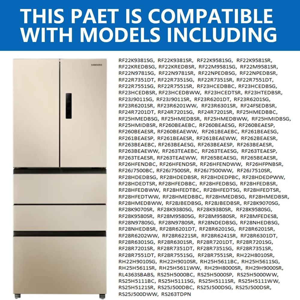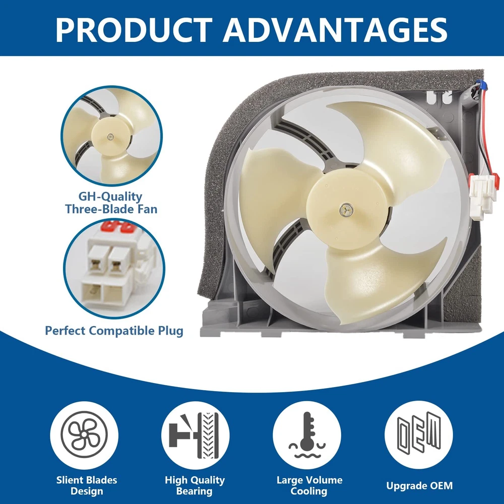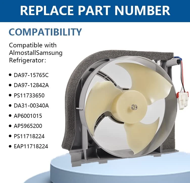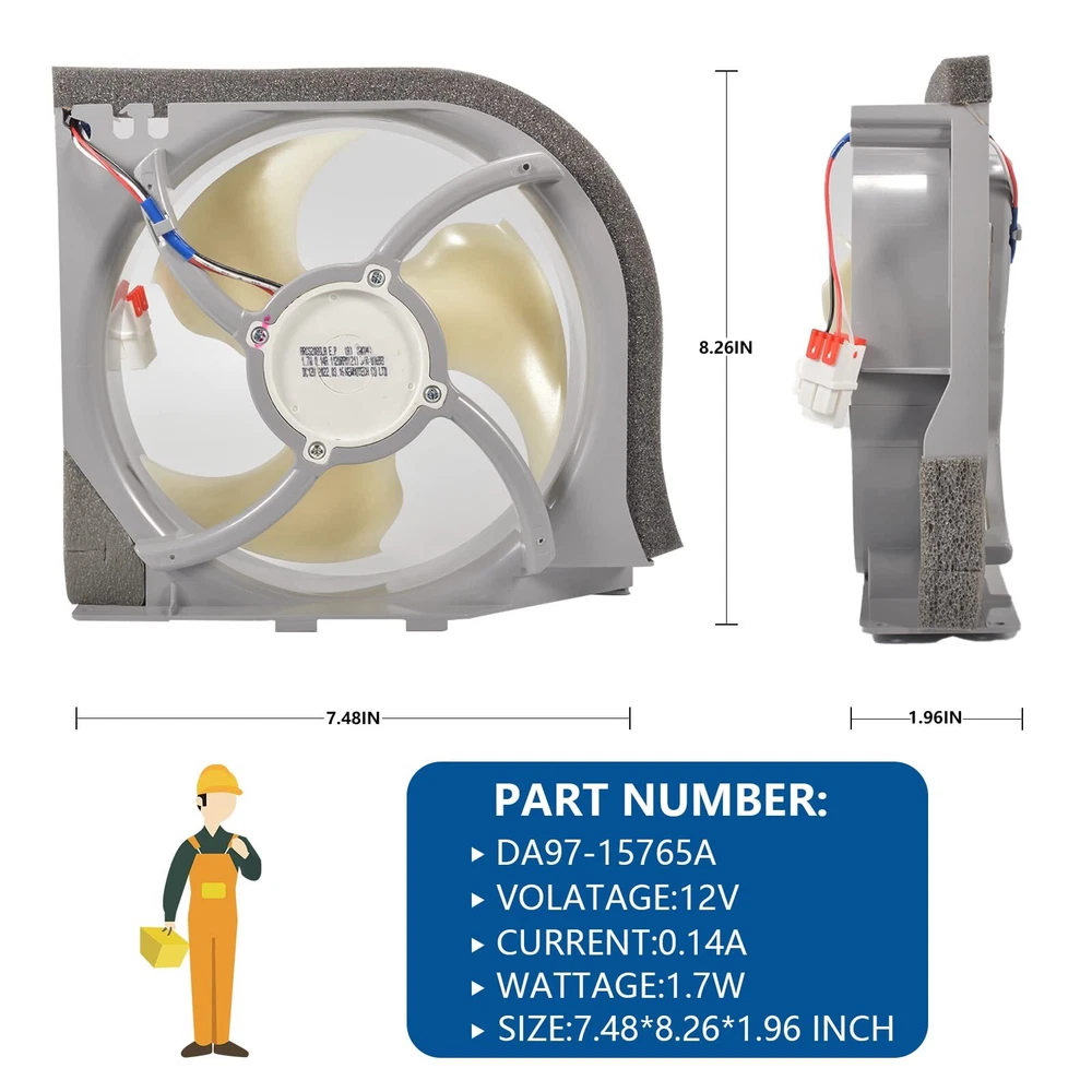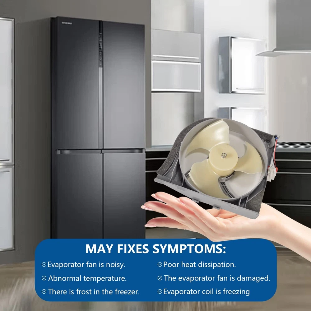 - Original Accessories (OEM), Verified OEM Fitment DA97-15765A Refrigerator Evaporator Motor Fan - Fix the following symptoms 1,Refrigerator isn't cooling 2, Freezer section is cold but fridge is not 3, Evaporator coils are covered in frost (frosty evaporator coils) 4, Icemaker not making ice 5, Unusual loud noise from the freezer Specification - Model: DA97-15765A - Product Size: 7.48 * 8.26* 2.36inches - Voltage: 12V - Current: 0.14A -Replaces part numbers: RH22H9010SR, RF23HCEDBSR, RF23HTEDBSR, RF263BEAEBC, RF263TEAEWW, RF263TEAESR, RF24FSEDBSR, RH25H5611BC RF28HFEDTSR, RF28K9070SR, RF30KMEDBSG etc. - Warm Tips: It works with Samsung refrigerators, please find a list of compatible models in the product description Package Included 1 x Refrigerator Evaporator Motor Fan PRODUCT INFORMATION -DA97-15765A Refrigerator Condenser Fan Replacement Models: DA97-15765A, DA97-15765C, DA31-00340A, DA97-12842A, DA97-12842D, RMF002ASSA, AP6001015, PS11733650, EAP11733650, etc. PRODUCT FEATURES - A97-15765A Refrigerator condenser fan circulates air in the fresh room for efficient cooling. Perfectly solves a series of problems such as abnormal refrigerator temperature and abnormal fan motor noise. Easy to install. You can solve it by yourself and enjoy the fun of DIY repair. (Take pictures of your unit before disassembly, it will save the time of reassembly) COMPATIBLE MODELS - DA97-15765A Refrigerator condenser fan motor compatible models. RH22H9010SR, RF23HCEDBSR, RF23HTEDBSR, RF263BEAEBC, RF263TEAEWW, RF263TEAESR, RF24FSEDBSR, RH25H5611BC RF28HFEDTSR, RF28K9070SR, RF30KMEDBSG etc. MAKE YOUR REFRIGERATOR RUN LIKE NEW- Fix the following symptoms. 1. Refrigerator not cooling; 2. Freezer is cold but refrigerator is not; 3. Evaporator coils covered with frost; (Evaporator coils frosted) 4. Ice maker not making ice; 5. Unusual rattling sound from freezer.