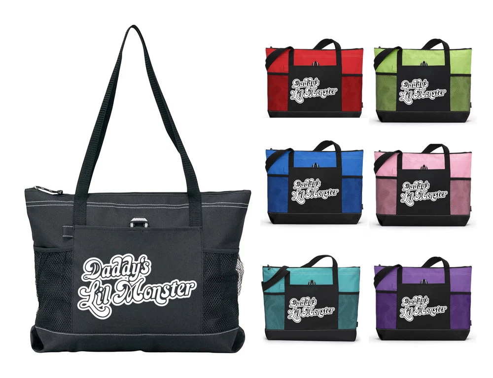 DADDY'S LIL MONSTER ZIPPERED GEMLINE TOTE YOUR CHOICE OF COLOR TOTE COLOR VERY NICE AND DURABLE GREAT TO USE FOR OVERNIGHT BAGS, PURSES, TRIPS TO THE LAKE OR BEACH, CAMPING, SPORTS BAG, GYM AND SO MUCH MORE THE DESIGN IS HEAT PRESSED VINYL AND WILL BE DONE IN WHITE BAG SPECS: 600-denier polyester 29½" Black webbing shoulder straps Zippered main compartment Front pocket with pen loop Two side mesh pockets Back panel is Black 20"W x 14"H x 4"D If you have a design request feel free to send us a message. We will work to see what we can do for you. Thanks! We try to ship out our items as quick as possible, but with made to order items it could take up to 5 days for the item to be completed and shipped. We thank you for your patience. DESIGN MAY BE SLIGHTLY ENLARGED TO SHOW DETAIL. DESIGNS WILL NOT EXCEED 6.5 INCHES EITHER IN WIDTH OR LENGTH. Be sure to fully examine all pictures closely and read auction completely prior to placing a bid. If you have any questions please be sure to contact me and I will do my best to answers them. I do combine shipping! Please note that our post office is closed on Sat & Sun so we can only ship Mon-Fri. Paypal is the only form of payment we accept at this time. If ever there is a problem please contact us prior to leaving bad feedback. We strive for a 5 star rating. Thank You :-)