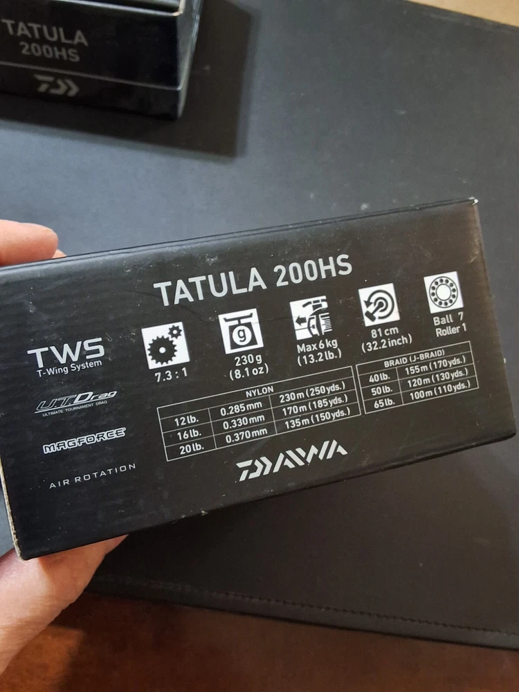 DAIWA TATULA TAT200HS BAITCAST REEL NEW IN BOX WITH INSTRUCTION/PART LIST AS PICTURED I BOUGHT THESE BRAND NEW 2 YEARS AGO AND NEVER TOOK THEM OUT OF THE BOXES. SHIPPED USPS GROUND ADVANTAGE