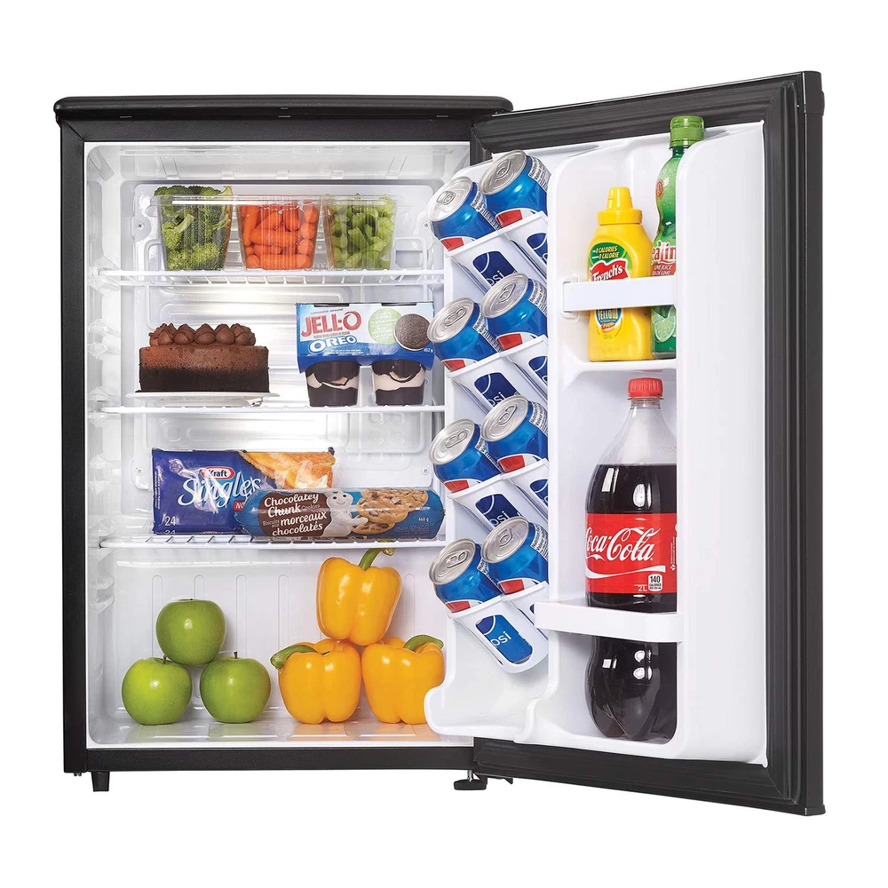The Designer line of compact refrigerators is dedicated to being well built, easily maintained and convenient. The DAR026A1BDD-6 model comes in at a height of just over two feet and features 2.6 cu. ft. (73 L) of cooling capacity. Quality can look good, with its sleek exterior, this is the ideal unit for floors and countertops, making it the perfect fridge for spaces such as dormitory rooms, wet bars, rec-rooms, dens, workshops and basement lounges. Integrated door shelving with tall bottle storage makes storing all your additional drinks and snacks easy. Accessories can be stored on the scratch-resistant worktop and there’s no need to defrost the unit as it’s done automatically. This appliance also comes with a mechanical thermostat and offers 2.5 strong wire shelves for maximum storage versatility and optimal cool air circulation. Both left and right-handed users will love the convenient reversible door swing and the integrated door handle. This mini fridge is designed to blend with any decor style seamlessly. Compact Mini Fridge: This Designer Mini Fridge is the perfect size to fit countertops, desktops or floor and is an ideal mini fridge for your bedroom, office, or dorm 2.6 Cubic Feet (73 Liters) Capacity: The All refrigerator unit is small but mighty with 2.6 cu. ft. of fridge space Integrated Door Shelving: Tall bottle storage is ideal for large pop, water, juice, or other drink bottles CanStor Beverage Dispensing System: Efficient and tidy can storage integrated into the mini refrigerator door Clean Bright and Modern: White interior, integrated door handle and functional textured scratch resistant worktop Fits anywhere: Smooth back design with no bulky exposed components means this small mini fridge can fit just about anywhere in your room Versatile: 2 full width and 1 - 1/2 width adjustable wire shelves for undisrupted air circulation and reversible door hinge Easy to Operate: Automatic defrost and mechanical thermostat means no extra maintenance on your part Environmentally Friendly: Energy Star compliant and uses environmental-friendly R600a refrigerant
