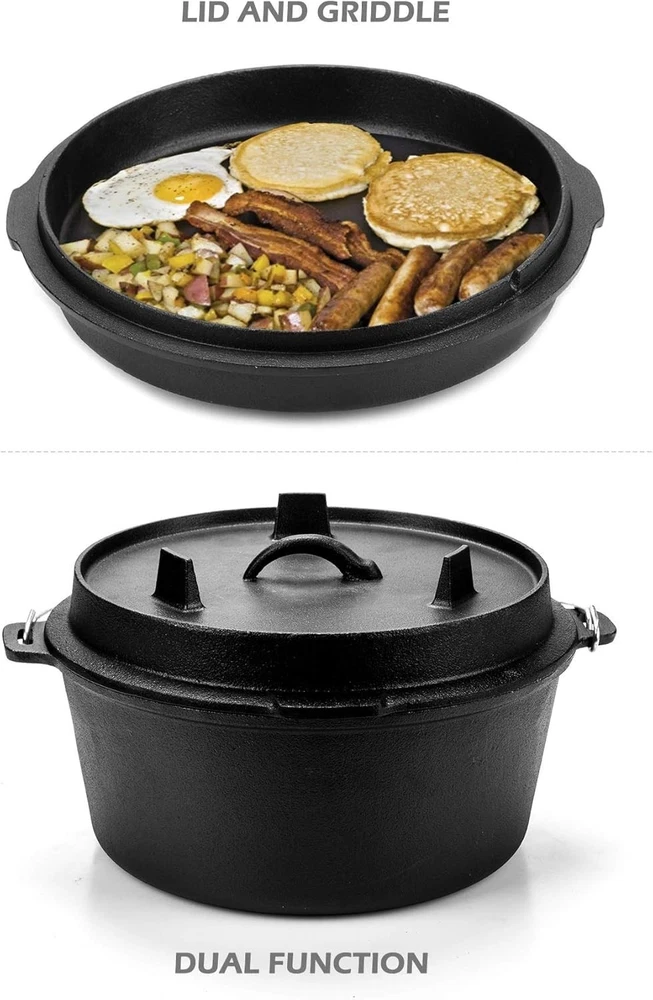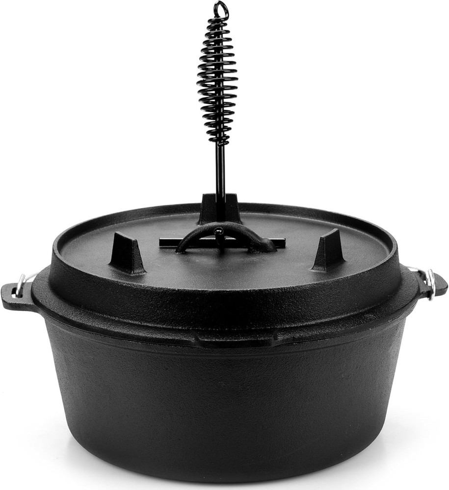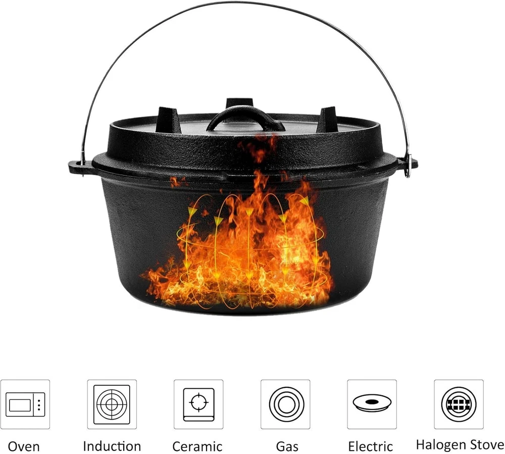 DARTMOOR 9 Quart Pre-Seasoned Cast Iron Dutch Oven with Lid and Lid Lifter Tool Outdoor Deep Camp Pot for Camping Fireplace Cooking BBQ Baking Campfire 9 QT Description: CAST IRON CONSTRUCTION IN SEASONED FINISH, constructed of cast iron and processed with seasoned finish technologies, this deep camp Dutch oven is sturdy enough to stand up to extreme outdoor environment. DOUBLE AS A SKILLET OR GRIDDLE, lid with legs can be used as a skillet/griddle, allowing you to enjoy fry food even in camping. CHEMICAL-FREE PLANT OIL COAT, chemical-free plant oil coat brings non-stick using experiences, safeguarding your health without compromising convenience. USER-FRIENDLY DESIGN, deep dish lid increases air flow for even cooking; convenient loop handle on lid makes this pot easy to carry around; built-in thermometer notch for detecting food temperature. DUTCH OVEN LID LIFTER INCLUDED, comes with a Dutch oven lid lifter for your safety and convenience.