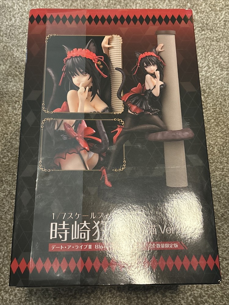 The DATE A LIVE Kadokawa Kurumi Tokisaki Limited Black Cat Ver. 1/7 Scale Figure is a Japanese collectible from the anime and manga series. Produced in 2019 by Kadokawa, the detailed figure features the character Kurumi Tokisaki in a black cat costume. This officially licensed merchandise is a part of the DATE A LIVE franchise and is a sought-after item for fans of the TV show and anime genre.