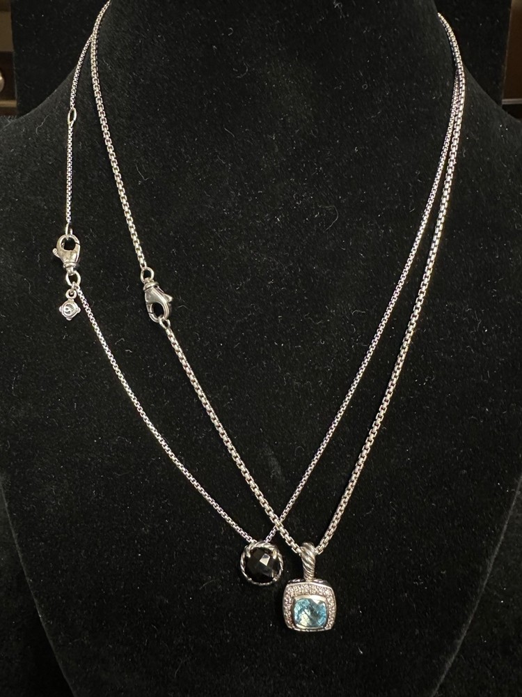 TWO GORGEOUS DAVID YURMAN NECKLACES IN EXCELLENT PRE-OWNED CONDITION. BOTH HAVE BOX CHAINS AND LOBSTER CLOSURES THAT FUNCTION PROPERLY. ONE IS CIRCULAR AND HAS A FACETED ONYX STONE IN BEAUTIFUL CONDITION. THE OTHER IS A SQUARE PETIT ALBION TOPAZ SURROUNDED BY PAVE DIAMONDS ALSO IN EXCELLENT CONDITION. PLEASE VIEW ALL PHOTOS FOR MEASUREMENTS AND CONDITION5.