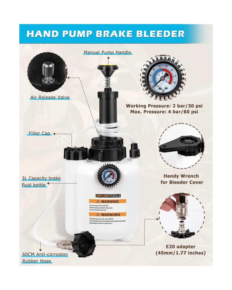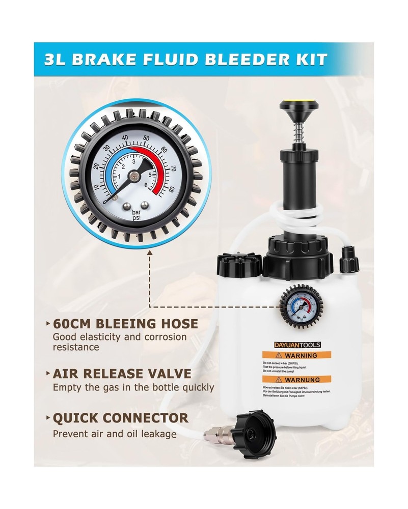 DAYUAN 3L Hand Brake Fluid Bleeder Bleeding One Man Tool Kit for Most European Models Description Features: Made of sturdy plastic, this brake bleeder is ideal for home use. It can absorb three liters of liquid and is thus used in European car models. The sturdy plastic makes it not only easy to clean, but also robust and facilitates brake bleeding on a wide variety of vehicle types Quick release and locking chuck with Euro ports Standard Adapter E20(45mm, 1.8") for most European Models Capacity of 3 liters with 1L suction tank Including detailed description and safety instructions Product Details: Manufacturer: Yinyuan Tools Brand: DAYUAN Item Weight: 3.63 pounds Package Dimensions: 17.01 x 7.44 x 7.05 inches Item model number: YT-85430 Manufacturer Part Number: YT-85430 Date First Available: August 21, 2023 Delivery We Do Not Ship Outside of the Continental US. Return Policy All items qualify for returns within 30 days of receipt. Buyer is responsible for return shipping on any item that is not damaged. Feedback We take our reputation seriously, we buy and sell online, so we understand the value of trust. If you are unsatisfied with your order, please contact us and we will work with you to resolve it to your satisfaction.