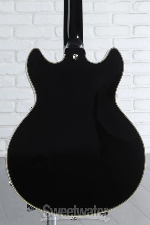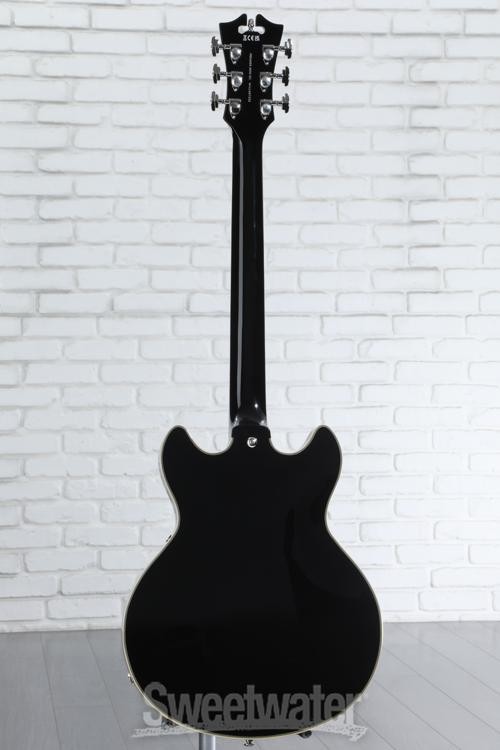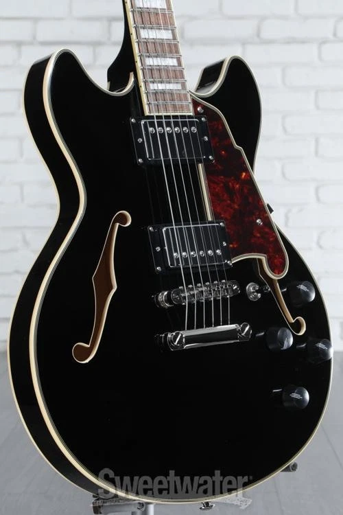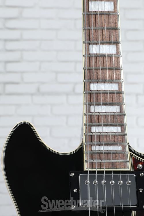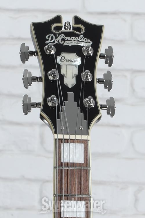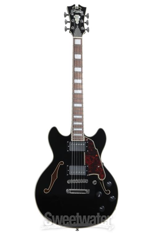 D’Angelico Quality in a Smaller Semi-hollow The D’Angelico Premier Mini DC is a highly playable semi-hollowbody electric guitar with killer tone and eye-popping visuals. The Premier Mini DC’s smaller semi-hollowbody is extremely comfortable and yields a bright, rich, resonant sound with loads of bite and sustain, while a solid center block ensures feedback-free performance. Equipped with a pair of D’Angelico humbucking pickups, the Premier Mini DC delivers that gorgeous alnico antiquity with some serious definition. Navigating this guitar’s comfortable, fast “C”-shaped neck is effortless as your fingers dance on its smooth bound walnut fingerboard. To complete the jazzy retro authenticity, the Premier Mini DC boasts high-end aesthetic touches, including mother-of-pearl headstock inlays, ebony control knobs, Stairstep tuners, and a Scalini pickguard. If you’re on the hunt for a cross-genre do-it-all semi that will ace any live gig or studio session, the D’Angelico Premier Mini DC deserves your serious consideration.Reduced-size body, Sweetwater is an Authorized D'Angelico Dealer Genuine New Item Sweetwater's 2-year warranty and 55 point inspection D'Angelico Premier Mini DC Electric Guitar - Black with Stopbar Tailpiece Semi-hollowbody Electric Guitar with Maple Body and Neck, Walnut Fingerboard, and 2 Humbucking Pickups - Black D’Angelico Quality in a Smaller Semi-hollow The D’Angelico Premier Mini DC is a highly playable semi-hollowbody electric guitar with killer tone and eye-popping visuals. The Premier Mini DC’s smaller semi-hollowbody is extremely comfortable and yields a bright, rich, resonant sound with loads of bite and sustain, while a solid center block ensures feedback-free performance. Equipped with a pair of D’Angelico humbucking pickups, the Premier Mini DC delivers that gorgeous alnico antiquity with some serious definition. Navigating this guitar’s comfortable, fast “C”-shaped neck is effortless as your fingers dance on its smooth bound walnut fingerboard. To complete the jazzy retro authenticity, the Premier Mini DC boasts high-end aesthetic touches, including mother-of-pearl headstock inlays, ebony control knobs, Stairstep tuners, and a Scalini pickguard. If you’re on the hunt for a cross-genre do-it-all semi that will ace any live gig or studio session, the D’Angelico Premier Mini DC deserves your serious consideration. Reduced-size body, fast neck, and silky fingerboard Playing the D’Angelico Premier Mini DC is sheer joy. It features a reduced-size laminated maple body with a laminated maple top and a solid center block for maximum tone and sustain. Its maple neck boasts a comfortable “C” profile for the perfect blend of grip and ease of movement. The hearty walnut fingerboard offers a 14-inch radius and 22 frets unfolding over a 24.75-inch scale length that facilitates complex chording and taxing leads. Sweetwater guitarists discovered that the walnut fingerboard makes bends and vibrato feel effortless, while the double-cutaway body shape actively improves high-register access. The Premier Mini DC is equipped with Stairstep tuners, a NuBone XL nut, and a high-quality stoptail bridge assembly, all providing rock-solid tuning stability while increasing sustain and eradicating string binding to provide a dependable playing experience. Balanced and beautiful vintage tone The Premier Mini DC’s vintage-sounding D’Angelico humbuckers burst to life with proper attributes for compelling performances. The pickups’ warm soulfulness sprinkles jazzy flavor into clean tones, while the hum-canceling attributes provide an efficient platform for overdrive and distortion. Sweetwater’s product experts were pleasantly taken aback by how well these pickups handle drive, distortion, and dirty amps. Push the pickups, then note how the Premier Mini DC’s slim size and maple build take on heightened touch-sensitive traits that would be perfect for genres such as garage rock, country, and electric blues. Moreover, each pickup has its own volume and tone knob to let players execute dramatic tone changes with a simple flip of the 3-way selector switch. The D’Angelico legacy After mastering his craft during an 18-year apprenticeship, luthier John D’Angelico opened his own shop in Manhattan’s Little Italy in 1932. Catering to New York’s many jazz musicians over the ensuing three decades, D’Angelico and a single apprentice became New York’s foremost stringed instrument builders, creating over one thousand treasured archtop guitars until John’s death in 1964. After his passing, the D’Angelico legacy lived on only through his rare, legendary instruments. After decades, the D’Angelico brand has resurfaced, bringing back the playability and attention to detail of the company’s New York roots. Today, Sweetwater is delighted to offer this fine line of distinguished instruments. D’Angelico uses state-of-the-art manufacturing processes and the finest available materials to create playable works of art for today’s guitarists. From a modest shop in Little Italy to the world stage, D’Angelico’s dedication to quality craftsmanship ensures that this brand won’t go dormant again. D’Angelico Guitars Premier Mini DC Features: Laminated maple top, back, and sides yield bright, resonant tone with an energetic feel Solid center block effectively keeps feedback at bay Maple set neck, “C” profile, topped with a bound walnut fingerboard and block inlays Smooth-playing 24.75-in. scale length with 22 frets D’Angelico humbuckers provide hum-free output with wide-ranging versatility and warmth 3-way pickup selector toggle switch plus independent controls for each pickup Graph Tech NuBone XL nut, Tune-o-matic bridge, and stopbar tailpiece lock on and transmit the nuances of every note Gorgeous 5-ply body binding, 5-ply Scalini pickguard, Stairstep tuners, and ebony control knobs Specification Detail Number of Strings 6 Left-/Right-hande