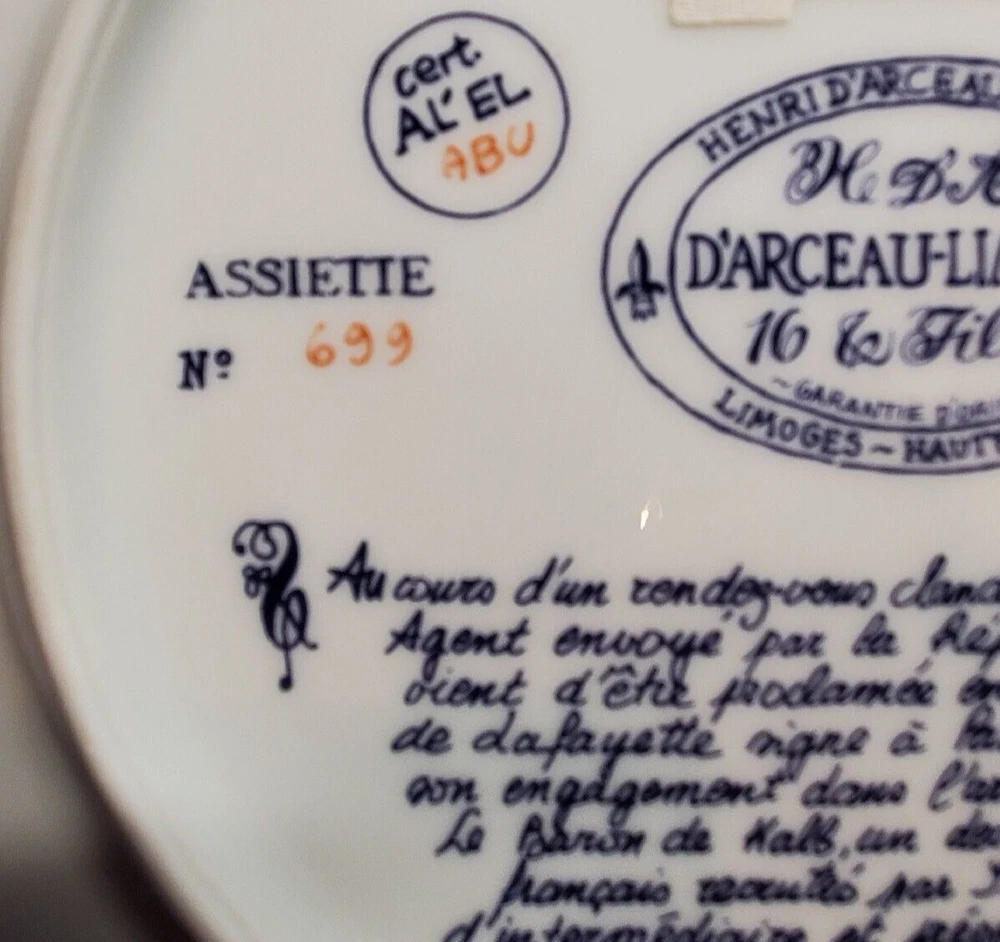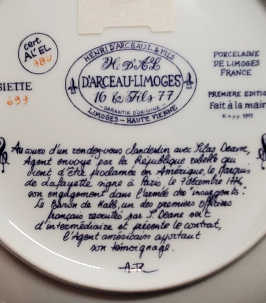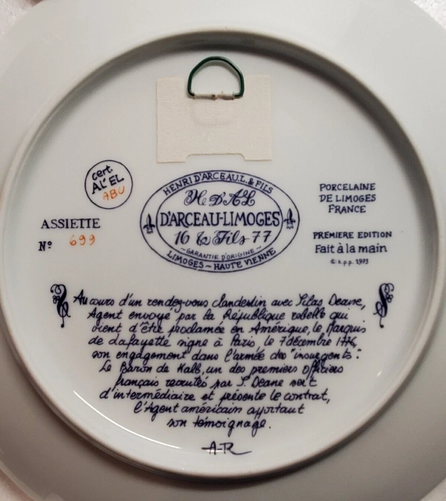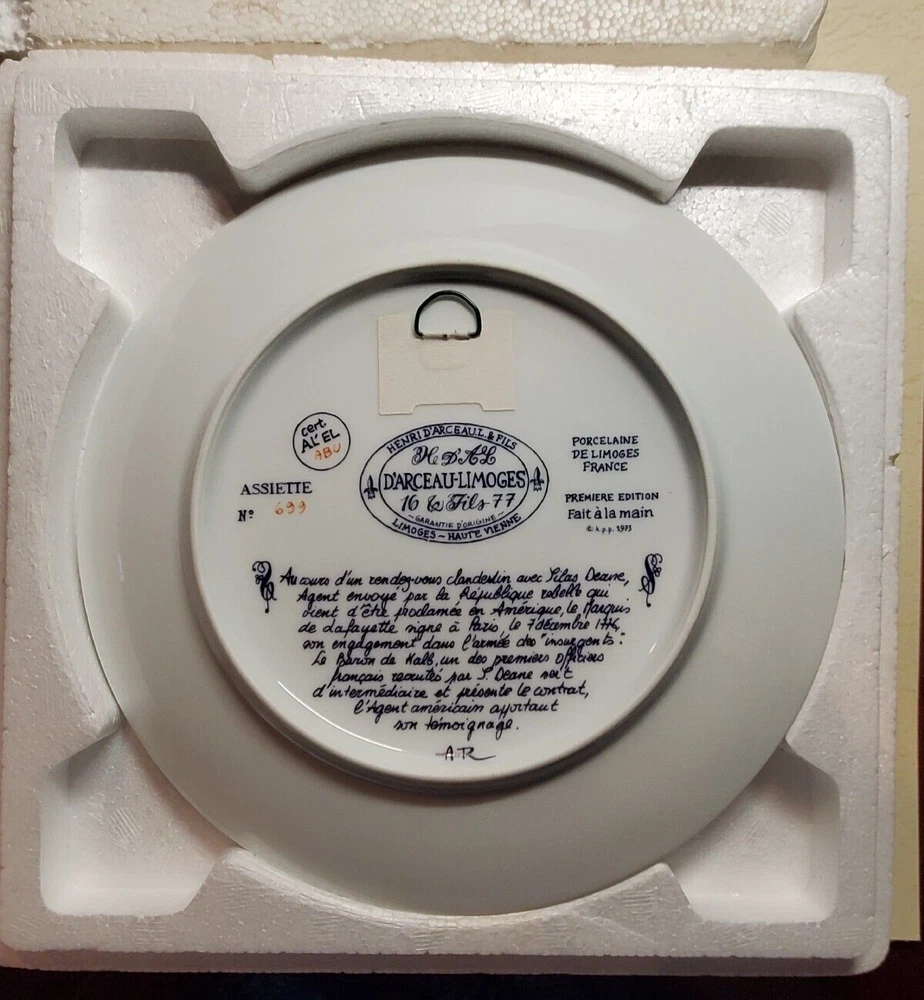 Vintage D'Arceau Limoges SECRET CONTRACT Collectors Plate. This collectible plate is part of a series of 6 plates from the 1970s. The plates reflected different scenes of the revolutionary war and have a story on the back written in French. Plate measures 8 1/2" across . Has no chips or cracks and comes in the original box as shown.