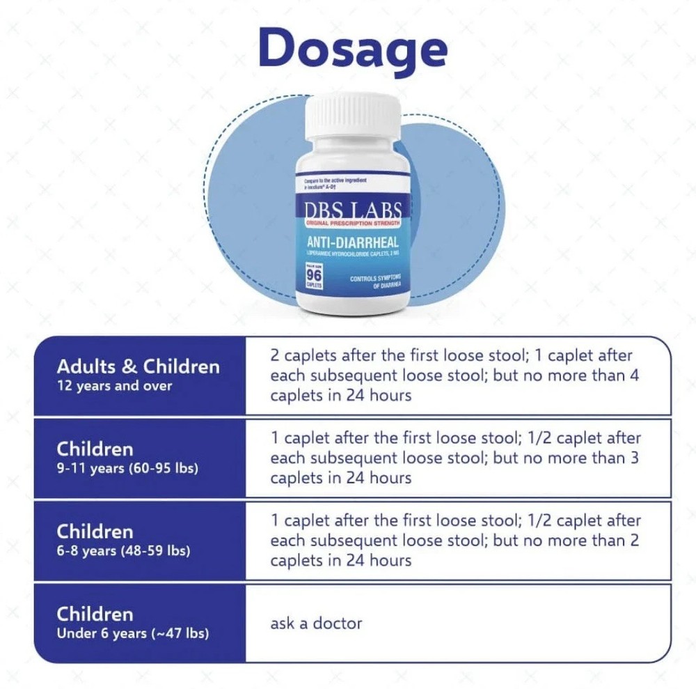 Ingredients: Not Specified Country of Origin: United States Brand: DBS LABS Main Purpose: Anti-Diarrheal Type: Nausea Treatment MPN: NOT SPECIFIED Ean: 0066424735027 Expiration Date: 07/04/2026 UPC: 0066424735027 Formulation: Caplet Active Ingredients: Loperamide Department: Adult LOT Number: Not Specified Size: Not Specified Dosage: 2 mg Number of Pills: 96 gtin13: 0066424735027 Body Area: Mouth, Small Intestines, Stomach