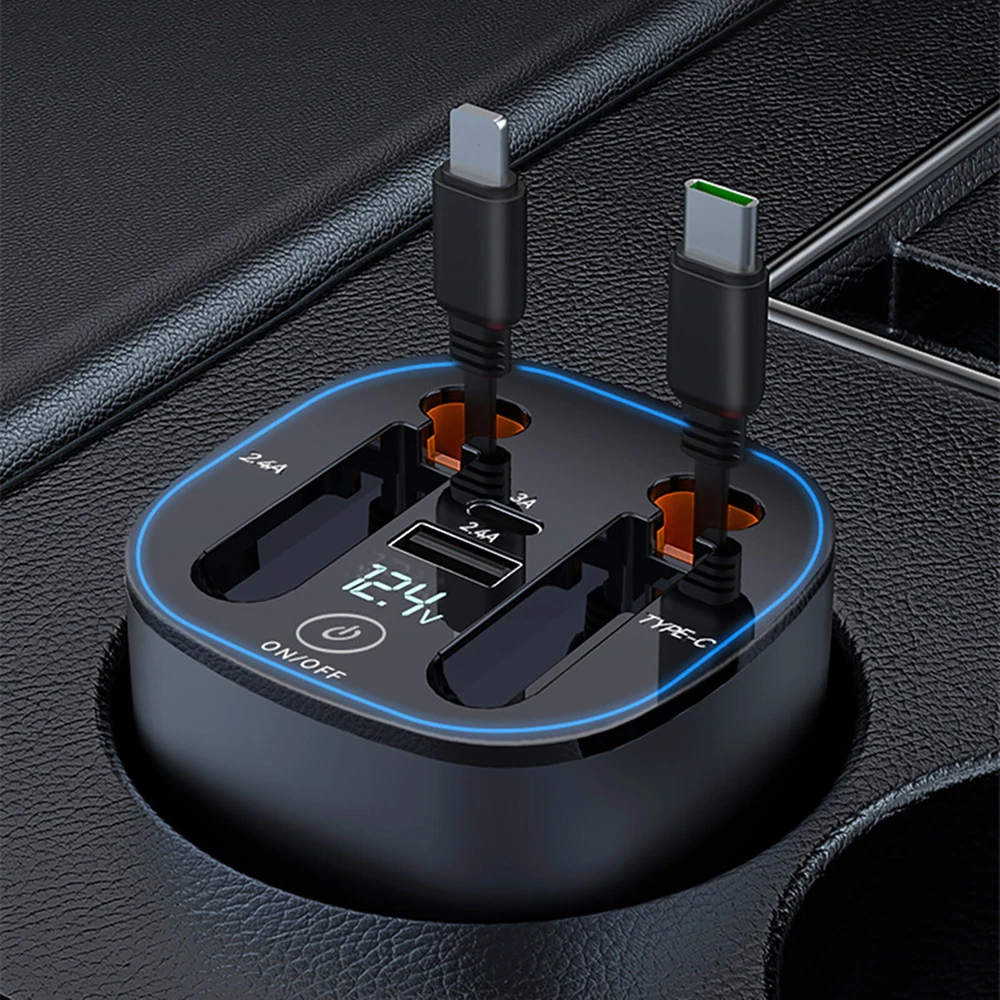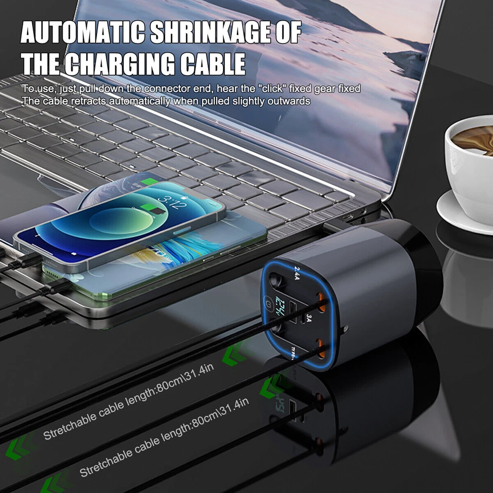 SAFE & SECURE SHOPPING 100% SATISFACTION GUARANTEED FAST SHIPPING Store Categories Store Categories You may also like DC 12-24V 100W 4IN1 USB Type-C Retractable Car Charger Phone Fast Charge Adapter Product Description Features: Four in one interface: Type-C cable+8 PIN cable+USB-C+USB-A four interface charging MAX 100W fast charging: Type-C expansion cable supports MAX 100W fast charging Comes with a retractable cable: Comes with an 80CM long retractable charging cable for easy storage and free adjustment of length Atmosphere lights: Three colors of atmosphere lights, embellishing the car space Aromatherapy compartment (aromatherapy tablets need to be provided by oneself): There is an aromatherapy tablet compartment at the bottom, where you can place your own aromatherapy tablets to freshen the car air Nylon woven cigarette lighter power cord Voltage display: Real time display of current voltage to understand changes in car voltage Specifications: Material: ABS+PC Extension line length: 80cm Input voltage: DC 12-24V Atmosphere light: blue, red, purple (can be turned off) Power output: TYPE-C: 5V/2A, 9V/2A, 12/1.5A. (Supports mobile phone charging display Max 100W) For iPhone: 5V/2.4A, USB: 5V/2.4A Package include: 1* Car multifunctional charger Shipping Returns Contact Us Payment Shipping We ship most of our orders within 24 hours, and may up to 48 hours. If you want faster shipping way, please contact us before making a payment. Sometimes due to problems with our transportation company system, your shipping information may be delayed to update. We recommend that you try again after 3-4 days. If you still haven't checked the shipping information, you can contact us via ebay message. Returns 1. 30 days warranty from the purchased date. Please contact us via email before returning the defective item. 2.Our warranty does not extended to any product that are physically damaged or that are not under normal operating conditions as result of misuse or improper installation on the buyer/user's part. 3.Return items should include the original packaging and all accessories. buyers MUST contact us for the returning address. 4.In all cases, buyers pay shipping fees at their own cost to return products for exchange or refund. We will be responsible for the postage of replacements. Refund will be made upon receipt of the returned item. Contact Us Pls contact us if you have any problems,we will try our best to solve for you Payment We accept all verified payment from eBay. Copyright © 2022 Tongtool