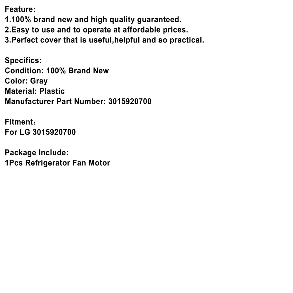You may also like DC12V Refrigerator Fridge Heat Sink Fan Motor For Midea ZWF-02-4 502404010024 22.85 USD Free shipping Refrigerator Evaporator Condenser Fan Motor Replacement For LG EAU61644102 20.76 USD 21.85 USD Free shipping 5% off Refrigerator Cooling Motor Accessories For Samsung ZWF-32-140 B17123.4-5(A1) 28.36 USD 29.85 USD Free shipping 5% off Replacement Control Jazz Board W10503278 AP6022400 For Whirlpool Refrigerator 33.85 USD Free shipping Refrigerator Evaporator Condenser Fan Motor DC 12V For Samsung DRCP3030LA 24.56 USD 25.85 USD Free shipping 5% off DC 12V Refrigerator Reverse Rotary Fan Motor For Hisense KBL-48ZWT05-1204B USA 21.85 USD Free shipping DC 12V Refrigerator Evaporator Cooling Fan Motor Replacement For LG EAU63103001 38.81 USD 40.85 USD Free shipping 5% off DC12V 0.3A Refrigerator Freezer Rotary Motor Fan Assy For Samsung 3612JL-04W-S49 20.85 USD Free shipping DC12V 2W Refrigerator Fan Motor For MeiLing Double Door Refrigerator ZWF-10-2 21.85 USD Free shipping DC 13V Refrigerator Evaporator Freezer Fan Motor For LG Refrigerator 4681JB1027A 22.66 USD 23.85 USD Free shipping 5% off DC 12V Refrigerator Freezer Heat Sink Fan Motor For Omar KBL-48ZWT05-1202A 21.85 USD Free shipping DC12V Refrigerator Fridge Freezer Evaporator Fan Motor For Samsung DREP3020LA 25.85 USD Free shipping Feature: 1.100% brand new and high quality guaranteed. 2.Easy to use and to operate at affordable prices. 3.Perfect cover that is useful,helpful and so practical. Specifics: Condition: 100% Brand New Color: Gray Material: Plastic Manufacturer Part Number: 3015920700 Fitment: For LG 3015920700 Package Include: 1Pcs Refrigerator Fan Motor -About US Founded in 2012, VIPJQ have professional development and sales, and are involved in various products, providing customers with various high-quality products. Since its establishment, VIPJQ has always adhered to the service concept of "customer first" and the management concept of "pursuit of quality", and is committed to providing customers with high-quality original designs. We commit to provide you the best innovative, quality products & professional services with competitive prices. We value every customer, and we look forward to providing solutions for your business needs to help your business achieve its goals, please contact us immediately! We are all about you! We are a Japanese seller,but with large warehouse in USA. We are profesional on Auto Parts,Car Parts,Motorcycle Parts,3C,other hot sale items and so on. We aim to provide to customers high quality product and best service. -About Shipment&Returns The item usually will be dispatched within 3 days after you ordered.All are free shipping. And it usually takes 3-10 working days to delivery depends on buyers' address or other majeure on the way. If you are not satisfied with the items and want to return the item,we hope you could message us first,we will give you the return details, we think we could give you the best service to save your time and money.Thank you. -About Feedback&Customer Service If you are enjoy your shopping here,not only enjoy the items but also the service,we are appreciate you could give us a 5-star feedback. If you are not satisfied with the item,before you give us the negative feedback,we hope we could give you the best solution through our commutication. We think we could do it if you give us the chance.Thank you.