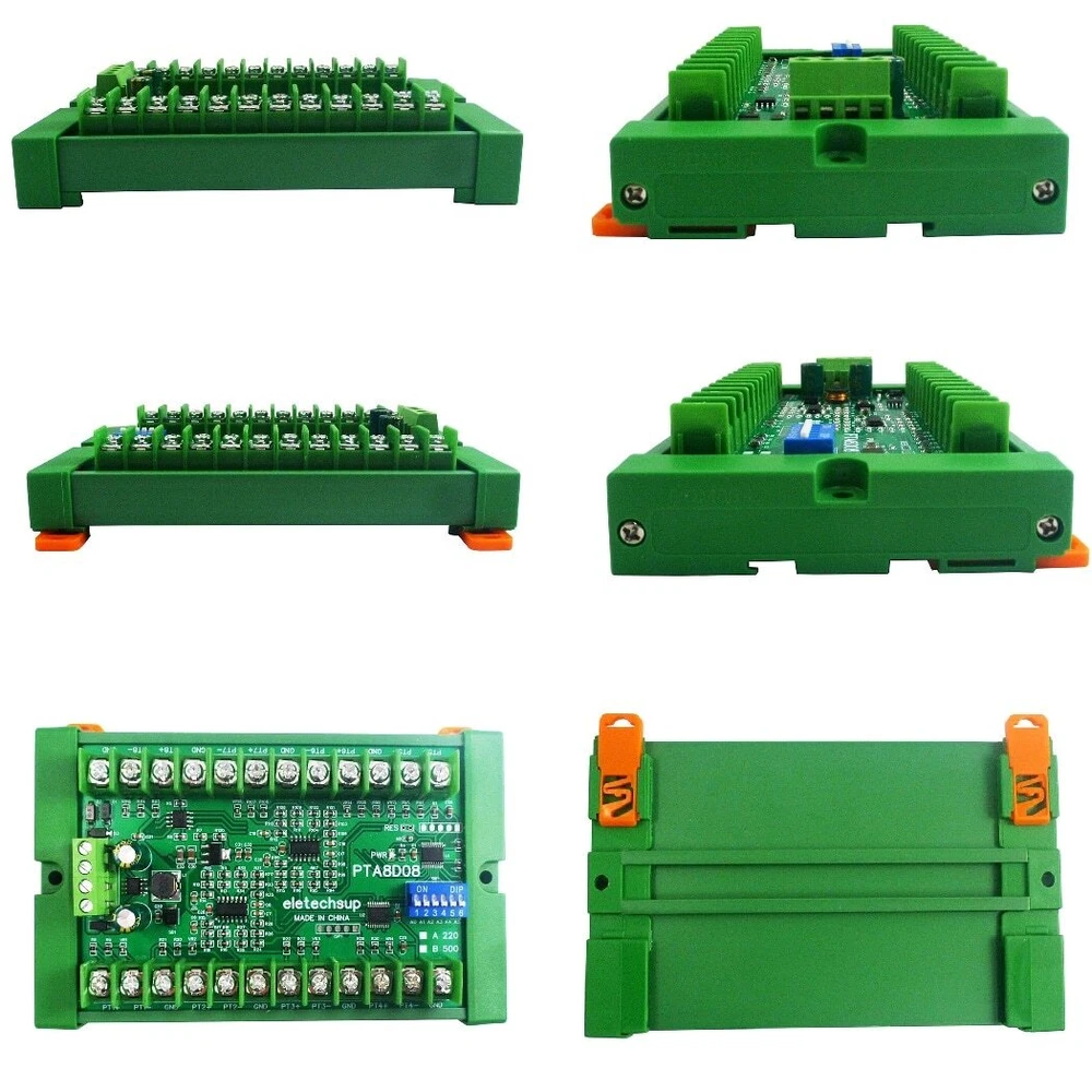 Product Name: 8ch DC 8-30V PT100 RTD RS485 Temperature Sensor Module Modbus RTU Platinum Thermal Resistance Collector -40~500C Packing list: ( Please select the product you need ): 1 PCS PTA8D08 8ch PT100 RS485 Acquisition module Description : PTA8D08 PT100 RS485 Acquisition module Description: Working voltage: DC 8~30V Working current: 14-25MA MODBUS RTU protocol, 03 read command, 06 or 16 write command. Serial port baud rate: 9600 (default), N, 8, 1 By modifying the 485 address, up to 247 modules can be cascaded (more than 16 please use R485 repeater) Can read temperature and PT100 resistance value Adapted sensor: PT100 3-wire or 2-wire sensor Temperature measurement range: A version -40℃ to +220℃; B version -40℃ to +500℃. It is recommended to select a version with a smaller range within the range that meets the measurement. Temperature measurement accuracy: 1%. Size: 136 X 92 X 32MM Weight: 166g MODBUS RTU protocol please refer to : ''PTA8D08 8CH PT100 RS485 sensor protocol'' PT100 sensor specifications(Type A): Type: PT100 Probe Diameter: 6.5mm Probe Length: 30mm Probe Material : Stainless steel Cable Length: 0.5M PTFE sheath 3-Wire type Temperature -200~550°C degree Nominal accuracy : 0.1% PT100 sensor specifications(Type B): Type: PT100 Probe Diameter: 4mm Probe Length: 30mm Probe Material : Stainless steel Cable Length: 0.5M PTFE sheath 3-Wire type Temperature -50~200°C degree Nominal accuracy : 0.3% DIN rail Box parameters: Product model: UM80 Color: Green Width: suitable for PCB board width UM80(80mm) Insulation grade: flame-retardant VO grade Backplane length: suitable for 117 mm PCB boards Net weight: 89g Installation: DIN35 and C45 rail For more information, please contact us!!! Typical application: Thermostatic Controls Industrial Systems Consumer Products Thermally Sensitive Systems Measuring instruments Indoor and outdoor temperature measurement Temperature in vegetable garden Weather forecasting, and monitoring Temperature in Computer Room Warehouse temperature 3-wire probe wiring mode: the red wire is connected to P+, and the other two wires of the same color are connected to P- and GND (the ports are not distinguished). 2-wire probe wiring mode: red wire connects to P+, blue wire connects to P- and G. RS485 bus wiring diagram: