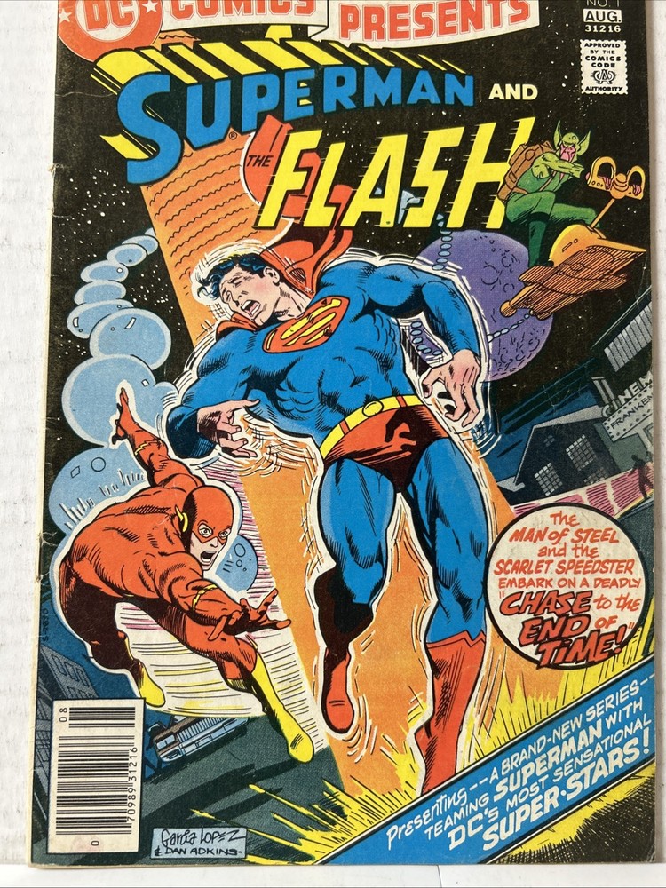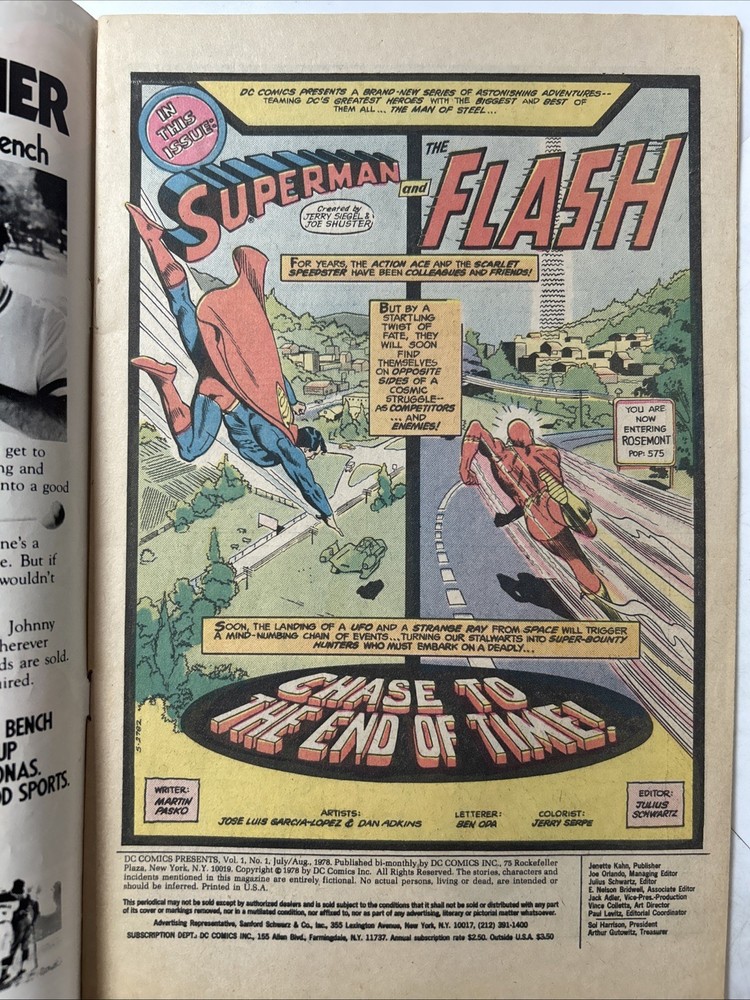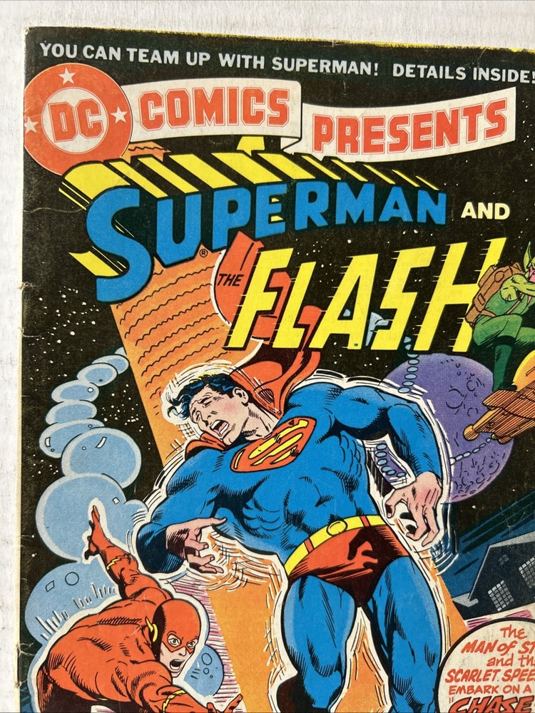 Key First Issue of the Series The product is a DC Comics Presents #1 comic book from 1978, featuring a classic 4th Superman/Flash race storyline. This Bronze Age comic from US Comics showcases the iconic characters Superman and The Flash in an action-packed adventure, published by DC Comics. With a rich history and esteemed publisher, this collectible comic is a must-have for any comic book enthusiast or collector looking to add a piece of comic book history to their collection. Fine 6.0 Bagged and boarded
