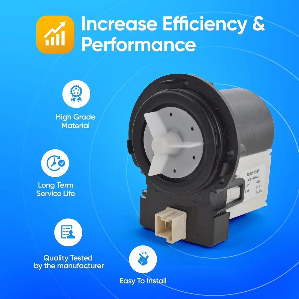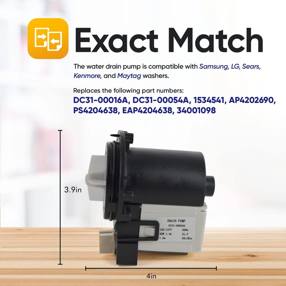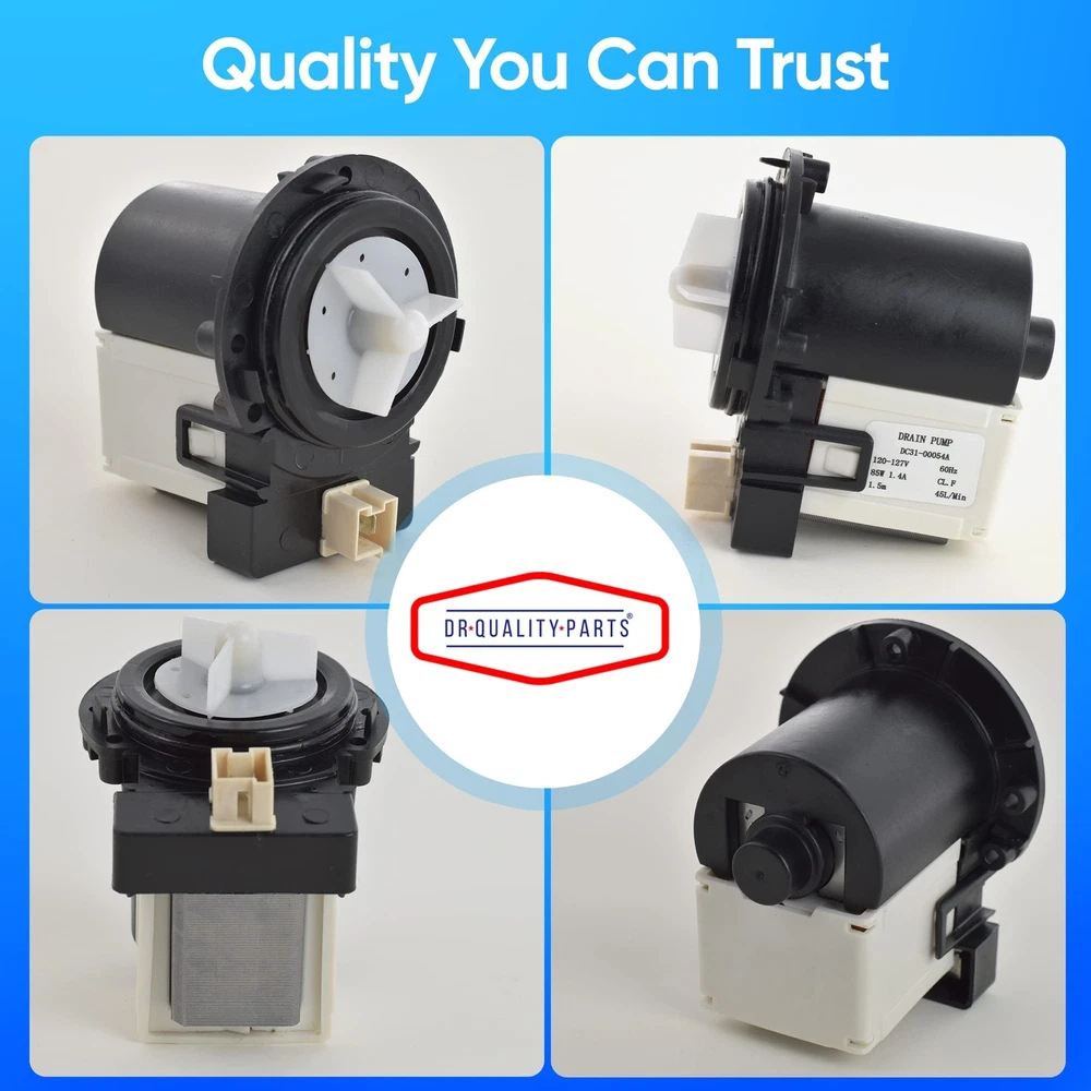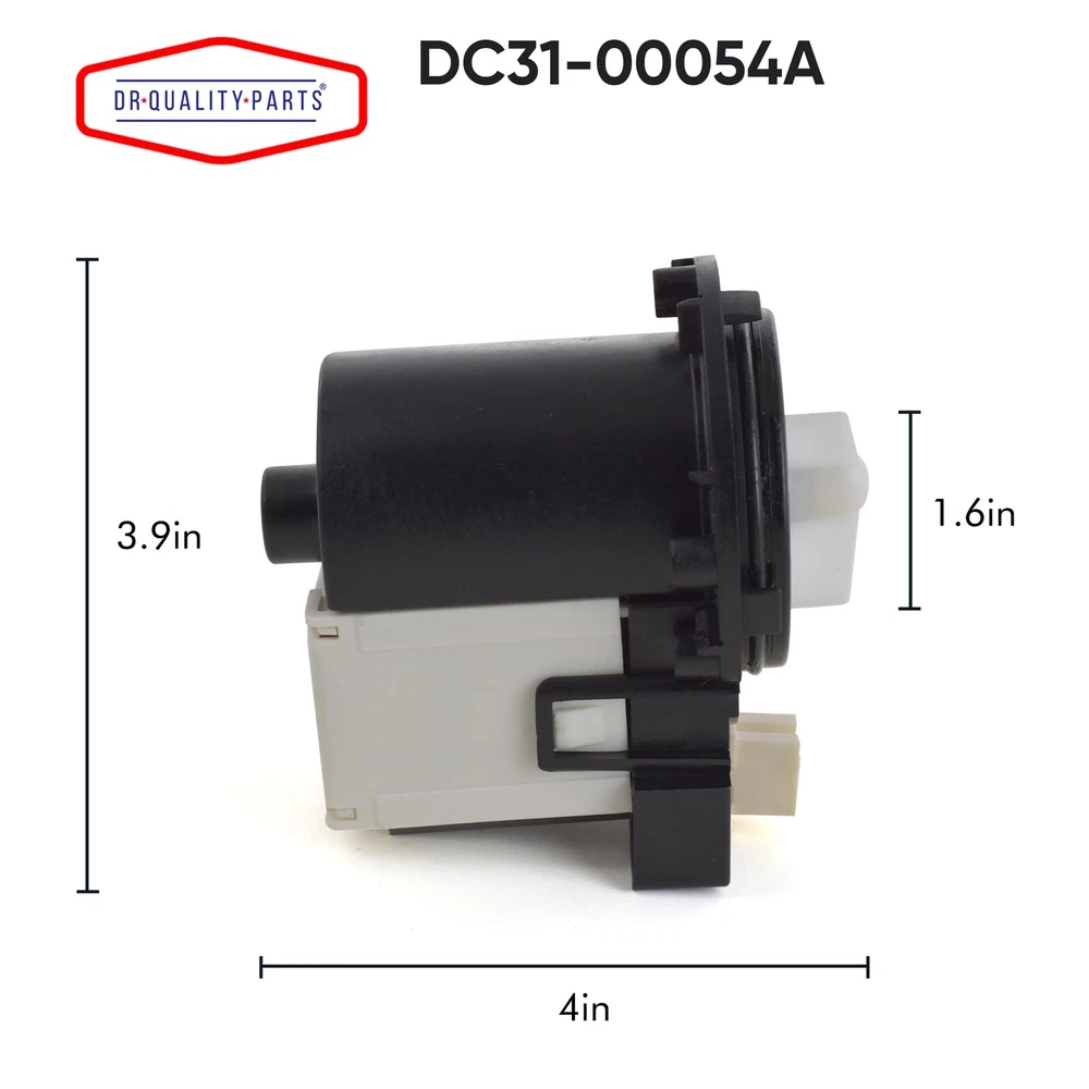 DC31-00054A Washer Drain Pump Water Motor Assembly Replacement Part for Samsung Maytag Kenmore - Replaces DC31-00016A PS4204638 AP4202690 62902090 Product Details Brand: DR Quality Parts Style: Drain Pump Power Source: Ac/dc Manufacturer: DR Quality Parts Brand Name: DR Quality Parts Item Weight: 1.63 pounds Package Dimensions: 4.96 x 4.33 x 3.74 inches Batteries Included?: No Batteries Required?: No Date First Available: August 20, 2021 DC31-00054A Washer Drain Pump Water Motor Assembly - Replaces the following part DC31-00016A, DC3100054A, 1534541, AP4202690, PS4204638, EAP4204638, 34001098 EXACT MATCH: Washer Drain Pump is compatible with Samsung, Kenmore, LG FIXES NO DRAIN ISSUES: Will not drain, pumps but no spin, noisy, leaks. EASY TO INSTALL: Made to EXACTLY FIT just as the original drain pump without any modifications for a fast and easy install. Save money and time buying direct today. SHOP WITH CONFIDENCE - DR Quality Parts adheres to providing all customers with a simple, streamlined shopping experience for appliance replacement parts, and prove that we have the highest quality parts and service out there. We stand by our products, and our customers are our focus as a business. If you have any quality problems or need help diagnosing issues, please contact DRQP customer service team, and we will try our best to solve your problems