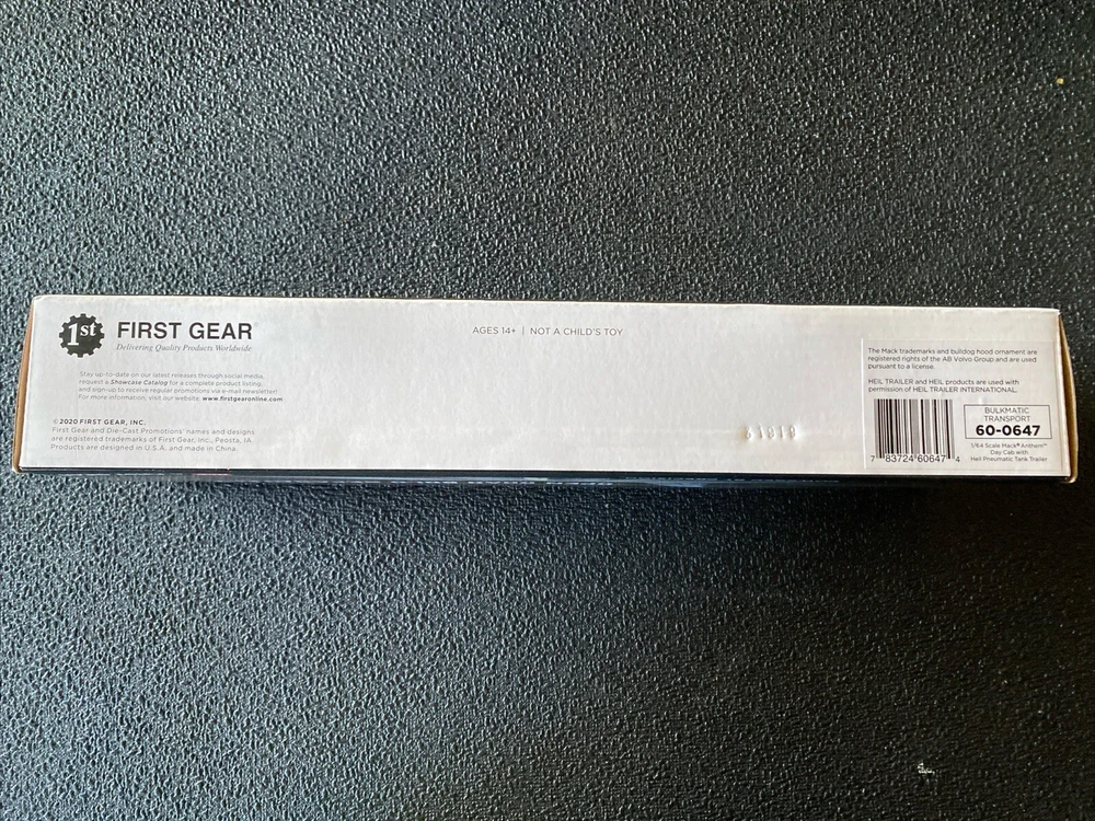 Brand new 16 4 scale diecast model of Mack Anthem Day Cab with Heil Pneumatic Tank Trailer Bulkmatic Transport Company White and Chrome die cast model by DCP/First Gear Features * Real rubber tires * Pivoting fifth-wheel * Diecast metal replica * Detailed undercarriage * Detailed interior, exterior * Functioning trailer landing gear * Made of diecast with some plastic parts * Opening hood with authentic engine detail * Dimensions approximately L-1125, W-2 H-2 inches Specifications * Color: White & Chrome Possible minor wear from storage on box.