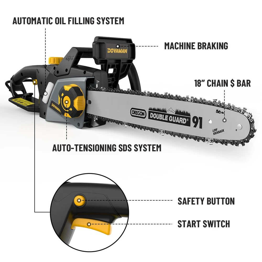 This electric chainsaw features a powerful 15-amp motor with a chain speed of 49.21 ft/s, making it efficient for cutting trees and sawing wood. Its 18-inch Oregon low-kickback guide bar can handle wood up to 17 inches thick and comes with two replacement chains. The SDS Auto-Tension System allows tool-free chain adjustments, while dual safety switches and a mechanical brake enhance safety. Additionally, an automatic oiler reduces friction and extends chain life, and a transparent oil tank lets you easily monitor oil levels. Efficient Cutting: The electric chainsaw features a powerful 15-amp motor and a high chain speed of 49.21 ft/sec, making it easy to cut through various types of hardwood with ease. Oregon Components: Chainsaw is equipped with a high-quality 18-inch OREGON guide bar and chain. OREGON components offer better wear resistance, reduced vibration, and longer service life. An extra chain is included for added convenience. Tool-Free Tensioning: The 18-inch chainsaw is equipped with an automatic chain tensioning system, allowing for quick and easy one-step adjustment by rotating the SDS knob without the need for tools. Once the SDS knob is fully tightened, it ensures optimal chain tension is maintained. Safety Features: Includes a safety switch and mechanical brake with a fast 0.12-second response time. Steel bumper spikes improve stability during cutting, and the safety switch prevents accidental start-up. Automatic Oiling System: The built-in oiler keeps the bar and chain lubricated, reducing friction and extending lifespan. A transparent oil tank lets you easily check the oil level. What You Get: 1× Electric chainsaw, 1× 18" OREGON guide bar, 2× Chains, 1× Bar cover, 1× User manual. For any questions, contact us and we'll provide excellent after-sales service within 24 hours. Note: Do not cut materials larger than 17 inches in diameter, and avoid pushing the tip of the guide bar into the material. Fully tighten the SDS knob and release the chain brake before starting. Before first use, add lubricating oil and run the chainsaw unloaded for 30 seconds to ensure full lubrication.