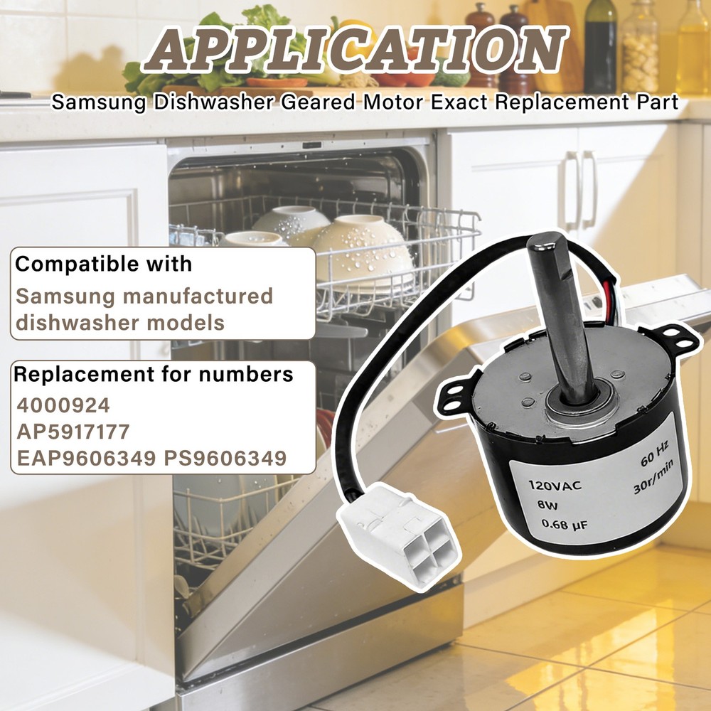 Suitable For: Dishwasher, Samsung Dishwasher Compatible Model: Samsung Dishwasher Type: Dishwasher Geared Motor Brand: Great-parts1 Compatible Brand: Samsung Dishwasher gtin13: Does not apply MPN: DD31 - 00013B, DD62 - 00053A UPC: Does not apply