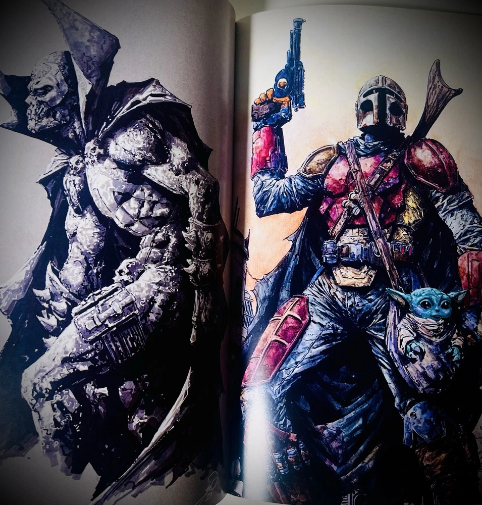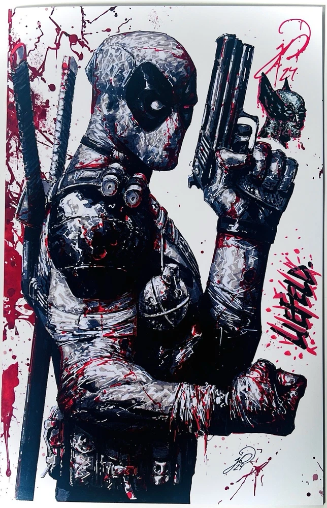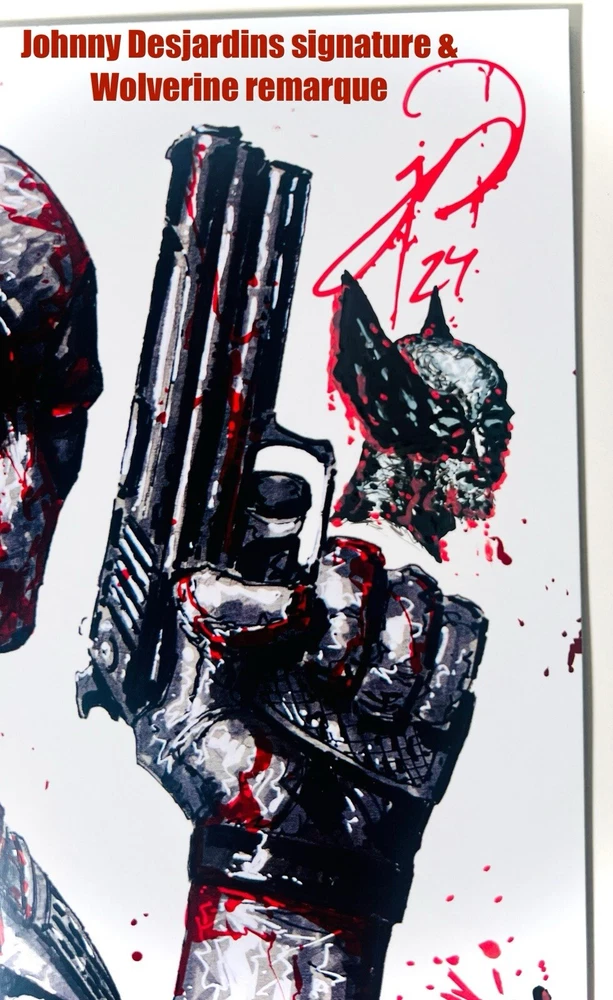 The product is a limited edition Deadpool sketchbook featuring artwork by illustrator Johnny Desjardins. This exclusive item was signed by both Johnny Desjardins and Rob Liefeld at San Diego Comic Con, adding to its rarity. The sketchbook contains a spot foil design and includes a remarqued drawing, making it a unique and valuable piece for collectors of original comic art from the Marvel universe. Released at SDCC 24’, and limited to just 75 copies, this popular sketchbook sold out very quickly. The “Bloody” Spot Foil by Desjardins includes several pages of Johnny’s amazing artwork, depicting a number of heroes, villains, and misc characters that he has been commissioned to draw/sketch at some point in his career. What makes this particular copy unique, it has been signed by Desjardins in a blood drip variations in of his signature , and he’s added a cool remarque of Wolverine as well (this sketchbook released during the buildup to the immensely successful Deadpool VS Wolverine movie). And this copy has also been signed by the legendary Rob Liefeld, renowned comic artist and creator of the Deadpool character. You can see Liefeld’s custom “bloody chisel” signature on the right side of the cover. Add this to your collection today! No COA