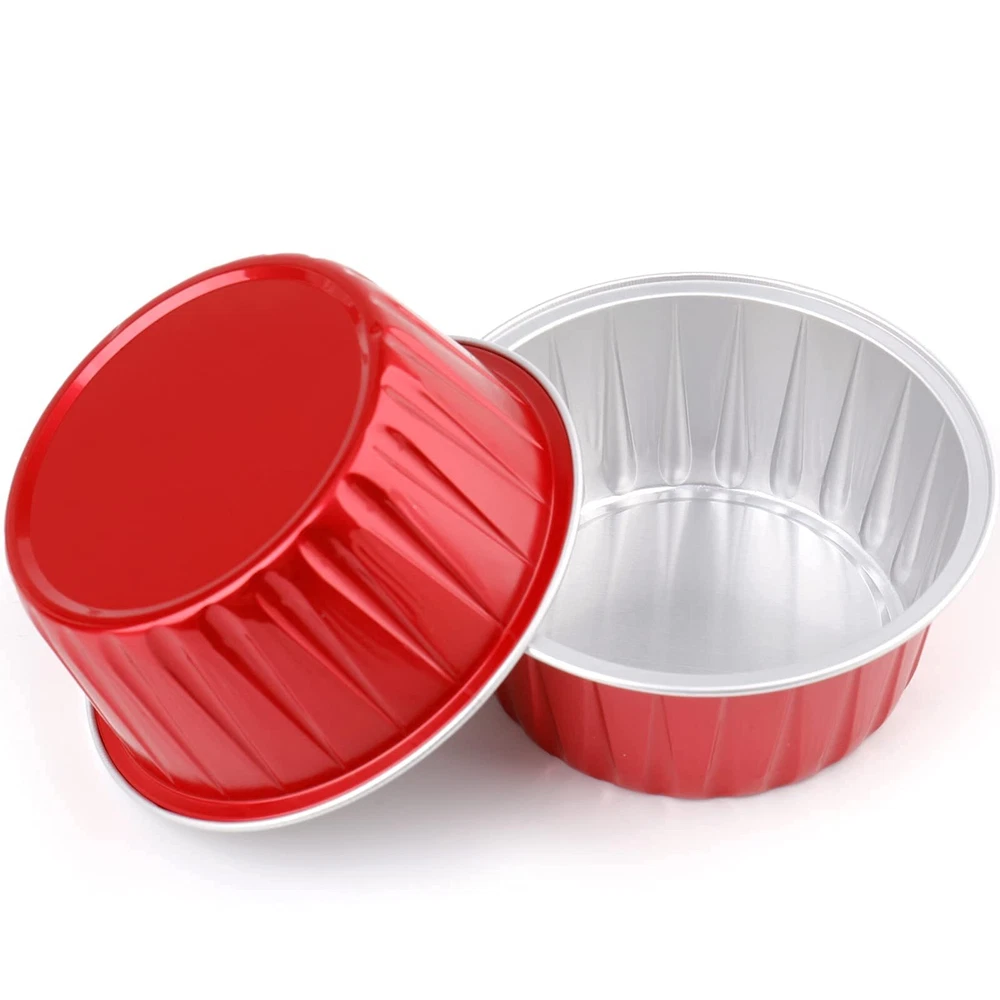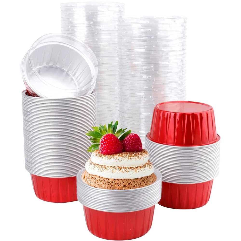 You will receive 100 packs round disposable ramekins in red color with matching clear lids, which will surely meet your different needs and make food service quick and easy. Product measures approx. 3" top diameter x 2.4" bottom diameter x 1.4" height, with maximum capacity of 5 oz Our recyclable baking cups are made of premium food-thick aluminum foil, sturdy and stable. They are faster heat conduction, waterproof and oil proof, can withstand temperatures up to 500 Fahrenheit. The plastic lids in the set can facilitate you to carry the cupcakes out DEAYOU aluminum foil ramekins are perfect for making cupcakes, cheese, puddings, souffle, creme brulee, custard, sweets, tarts, pies and more. Just put them into the oven and bake them directly without baking tray required. Simply use and discard or recycle. They are also freezer safe, suitable for storing food, meal prep These disposable muffin cups are ideal for picnic, camping, weddings, anniversaries, afternoon tea, banquet desserts, parties, get-together, various indoor and outdoor occasions. They are baking molds and also the gorgeous packing, widely used by home kitchen, restaurants, bakeries, caterers, cafes, food trucks Our cupcake baking liners can free your hand from scrubbing the residue on bake pans, save your much cleaning time, just throw away once finished and enjoy your baking time. The smooth surface makes them comfortable to hold. They are stackable for space-saving, perfect for a party or when baking a large batch