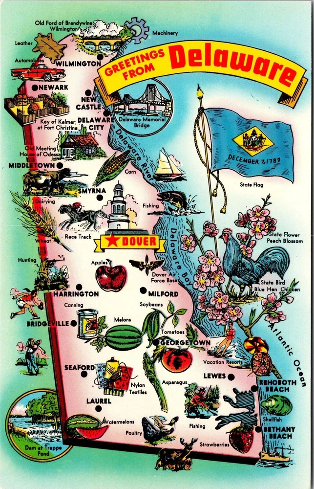 DE-Delaware, Scenic Landmark Map Greetings, Vintage Postcard