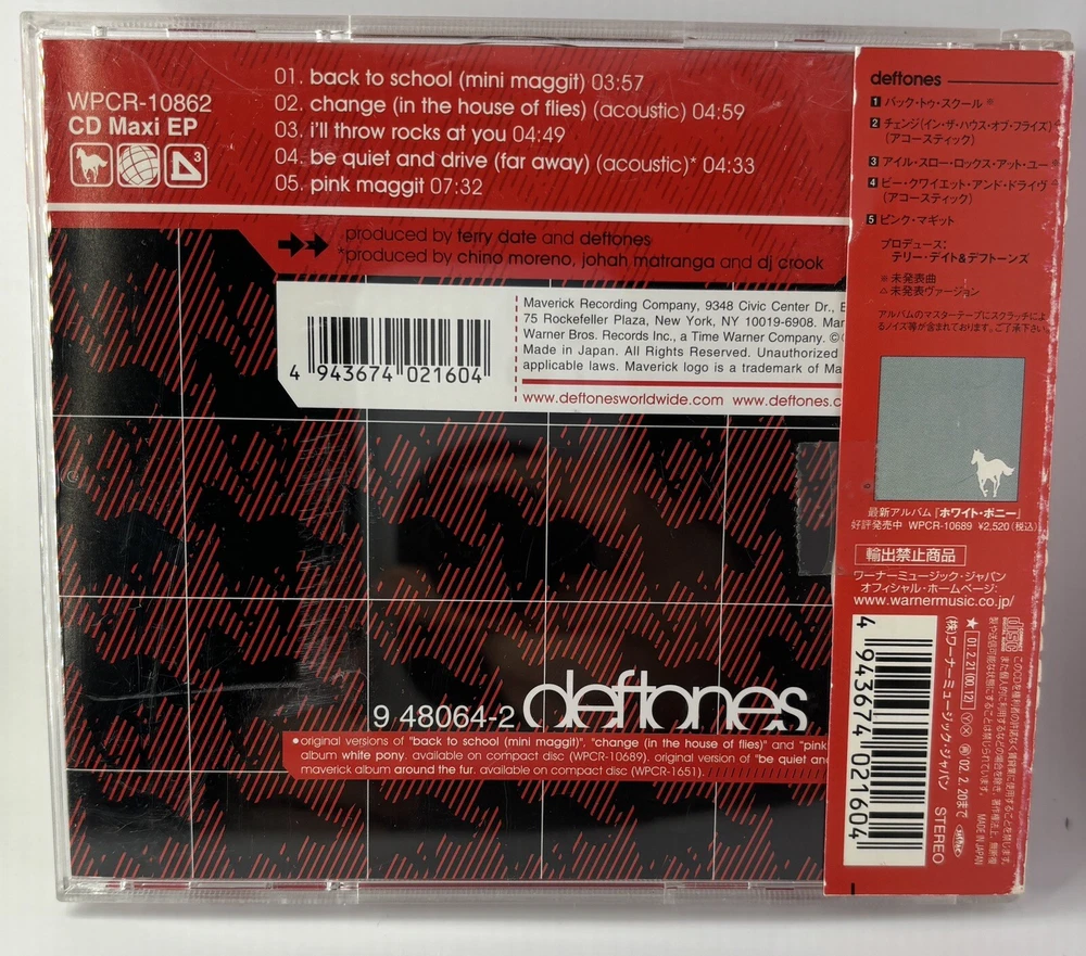 This is the Deftones "Back to School (Mini Maggit)" CD from Japan, featuring 5 tracks and including the obi strip and booklet. The Deftones are a well-known alternative metal band, and this CD is a great addition to any collection. Don't miss out on the chance to own this rare CD from Japan. The CD is in mint condition.The booklets and cover art are in excellent conditionThe case is in good condition, with some scratches Thank you for looking!
