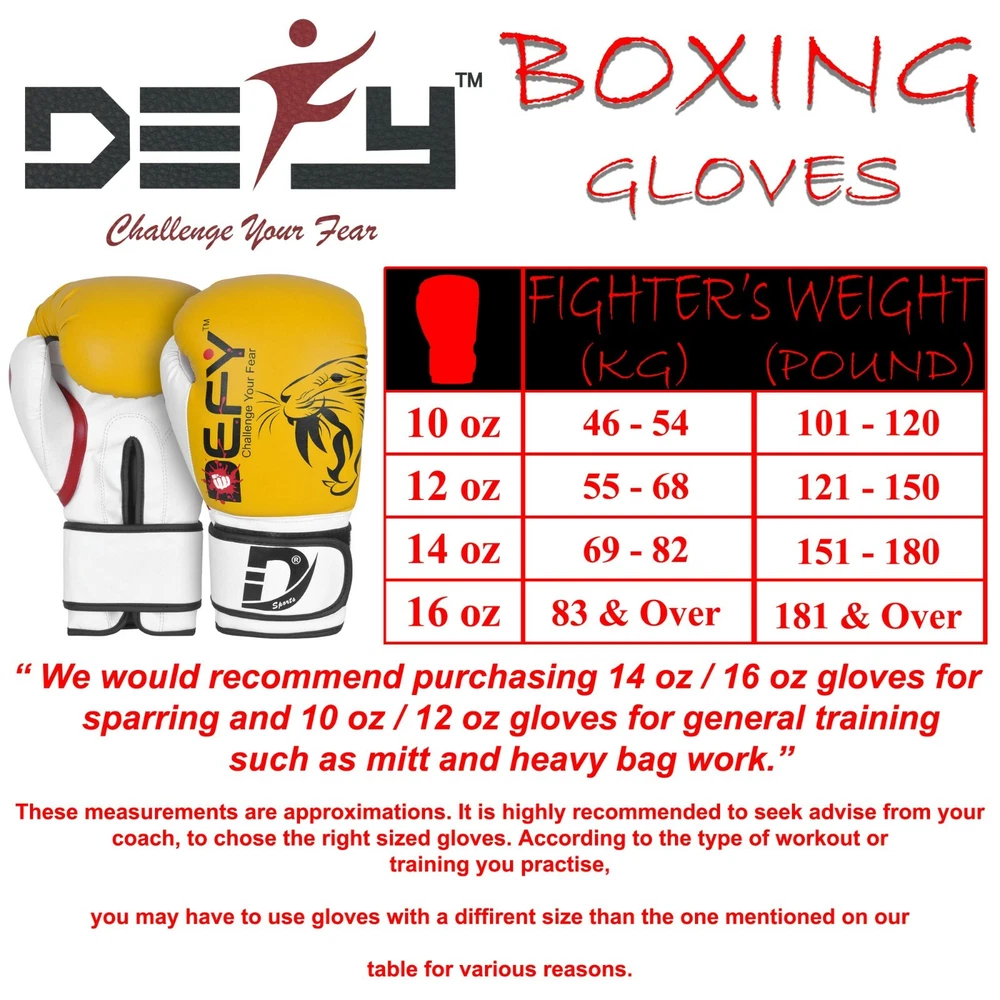 Description: DEFY Boxing Gloves Leather Art Punch Training Kickboxing MMA Fight UFC Yellow tiger This is a Pair of Brand New DEFY Pro Boxing Gloves for Professionals. These Boxing Gloves are made from Art Leather with Advance Tech Layers of Gel integrated padding that allows heavy shock dispersion. Another feature that makes these gloves outstanding is the adjustable wraparound wrist strap closing system for best support. The Injected Molded Foam padding system envelopes the fist in a 2 " thick, shock-absorbing shell of protection, while the special foam composition provides a broken-in feel straight out of the box. Key Features: • Professional and Ultra Successful Quality Boxing Gloves • Ideal for all Boxing, Martial Arts, Kickboxing and Cardio Fitness Workouts. • There is a Wraparound Wrist Strap Closing System • 8oz, 10 oz., 12 oz., 14 oz., 16 oz. • 100% Quality Satisfaction. • Excellent Value for Money. Size: 10 oz., 12 oz., 14 oz., 16 oz. Terms & Conditions: Buyers are requested to read Company Terms & Conditions before buying product to avoid any miscommunication. When you are purchasing a product, it means you are also agreeing to Terms & Conditions of company. Please include the following Information at the time of making your payment via bank or internet banking - Your eBay ID We accept PayPal Only We contact our buyer if any information requires, via email within 24 hours after cart checkout. Successful Buyers must complete the sale transaction within 7 working days from the date of receipt email notification or invoice. On Completion of the sale transaction buyer shall get one confirmation email from us, which should be kept for any further communication. Item descriptions are provided in best of our knowledge. Sale which is once done is taken as final. Refunds are subject for consideration if product is not at fault. Shipping & Returns: We value our customer satisfaction, so we ship our products within 1 to 2 days after the payment has been done- however we ask customer to allow us to ship products within 7 days in some exceptions. Most of the consignments are delivered within 2 to 5 working days. In some cases delivery may take 10 days. In case undelivered items we request our valuable customer to contact us before leaving any negative or neutral feedback as positive feedback is very important for us. We also offer combine shipping, for combine shipping inquiry we request our valued customer to contact us through eBay message service. We request our customer to contact us within 14 days to return products in case of damage or faulty product. As we are always happy to solve the problems to avoid the complications. About Us: DEFY SPORTS™ is an American specialist Weight Lifting, Sports, MMA, UFC and fitness accessories company. We are able to supply you with superior products like weight lifting gloves, belts, MMA shorts, Sauna Suits etc. Our online store can service you anywhere in USA and outside America. We stock only the best quality fitness equipment and gym accessories at the best possible price. Our range includes both domestic and commercial fitness equipment. Best possible products and customer satisfaction is the first two priorities of our company. For the bulk inquiries please contact us through eBay message. Contact Us: For any inquiries regarding purchase or products please feel free to contact us through eBay message service and we will respond to you as soon as possible. All of our products listed within the eBay store of DEFY To search any particular product search with the name of product starting with DEFY.